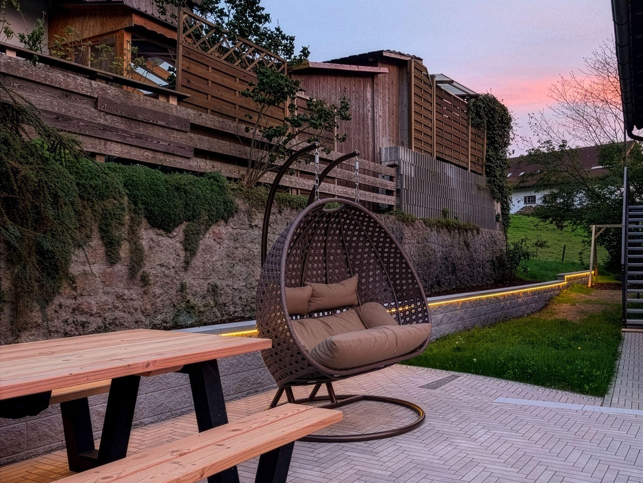 Den Gästen beider Ferienwohnungen steht die gemütliche Terrasse zur Verfügung, die zum Verweilen und Entspannen einlädt. Dort erwarten euch ein großer Picknicktisch für gemeinsame Mahlzeiten im Freien und ein bequemer Hängesessel für zwei Personen – perfekt, um die frische Bergluft und die ruhige Atmosphäre zu genießen. Die Ferienwohnungen befinden sich im selben Haus und ihr könnt bei uns mit bis zu 8 Personen Urlaub machen.
