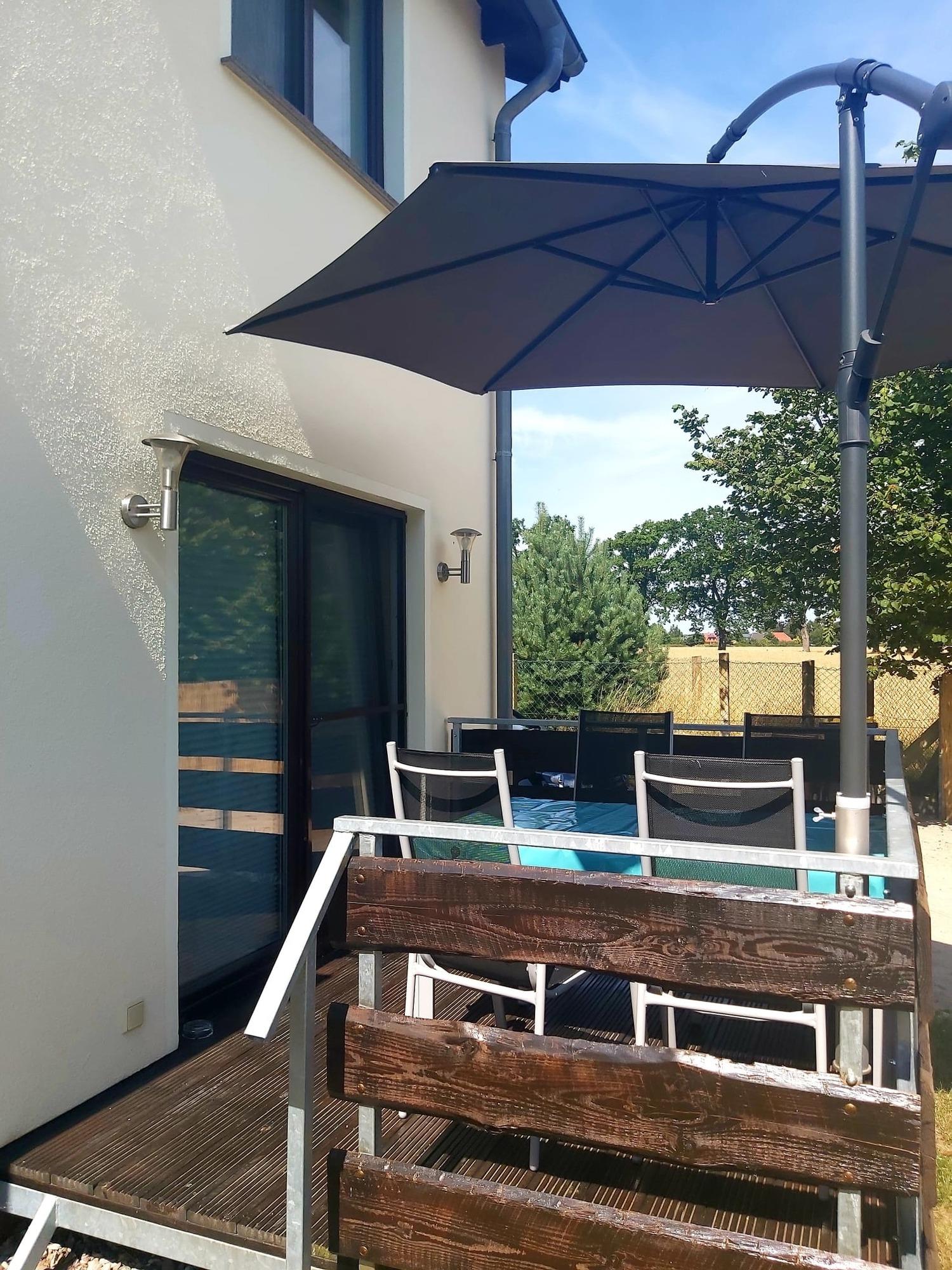 Terasse mit Gartenmöbeln . Zwei PKW-Stellplätze ,Bäcker im Ort und zahlreiche Einkaufsmöglichkeiten in der näheren Umgebung .