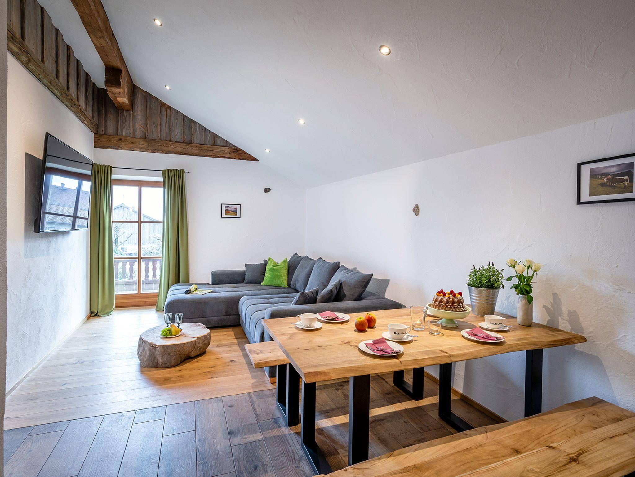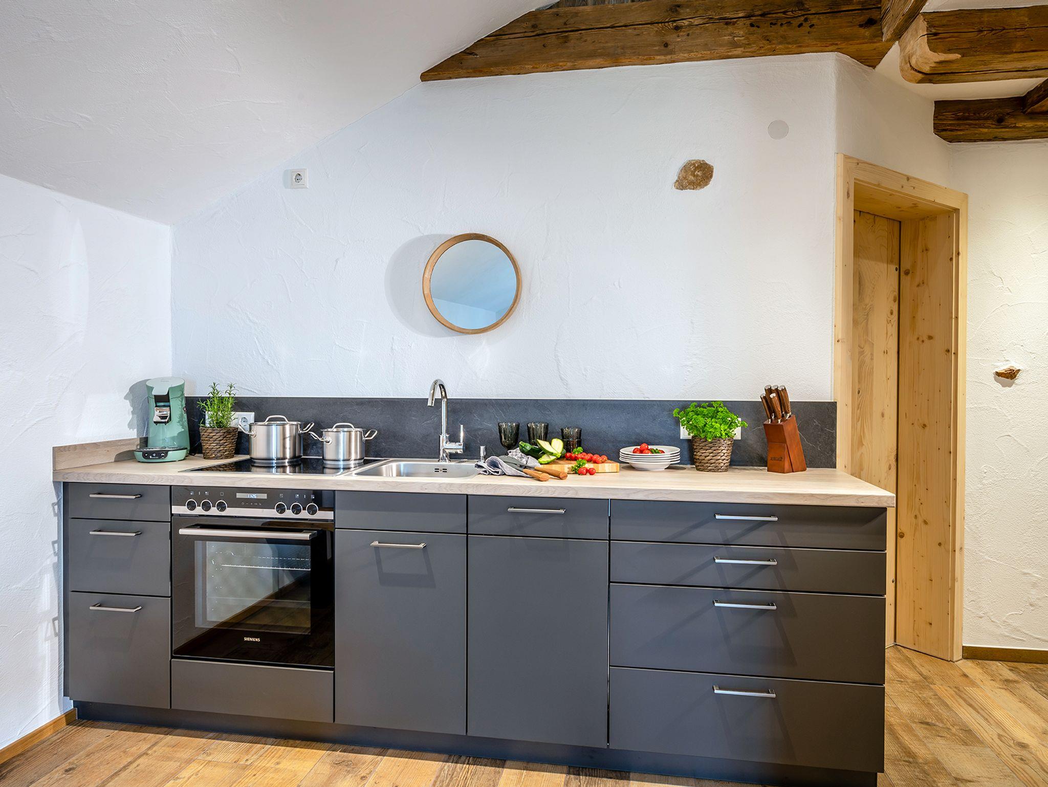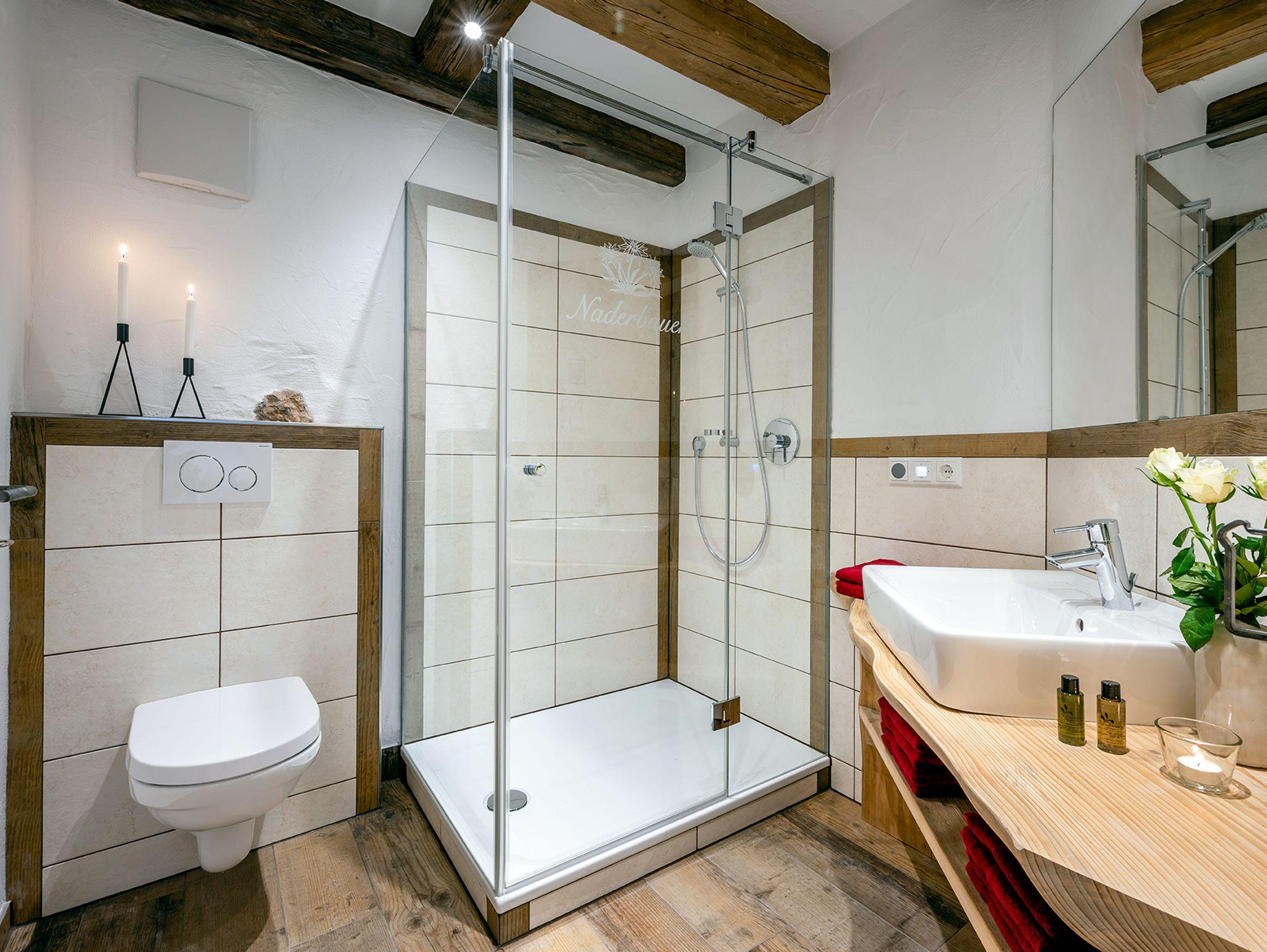 Auf 80 Quadratmetern findet sich in der Ferienwohnung Kirschbaum modernster Komfort, der keine Wünsche offen lässt. Die Ferienwohnung Kirschbaum liegt im Bauernhaus und erstreckt sich im ersten und zweiten Stockwerk. Der Blick vom Balkon lässt dich direkt in die Welt der umliegenden Berge eintauchen. Die Nichtraucher-Ferienwohnung ist mit einer Fußbodenheizung ausgestattet. In den zwei separaten Schlafzimmern und dem gemütlichen Wohn- und Essbereich mit angrenzender Küche können sich bis zu vier Personen richtig wohlfühlen und den Urlaub auf dem Naderbauer-Hof in vollen Zügen genießen. Dezente Lichtelemente betonen das offene Wohnkonzept und sorgen in den Abendstunden für zusätzliche Gemütlichkeit. Die durchdachte Raumaufteilung, heimisches Holz, maßgeschreinerte Möbel und geschmackvolle Stoffe schenken der Ferienwohnung Kirschbaum einen heimelig-modernen Charme mit dem gewissen Extra. Das ist Urlaub auf dem Bauernhof, ohne auf gewohnten Komfort verzichten zu müssen.