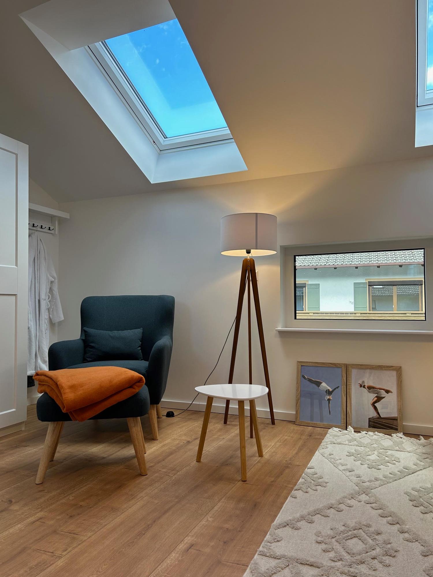 Im geräumigen Wohnzimmer finden Sie nicht nur einen geräumiges Sofa und Schlafsessel zum Entspannen, sondern auch einen großen Esstisch für gesellige Abende. Der gesamte Wohnbereich verfügt über eine Fußbodenheizung und Lüftungsanlage. Die gesamte Haustechnik ist auf dem neuesten Stand. Im Untergeschoss erwartet Sie ein Saunabereich mit Dusche sowie eine Waschmaschine und Trockner für Ihren Komfort.