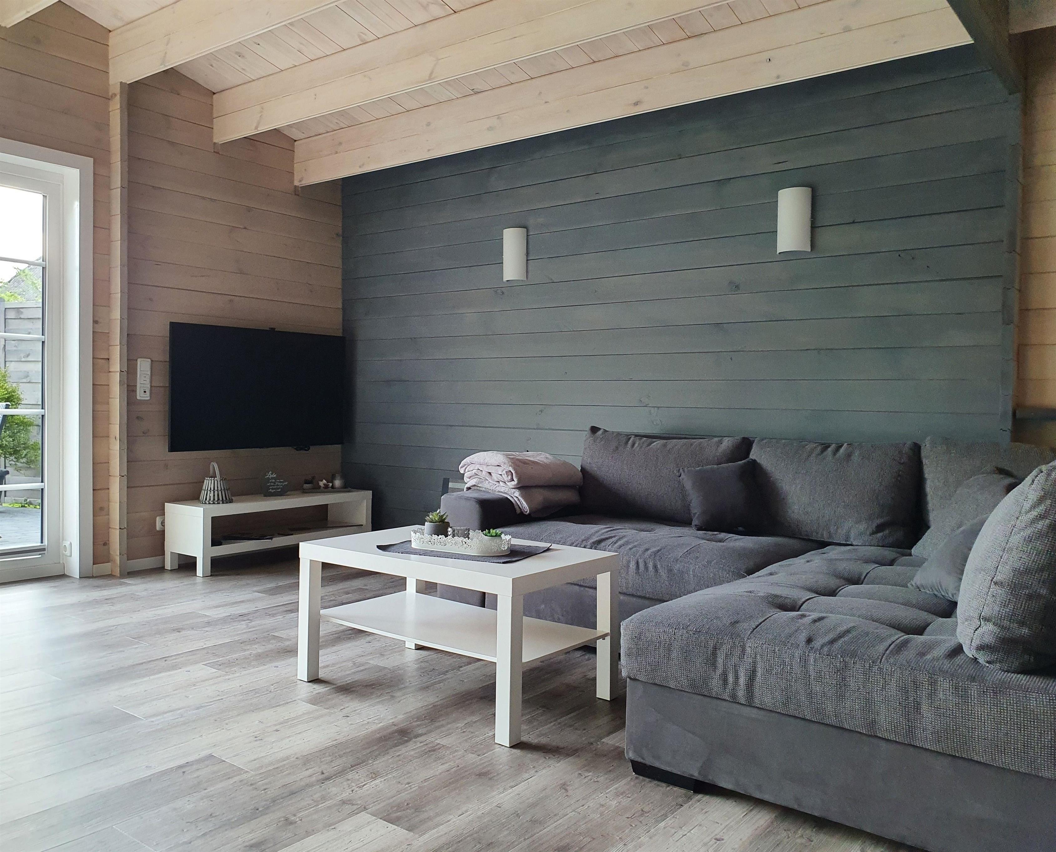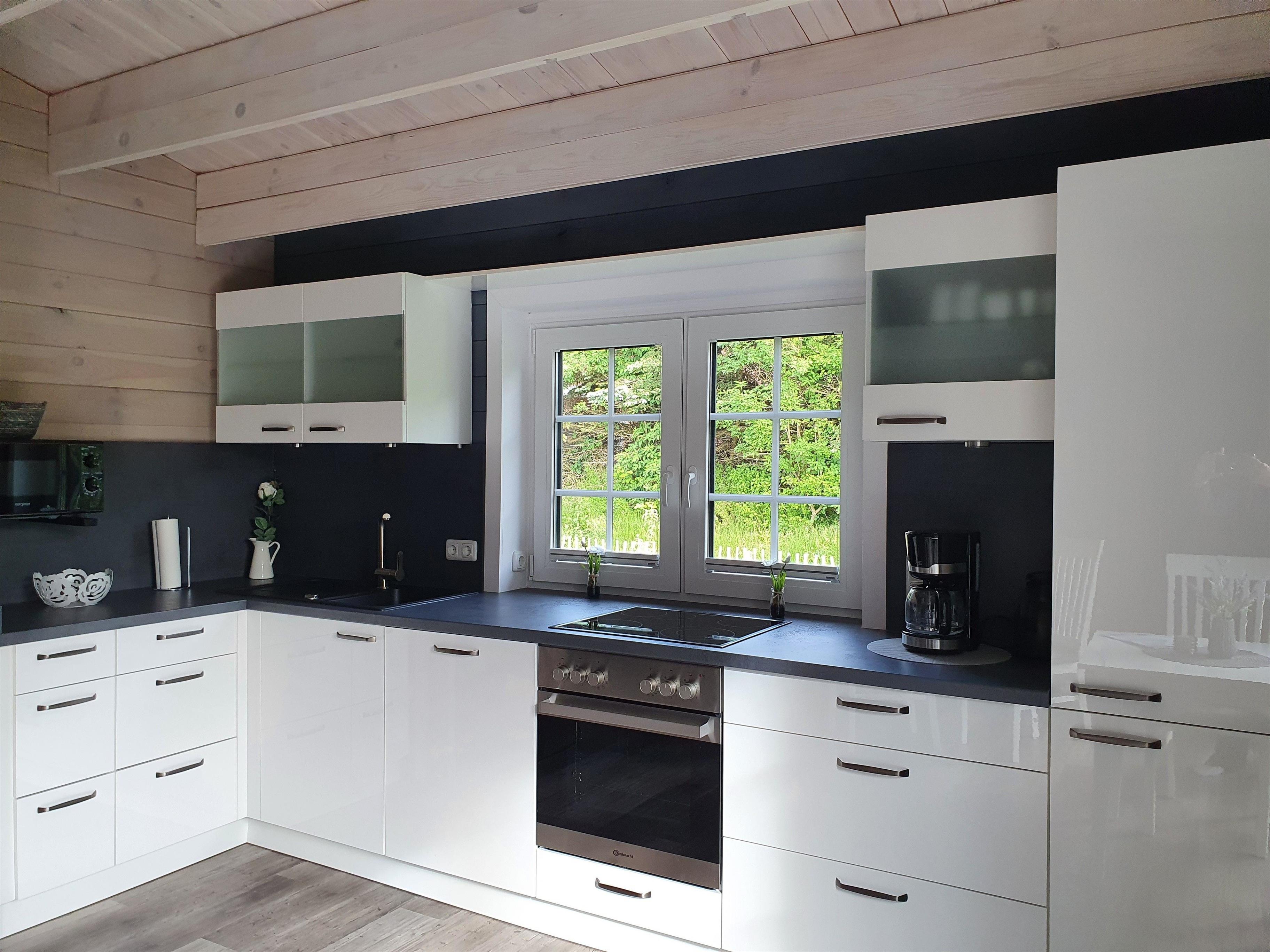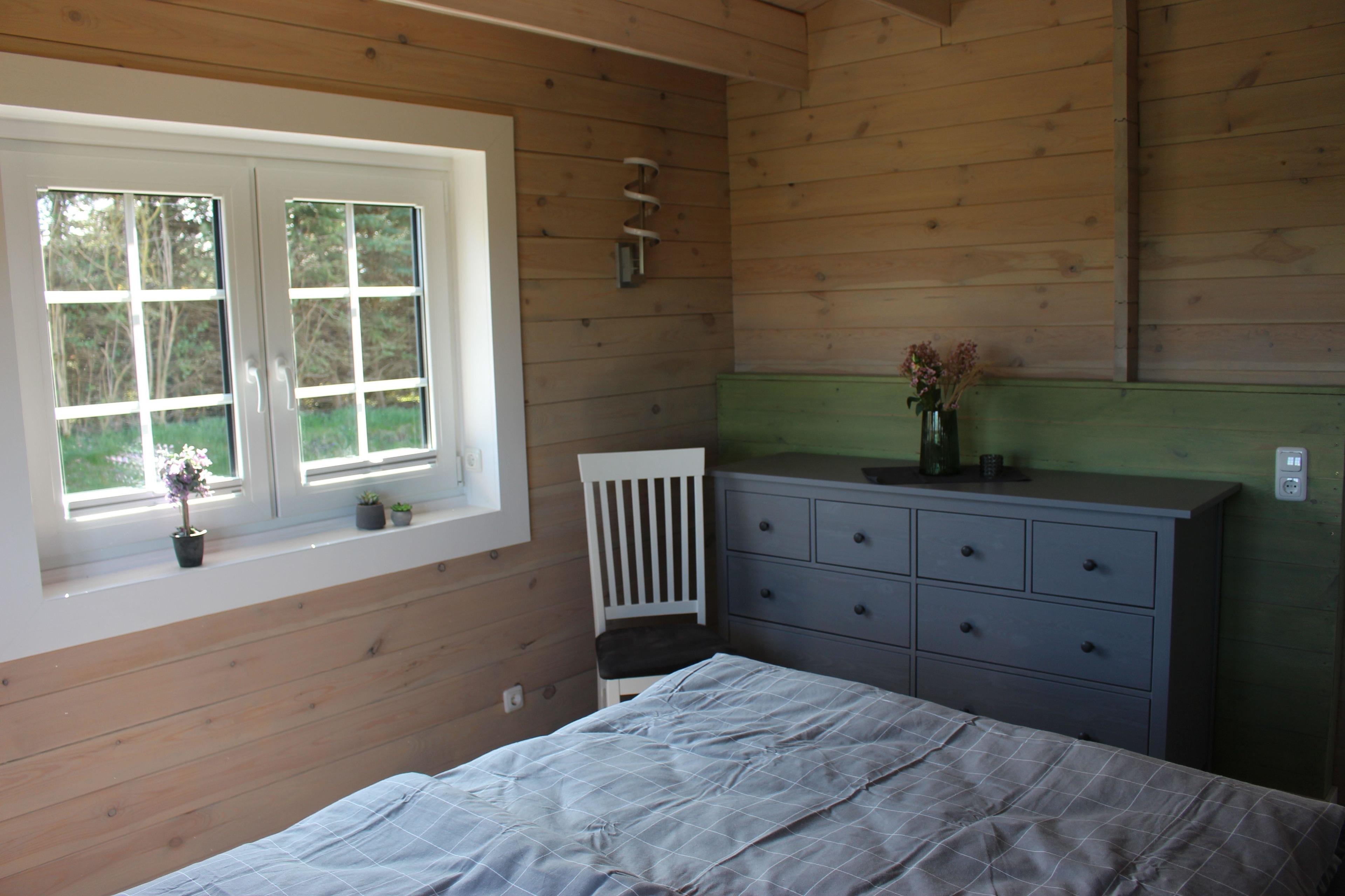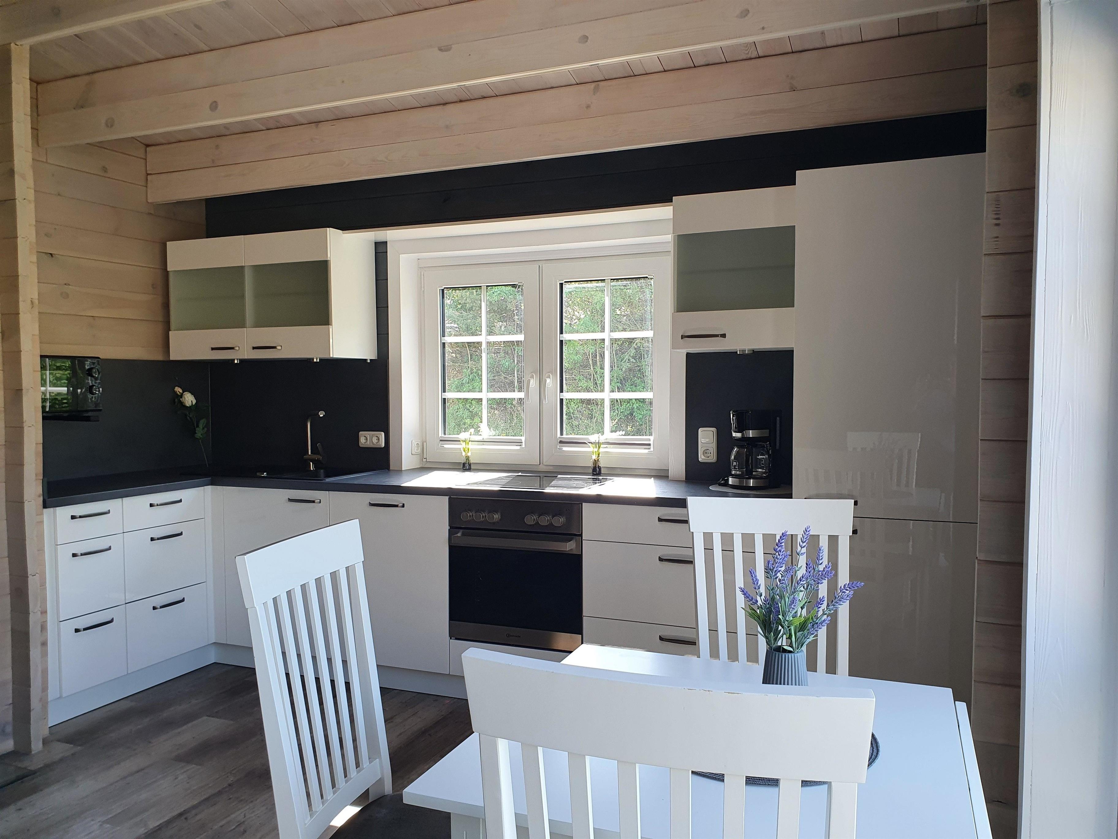 Das neu gebaute und komplett neu eingerichtete Blockbohlenhaus bietet ein Schlafzimmer mit einem elektr. verstellbaren Boxspringbett (180 x 200cm ) und einem Smart TV. Die großzügige Couch kann nicht nur zum Entspannen genutzt werden, sondern ganz einfach auch zu zwei Schlafplätzen umfunktioniert werden. Ebenfalls befindet sich ein Esstisch für 2 Personen mit Blick zum Garten im Wohnbereich. Die neue vollausgestattete Küche ist unter anderem mit Mikrowelle, Wasserkocher, Kaffee- und Spülmaschine ausgestattet. Zum Wohlfühlen befindet sich im Wohnbereich ein Kaminofen, der für gemütliche Abende sorgt. Das Badezimmer verfügt über eine Walk-In Dusche, WC, Waschbecken und Waschmaschine. Das besondere Flair ist die großzügige Sauna mit Glasfront und Blick über die Wiesen und Felder, die sich ebenfalls im Badezimmer befindet.