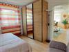 Im Schlafzimmer erholen sie sich auf einem 1,80m breiten Doppelbett. Die beiden Nachttische mit LED Licht haben eine Ablage- und USB-C Lademöglichkeit. Ein großer Kleiderschrank mit Spiegel steht direkt gegenüber.