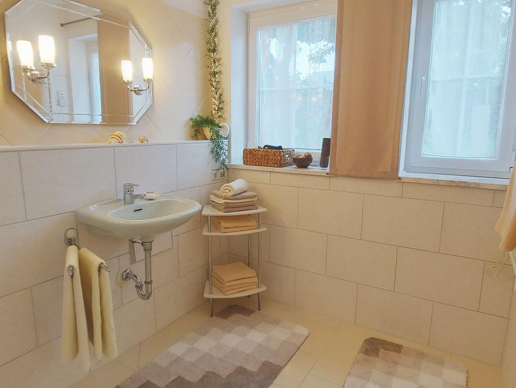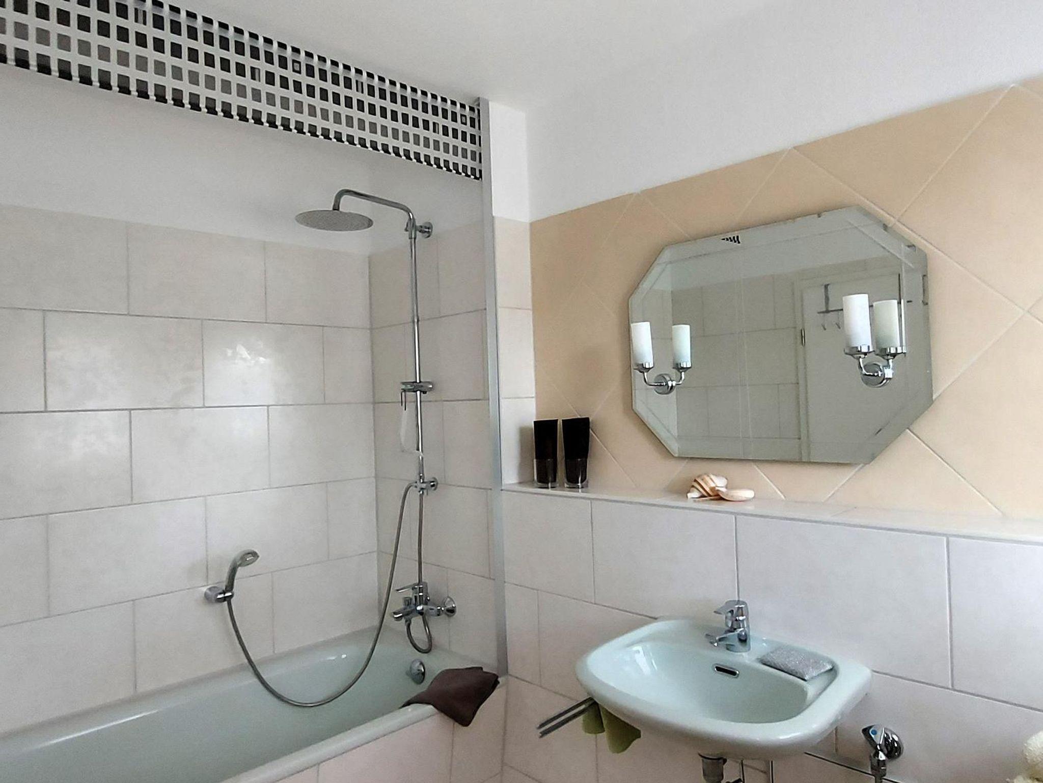 Im angrenzenden Badezimmer warten eine wohltemperierte Fußbodenheizung und eine Badewanne mit Regendusche auf ihren Besuch. Das separat gelegene WC ist von der Diele aus zugänglich.
