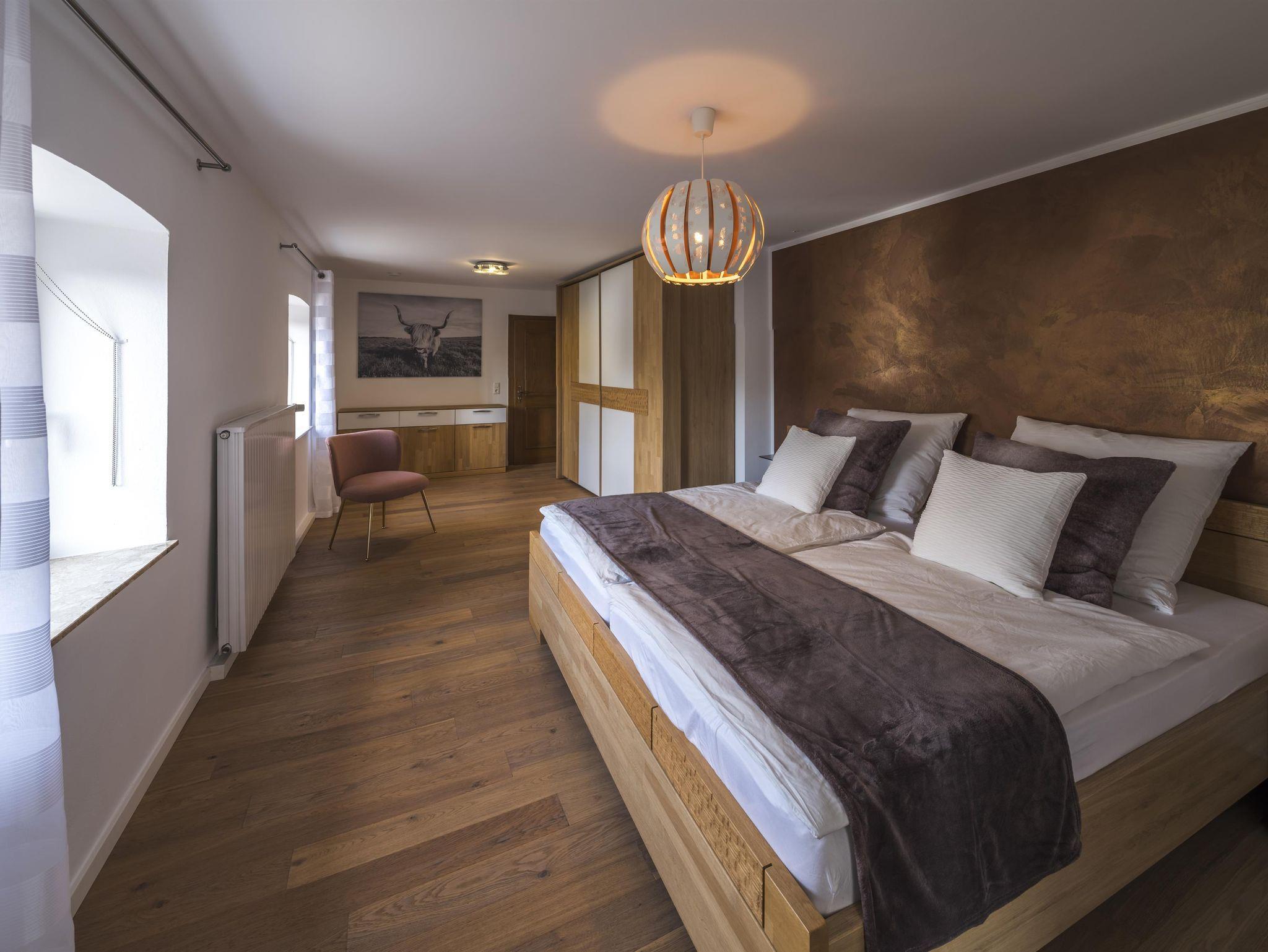 Im Obergeschoss stehen drei modern eingerichtete Schlafzimmer zur Verfügung. Alle sind mit Kleiderschrank und Kommode eingerichtet.