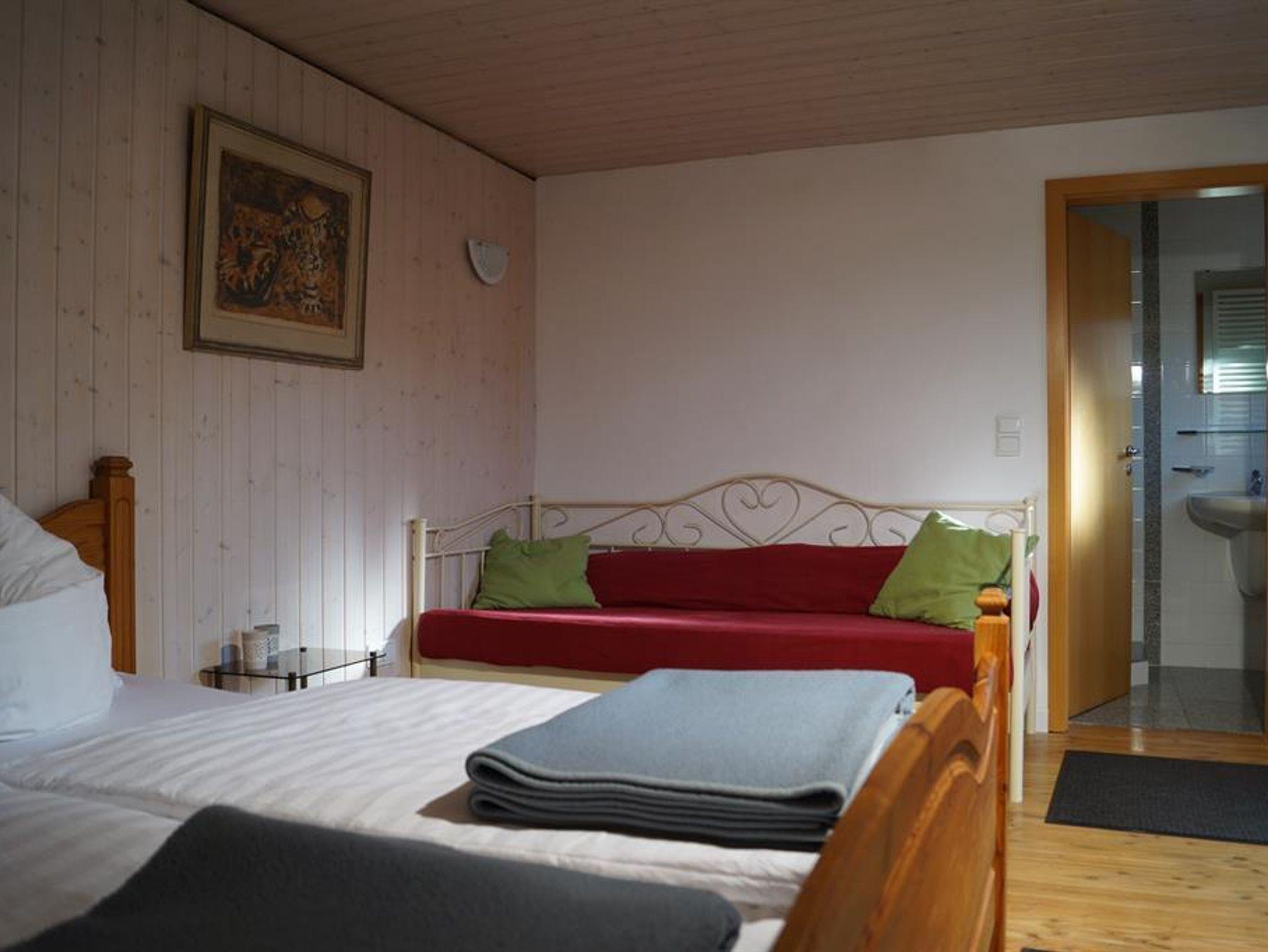 Das Dreibettzimmer wurde 2009 renoviert. Es ist ausgestattet mit einem Doppelbett 2,00/2,00 m und einer zusätzlichen Beleuchtung über den Betten. Ebenso befindet sich ein Einzelbett 0,90/2,00 m sowie ein kleiner Glastisch, ein Kleiderschrank und ein Tisch mit Stühlen im Zimmer.