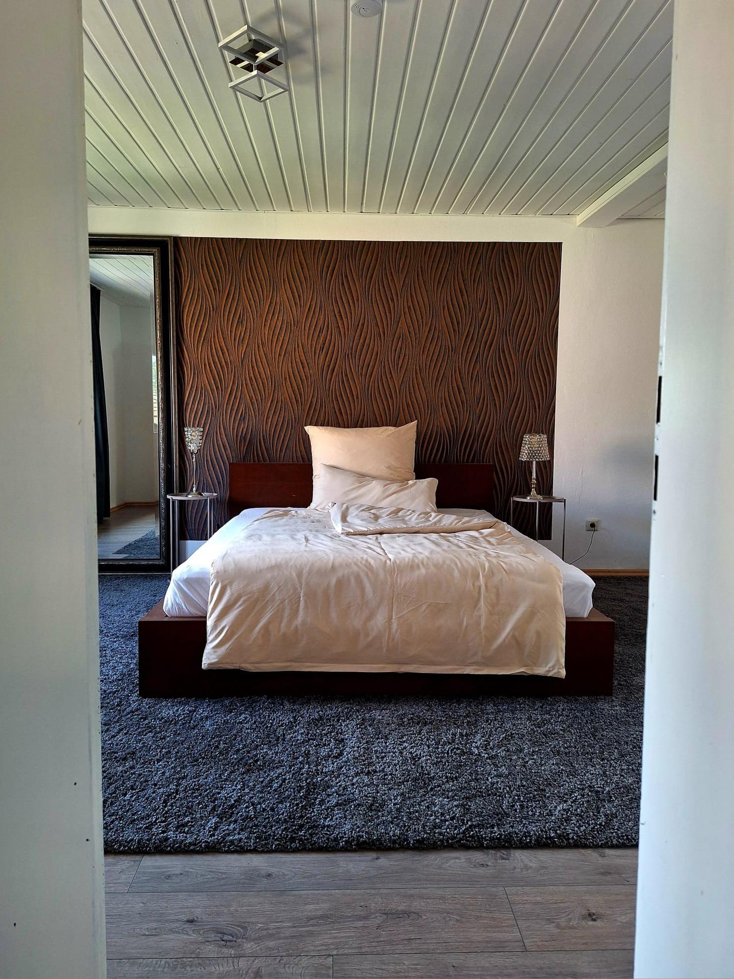 Durch die Küche gelangt man in ein großes Schlafzimmer mit Doppelbett (160*200), 1 Kleiderschrank, einem großen Spiegel und einem Sessel. Die Fenster sind mit Verdunklungsvorhängen versehen, so das einem entspannten Schlaf nichts entgegen spricht.