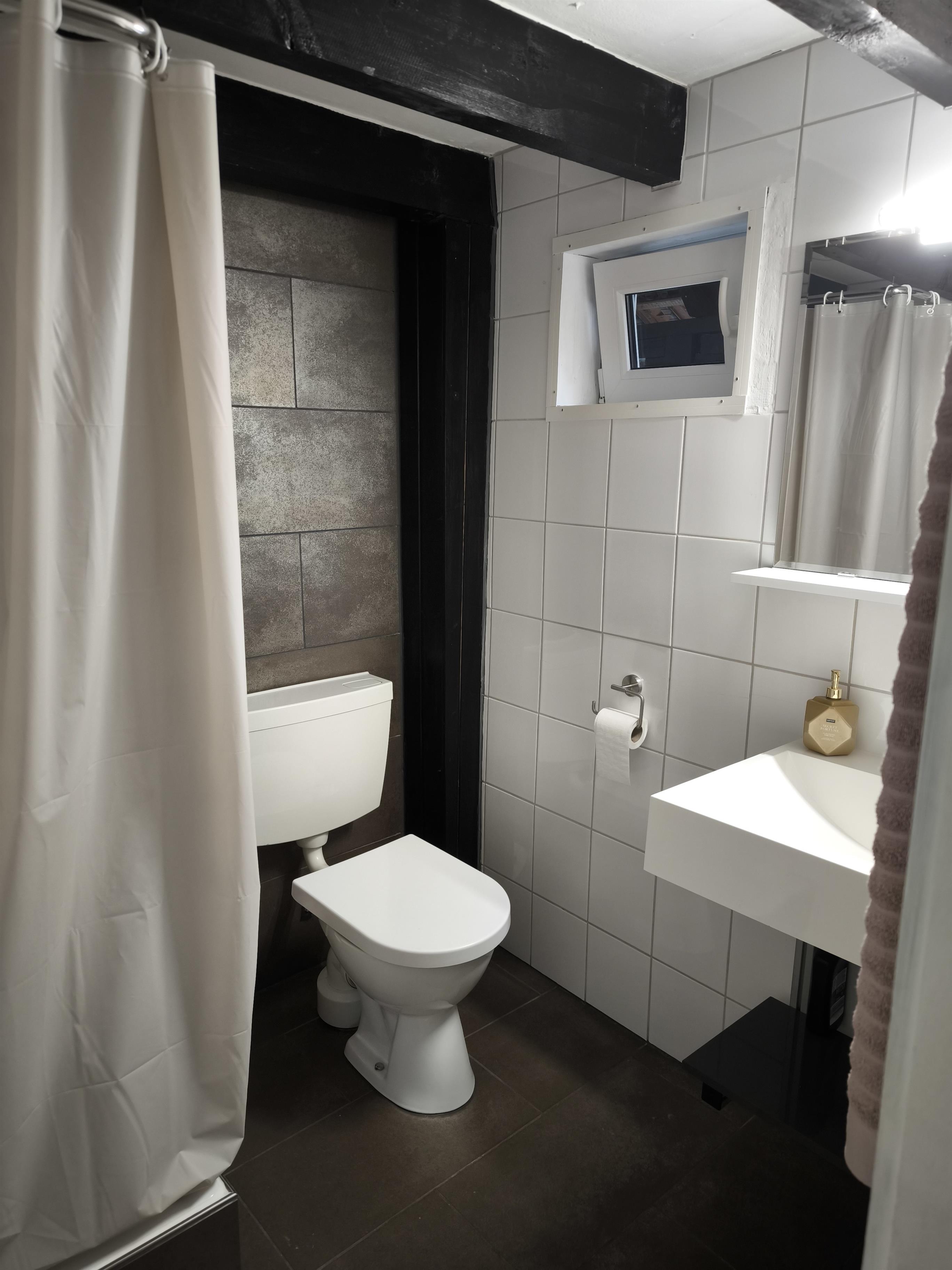 Direkt angrenzend befindet sich ein kleines Bad mit Dusche, Toilette und Waschbecken