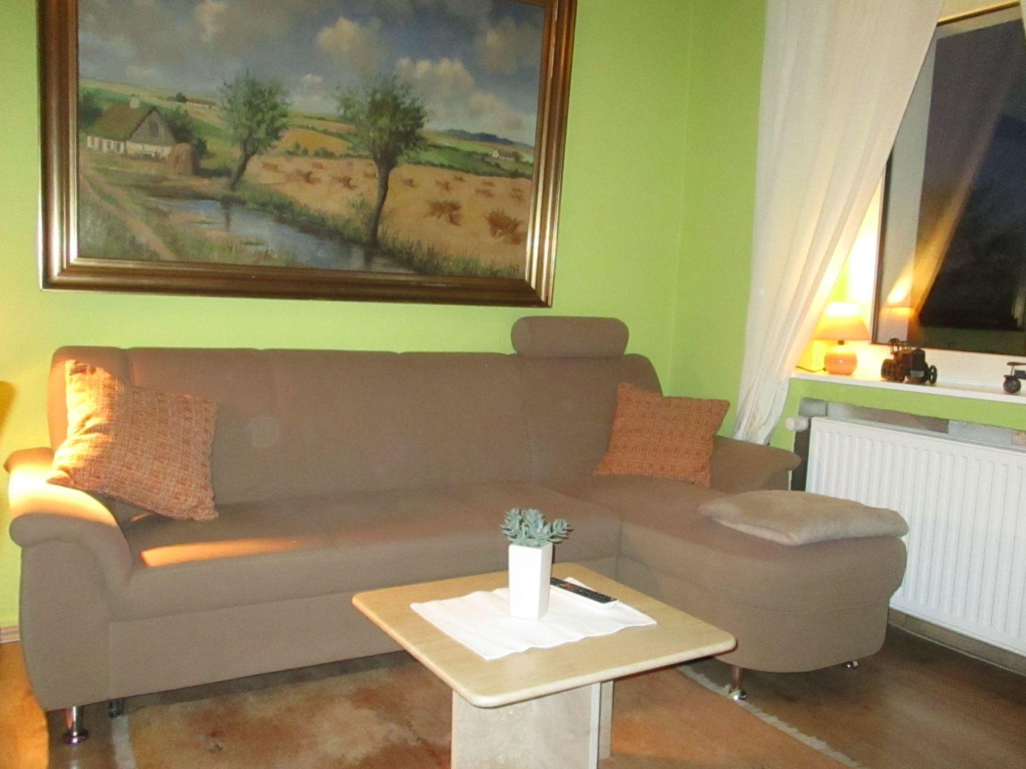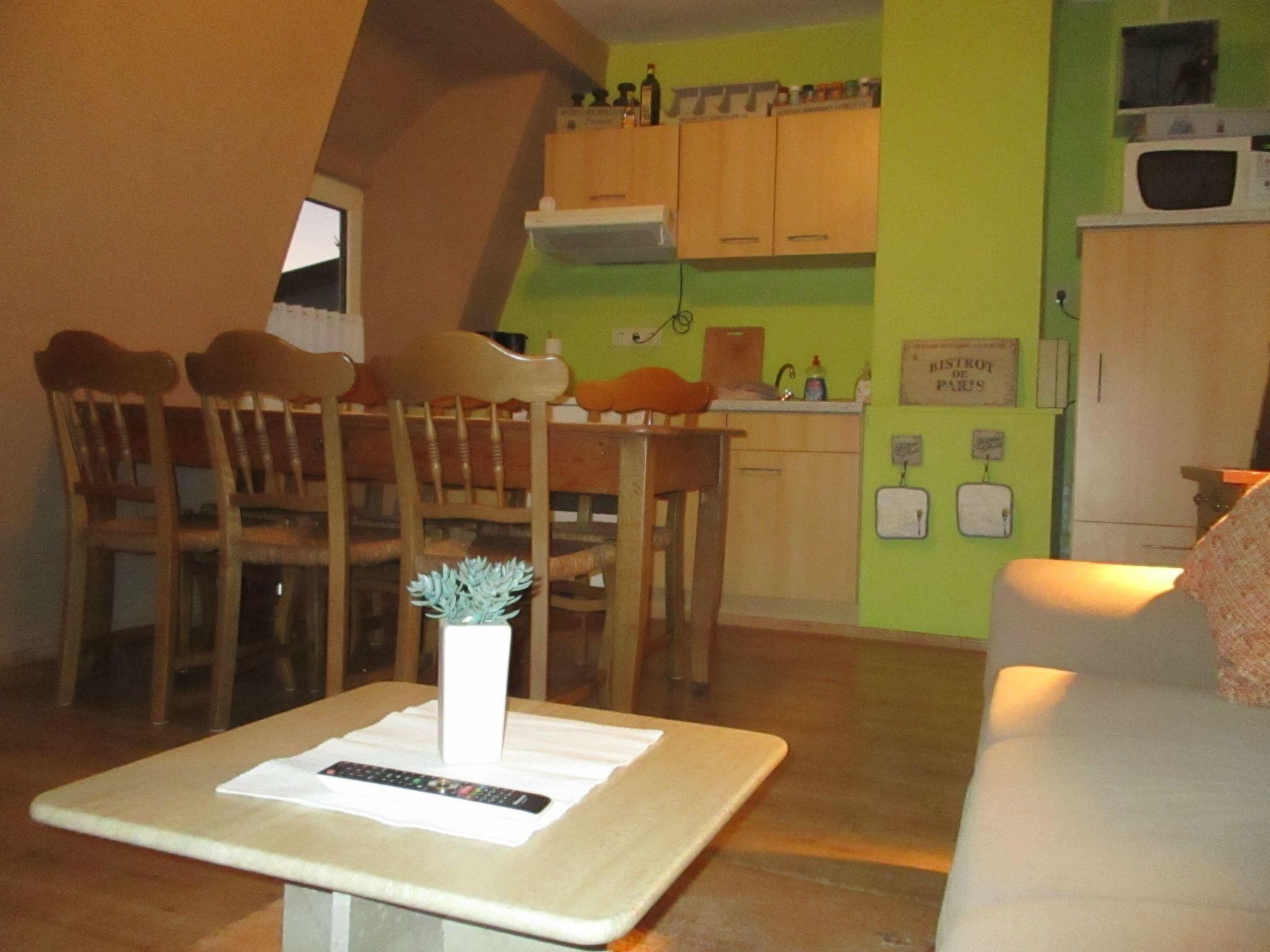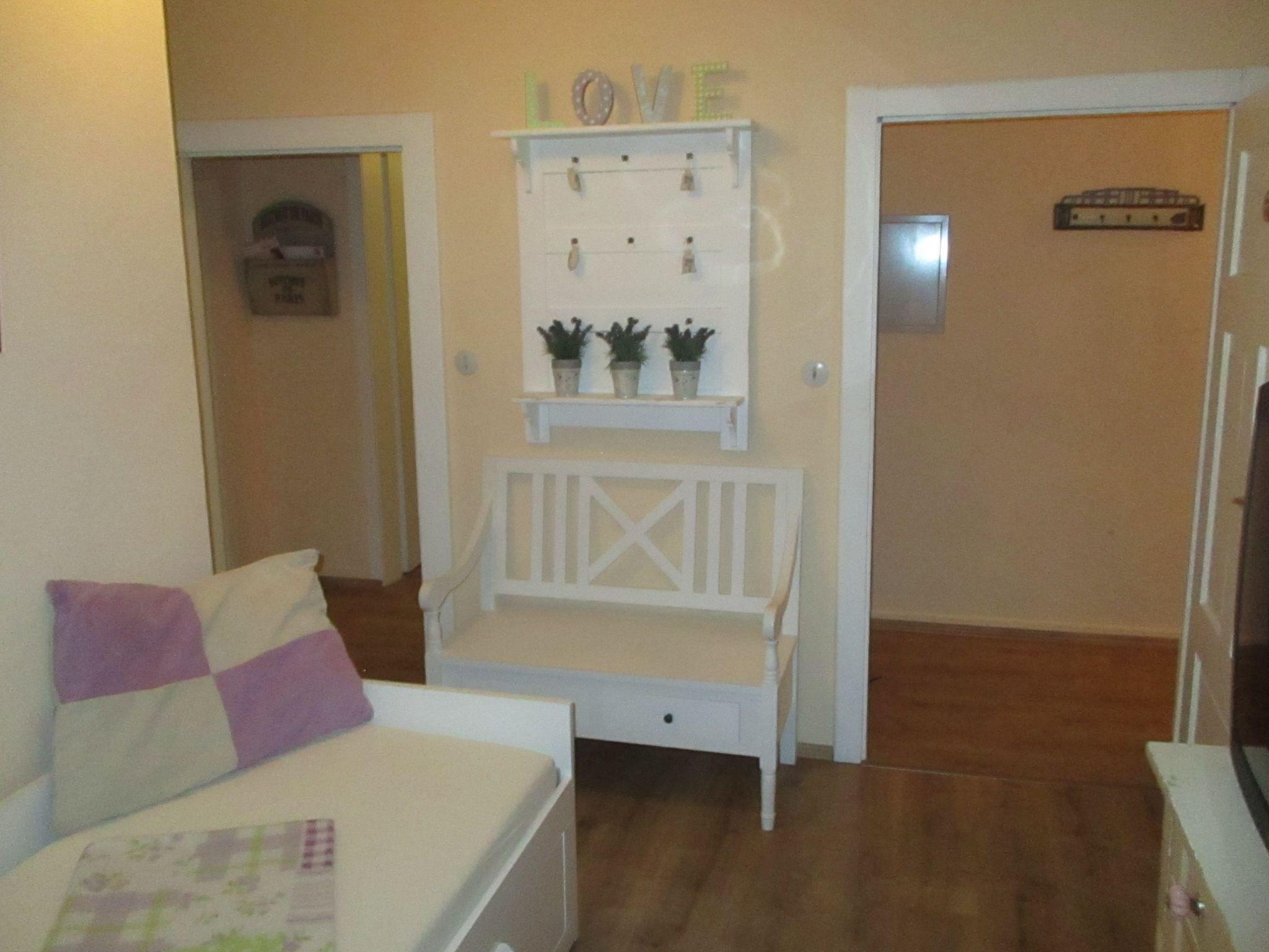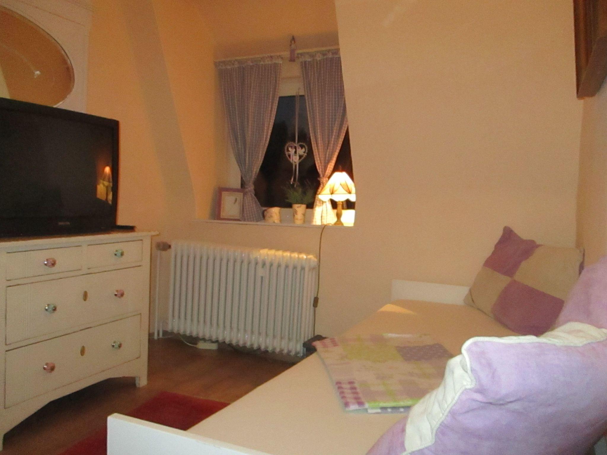 The apartment of around 70m2 is on the first floor. It has been renovated and furnished with charming antiques in a rustic style. The three bedrooms provide ample space for all guests. The first two bedrooms each have a comfortable double bed, while the third has a kingsize bed. The cosy living and dining room includes a fully-equipped built-in kitchen, with all the necessary kitchen utensils, a toaster, a kettle, an electric stove with an oven and a fridge with a freezer compartment. A dining table invites you to enjoy dining together, as well as sociable gatherings. A sofa with satellite TV and an integrated DVD player invites you to relax. The shower room with a WC rounds off the accommodation.