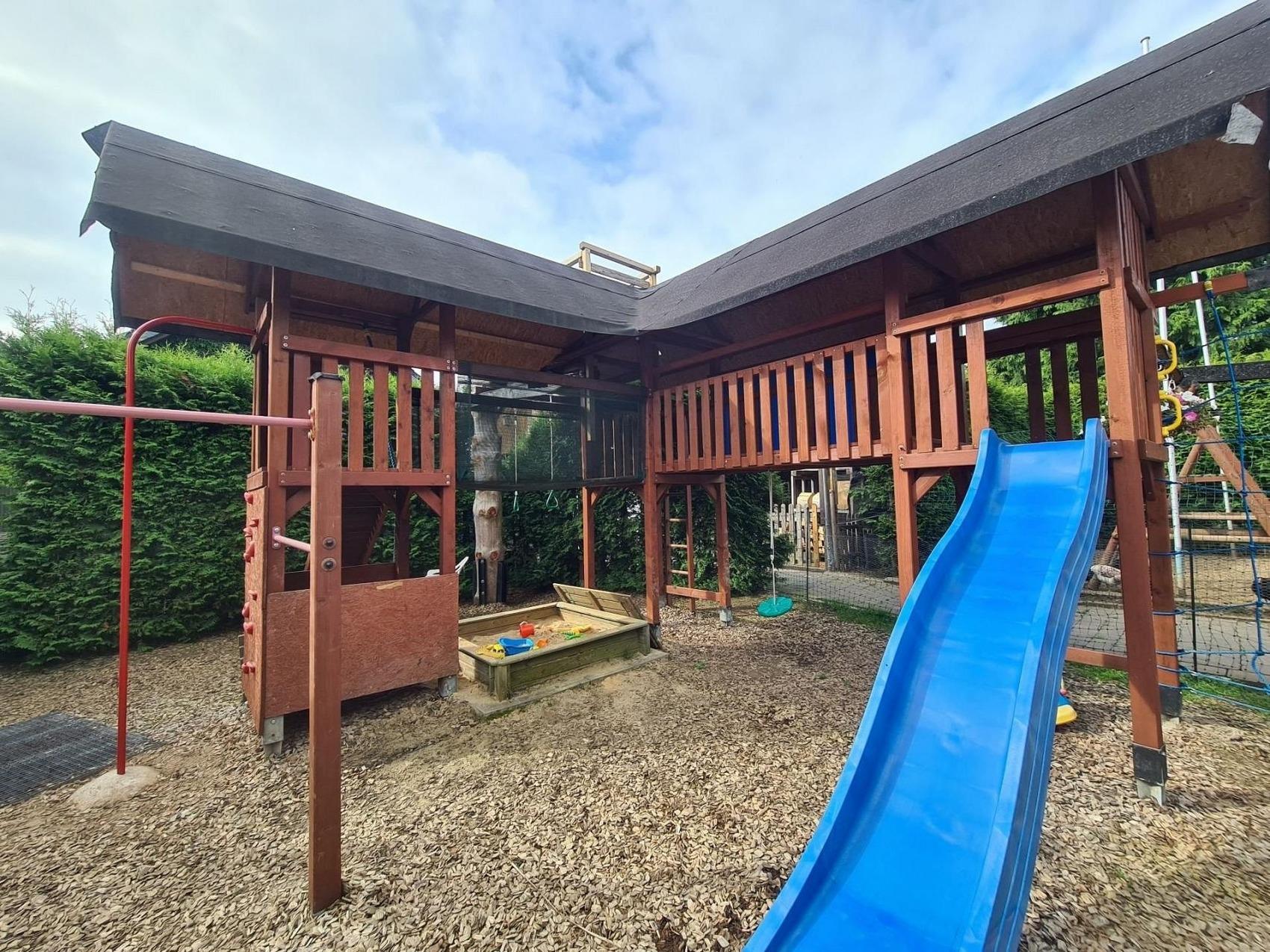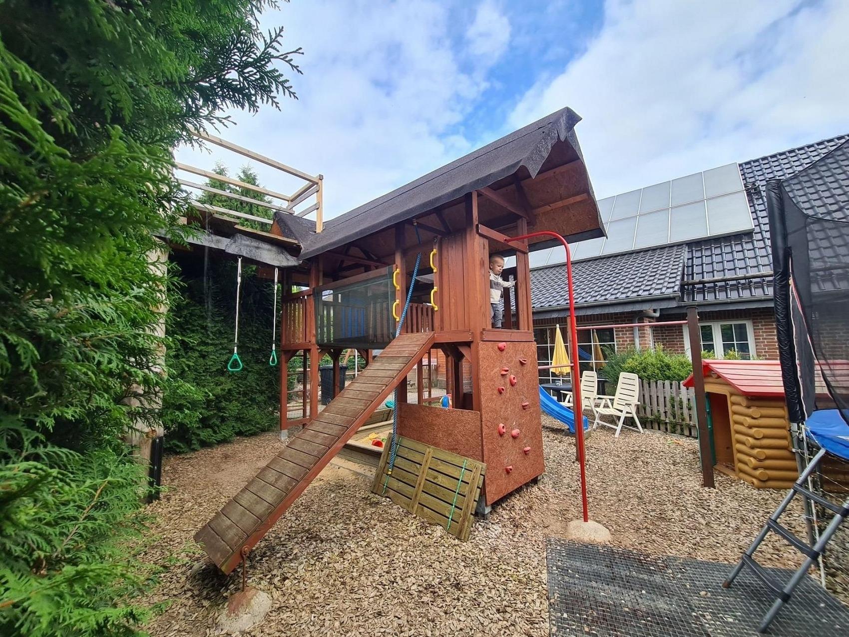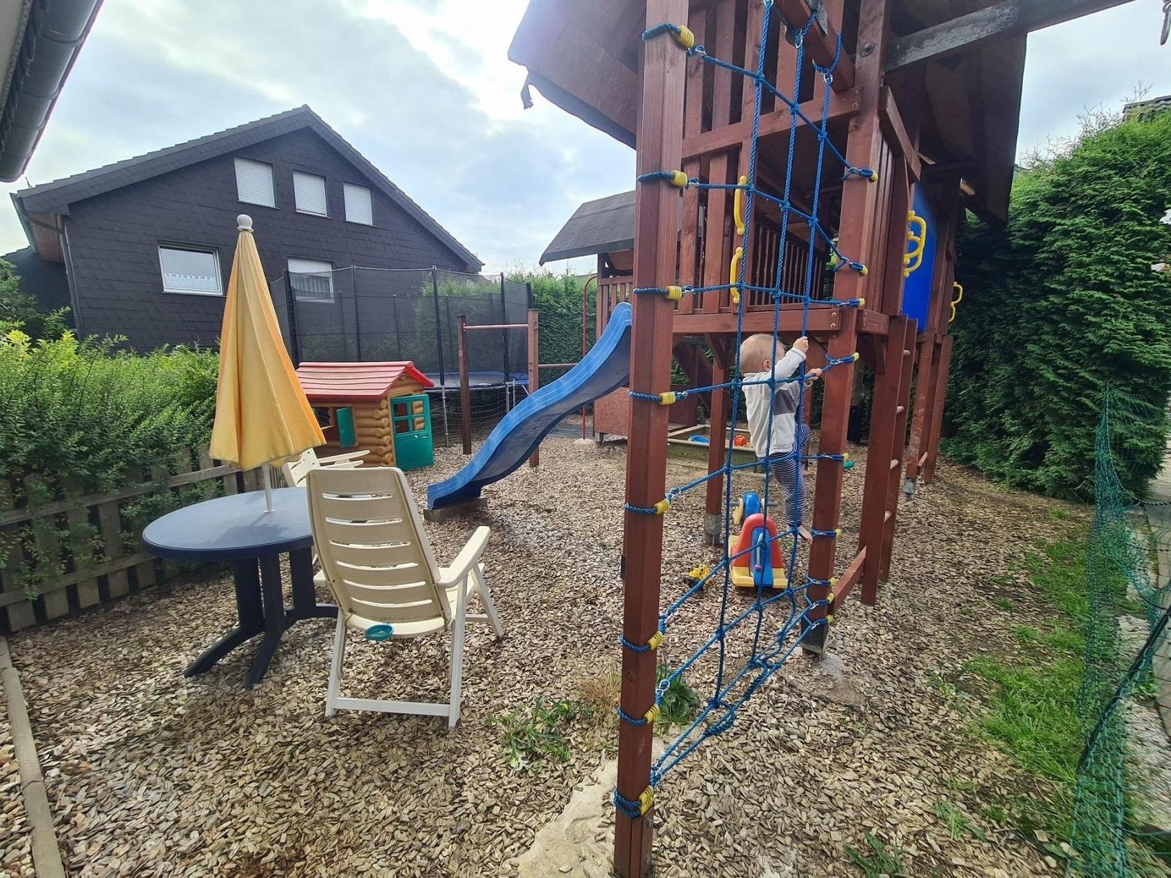 Lebe für die schöne Momente und nimmt dir Zeit für die Entspannung.Familienfreundliche geräumige Ferienwohnung lädt zum Erholen und Relaxen ein.Der große kombinierte Wohn- Esszimmer ist modern und stilvoll eigerichtet.Sie finden dort eine Ledersofa, LED-Fernseher 102 cm, Esstisch mit Stühlen, Bücher-Ecke.Die separate Küche ist komfortabel ausgestattet mit Spülmaschine, Mikrowelle, Herd mit Backoffen, Kochuntensilien usw.Im großzügigen Badezimmer finden Sie eine Regendusche, Fön, Kosmetikspiegel, uvm.Die Ferienunterkunft verfügt über 3 getrennte Schlafräume ausgestattet mit Komfortmatratzen.Im Kinderzimmer ist ein zusätzliches Fernsehen vorhanden.Kinder haben die Möglichkeit im Garten ein großen privaten Abendteuer-Spielplatz zu nutzen.Die kleinen Besucher erwarten 3 Spieltürme mit 2 Brücken, Schaukelmöglichkeiten,Feuerwehrstange, Turnstange, kleine Kletterwand, Kletternetz,Rutsche, Riesentrampolin, Kletterbaum, Sandkasten..Privater Außenpool Nutzung für die ganze Familie im Sommer 7,50m X 4 mBettwäsche und Handtücher-Paket stehen Ihnen ebenfalls zur Verfügung und sind im Preis inbegriffen.1 Parktplatz steht Ihnen zur Verfügung direkt am Haus.