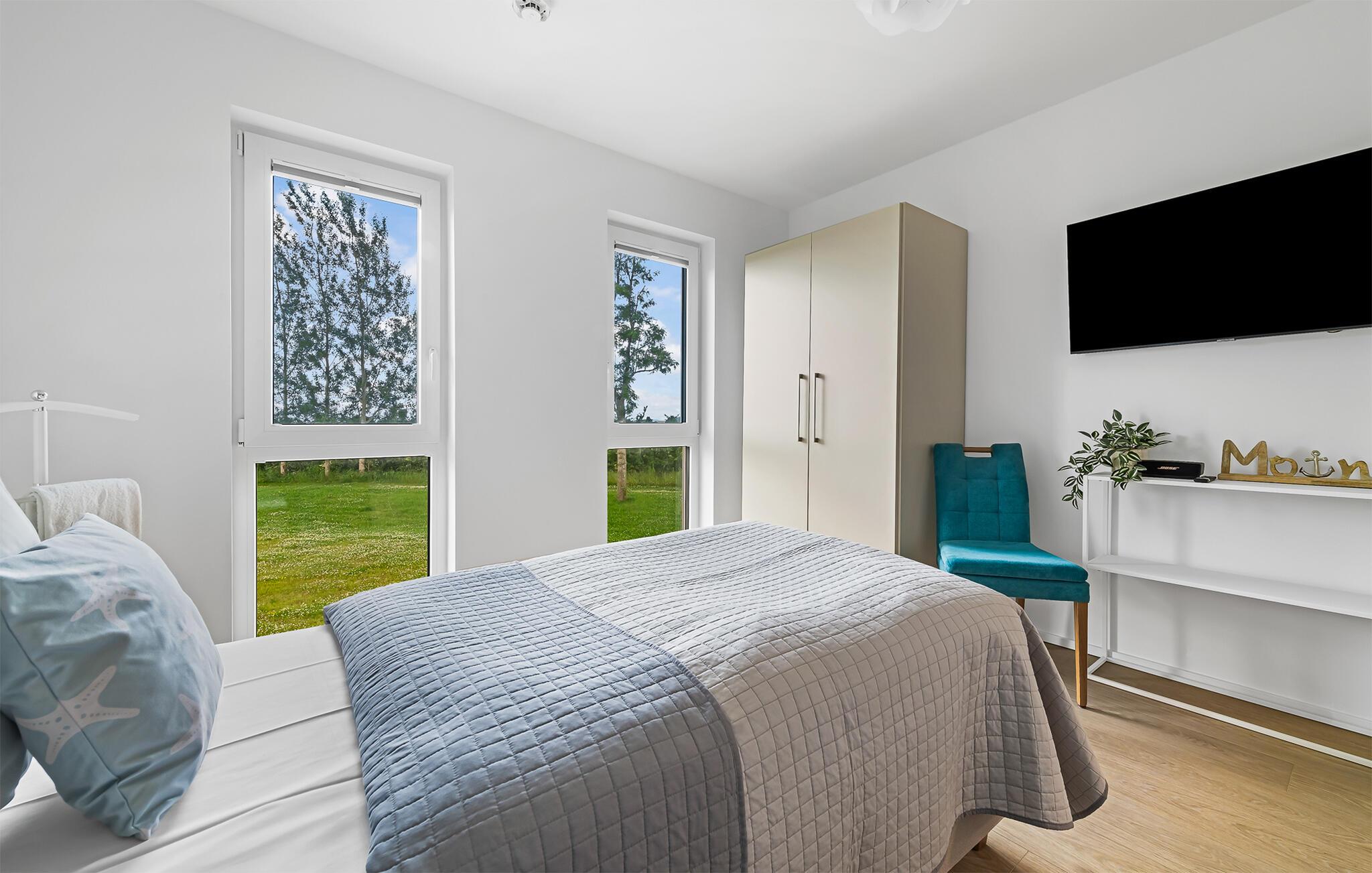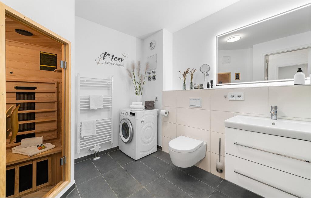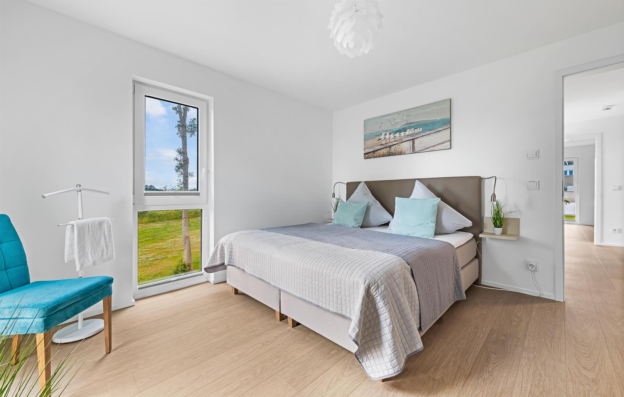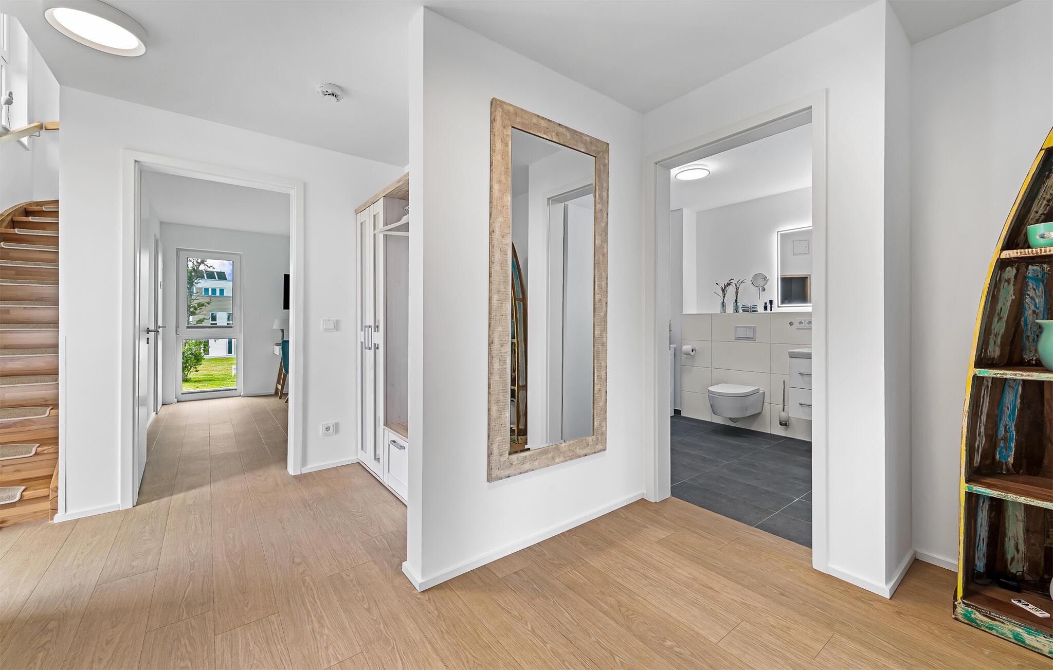 HAVUDSIGT Hvad mere har I brug for i en ferielejlighed? Heldigvis kan I i denne eksklusive ferielounge forvente ikke kun uindskrænket havudsigt, men også en høj standard og plads nok til 8 personer. Midt i den fortryllende kulisse af feriestedet Olpenitz ved Østersøen, strækker denne rummelige maisonette-lejlighed sig over 1. og 2. etage og tilbyder et uforlignelig tilflugtssted for jeres ferie. Velkommen til jeres oase af afslapning! Sandstranden Weidefelder med kiosk, restaurant og strandstole ligger i gåafstand og er et attraktivt rejsemål på alle tider af året. Minigolfbanen med maritimt tema ligger også i umiddelbar nærhed og nydes af både unge og gamle. Lystbådehavnen og havnepromenaden med supermarked og restaurant kan også nås på få minutter til fods. I kommer ind i HAVUDSIGT på første sal. De tre soveværelser af høj kvalitet er placeret på dette niveau. I disse maritimt temaværelser venter to komfortable dobbeltsenge og en to enkeltsenge for at give jer en afslappende nat efter en eventyrlig dag. Det rummelige badeværelse på denne etage imponerer ikke kun med et forfriskende brusebad, men også med en infrarød sauna, der lover afslapning og wellness. På anden sal er der en åben opholdsstue og et perfekt udstyret køkken, der venter på jer. Køkkenet er hjertet af kulinariske lækkerier og hyggelige madlavningsaftener. Det store spisebord kan sagtens rumme 8 personer. I tilknytning til spisepladsen ligger den hyggelige opholdsstue, som byder på en indbydende opholdsstue. Den store sofa kan nemt laves om til en seng til to personer. En smagfuld indretning i maritim stil af høj kvalitet giver SEA VIEW en harmonisk og afslappende atmosfære. I finder i alt tre Smart TV i ferielejligheden. Se jeres yndlingsfilm på sofaen ved siden af den knitrende pejs eller i to af soveværelserne. Udsigten fra stuen fører til en rummelig terrasse, hvorfra I kan overskue den smukke Østersø og saltvandsengene foran den med deres mangfoldige flora og fauna. Med lidt held vil I opleve det naturlige liv og se hjorte eller kaniner i deres naturlige miljø. På denne etage finder I et andet badeværelse med badekar, som runder følelsen af og sikrer et afslappende ophold på alle tider af året. I finder en privat parkeringsplads lige foran huset. Hele ferielejligheden er udstyret med WiFi og gulvvarme. Se selv, der er ikke noget smukkere end HAVUDSIGT! Vores favoritsted: Nyd en kop kaffe om morgenen i en strandstol med udsigt over Østersøen. Bemærk venligst: OstseeResort Olpenitz er meget populært, og der bygges fortsat i parken. Ikke desto mindre kan I se frem til en 5-stjernet standard og et førsteklasses ophold. Byggeaktiviteterne kommer ikke til at forstyrre jer på ferien, og derfor gives der ikke yderligere afslag i prisen.