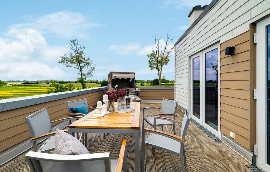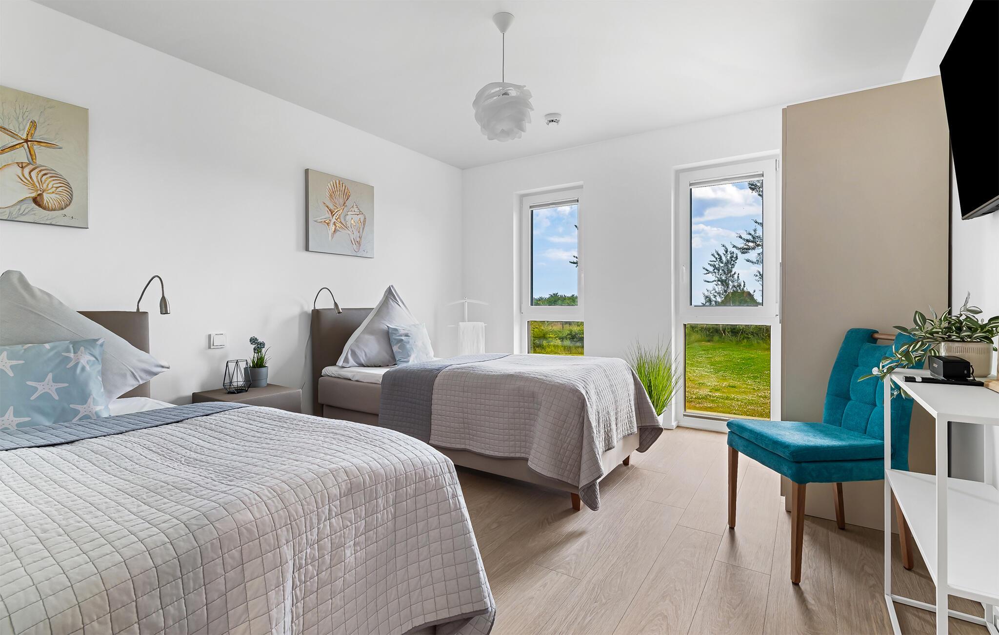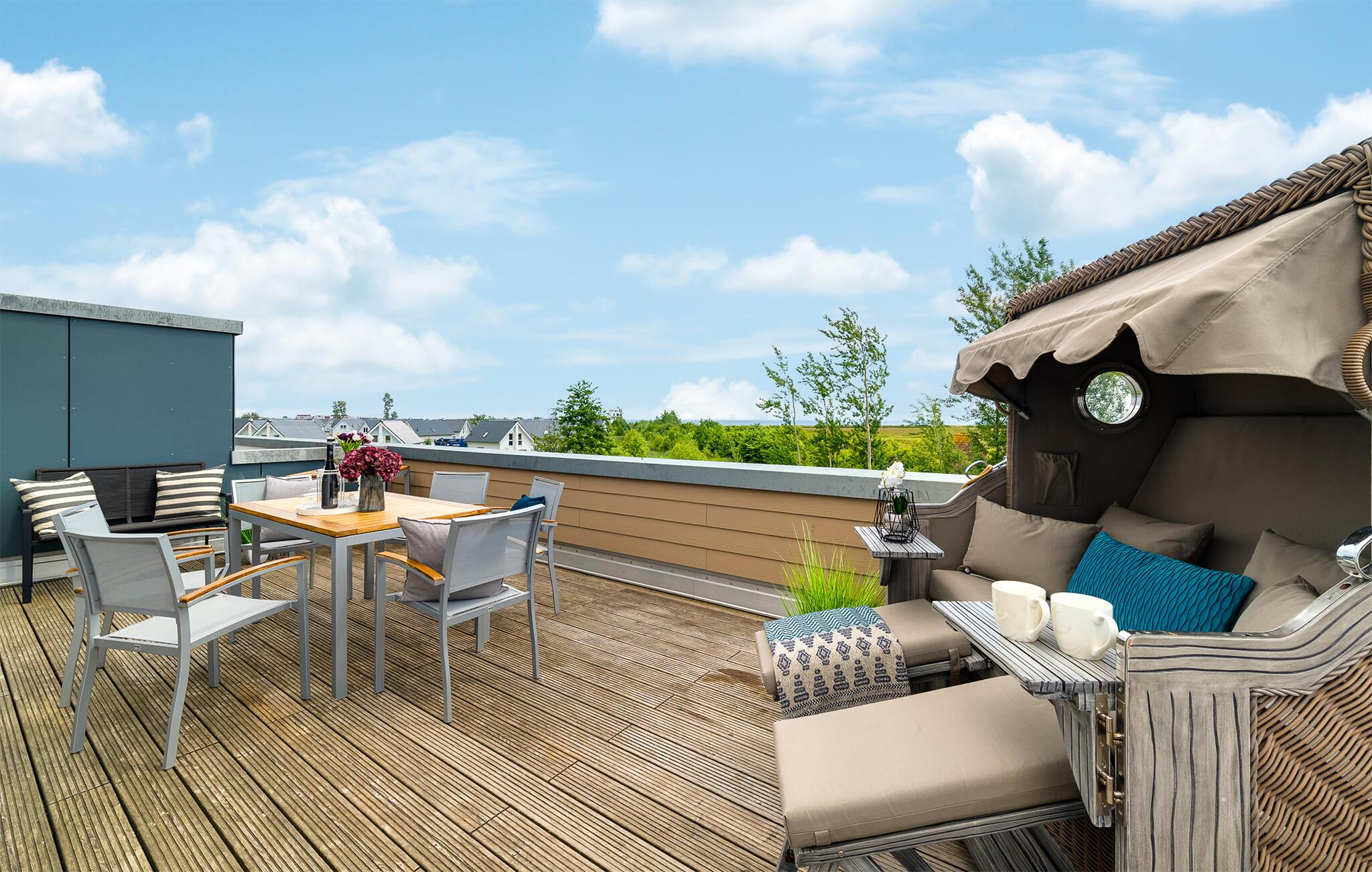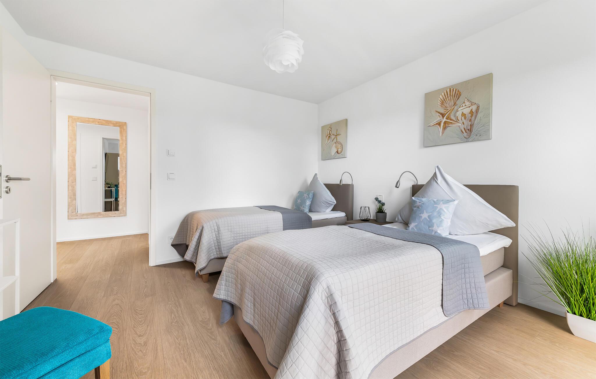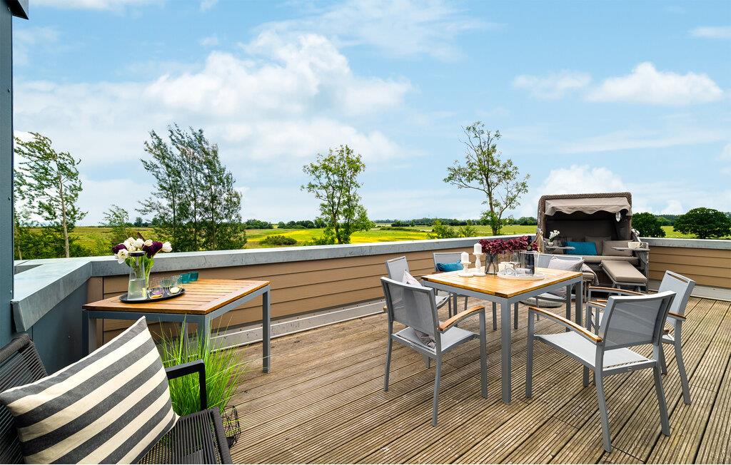 HAVUDSIGT Hvad mere har I brug for i en ferielejlighed? Heldigvis kan I i denne eksklusive ferielounge forvente ikke kun uindskrænket havudsigt, men også en høj standard og plads nok til 8 personer. Midt i den fortryllende kulisse af feriestedet Olpenitz ved Østersøen, strækker denne rummelige maisonette-lejlighed sig over 1. og 2. etage og tilbyder et uforlignelig tilflugtssted for jeres ferie. Velkommen til jeres oase af afslapning! Sandstranden Weidefelder med kiosk, restaurant og strandstole ligger i gåafstand og er et attraktivt rejsemål på alle tider af året. Minigolfbanen med maritimt tema ligger også i umiddelbar nærhed og nydes af både unge og gamle. Lystbådehavnen og havnepromenaden med supermarked og restaurant kan også nås på få minutter til fods. I kommer ind i HAVUDSIGT på første sal. De tre soveværelser af høj kvalitet er placeret på dette niveau. I disse maritimt temaværelser venter to komfortable dobbeltsenge og en to enkeltsenge for at give jer en afslappende nat efter en eventyrlig dag. Det rummelige badeværelse på denne etage imponerer ikke kun med et forfriskende brusebad, men også med en infrarød sauna, der lover afslapning og wellness. På anden sal er der en åben opholdsstue og et perfekt udstyret køkken, der venter på jer. Køkkenet er hjertet af kulinariske lækkerier og hyggelige madlavningsaftener. Det store spisebord kan sagtens rumme 8 personer. I tilknytning til spisepladsen ligger den hyggelige opholdsstue, som byder på en indbydende opholdsstue. Den store sofa kan nemt laves om til en seng til to personer. En smagfuld indretning i maritim stil af høj kvalitet giver SEA VIEW en harmonisk og afslappende atmosfære. I finder i alt tre Smart TV i ferielejligheden. Se jeres yndlingsfilm på sofaen ved siden af den knitrende pejs eller i to af soveværelserne. Udsigten fra stuen fører til en rummelig terrasse, hvorfra I kan overskue den smukke Østersø og saltvandsengene foran den med deres mangfoldige flora og fauna. Med lidt held vil I opleve det naturlige liv og se hjorte eller kaniner i deres naturlige miljø. På denne etage finder I et andet badeværelse med badekar, som runder følelsen af og sikrer et afslappende ophold på alle tider af året. I finder en privat parkeringsplads lige foran huset. Hele ferielejligheden er udstyret med WiFi og gulvvarme. Se selv, der er ikke noget smukkere end HAVUDSIGT! Vores favoritsted: Nyd en kop kaffe om morgenen i en strandstol med udsigt over Østersøen. Bemærk venligst: OstseeResort Olpenitz er meget populært, og der bygges fortsat i parken. Ikke desto mindre kan I se frem til en 5-stjernet standard og et førsteklasses ophold. Byggeaktiviteterne kommer ikke til at forstyrre jer på ferien, og derfor gives der ikke yderligere afslag i prisen.