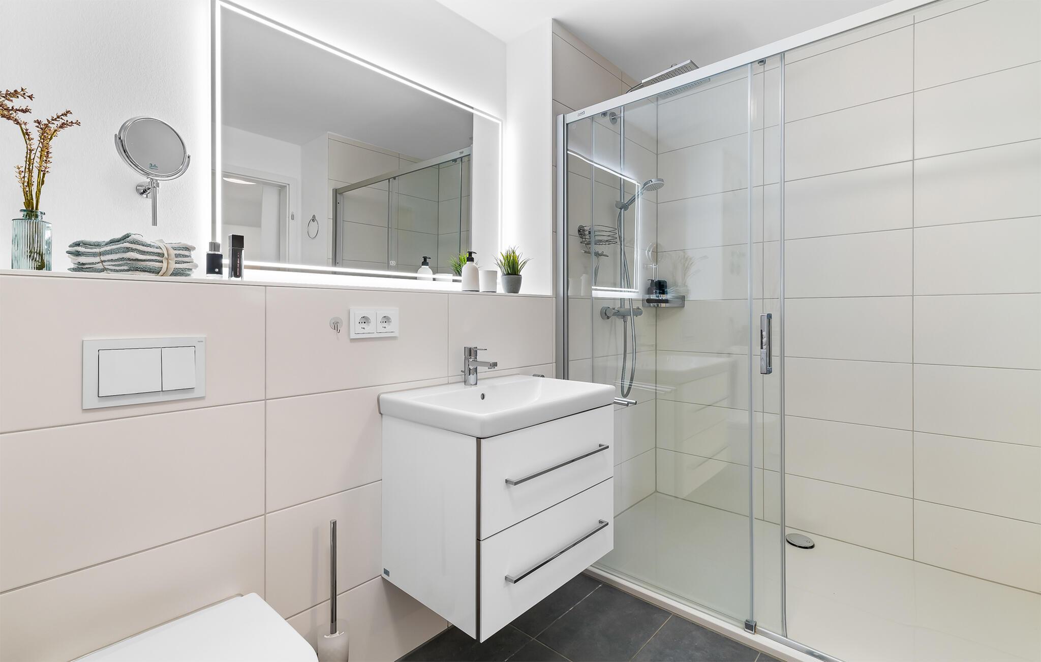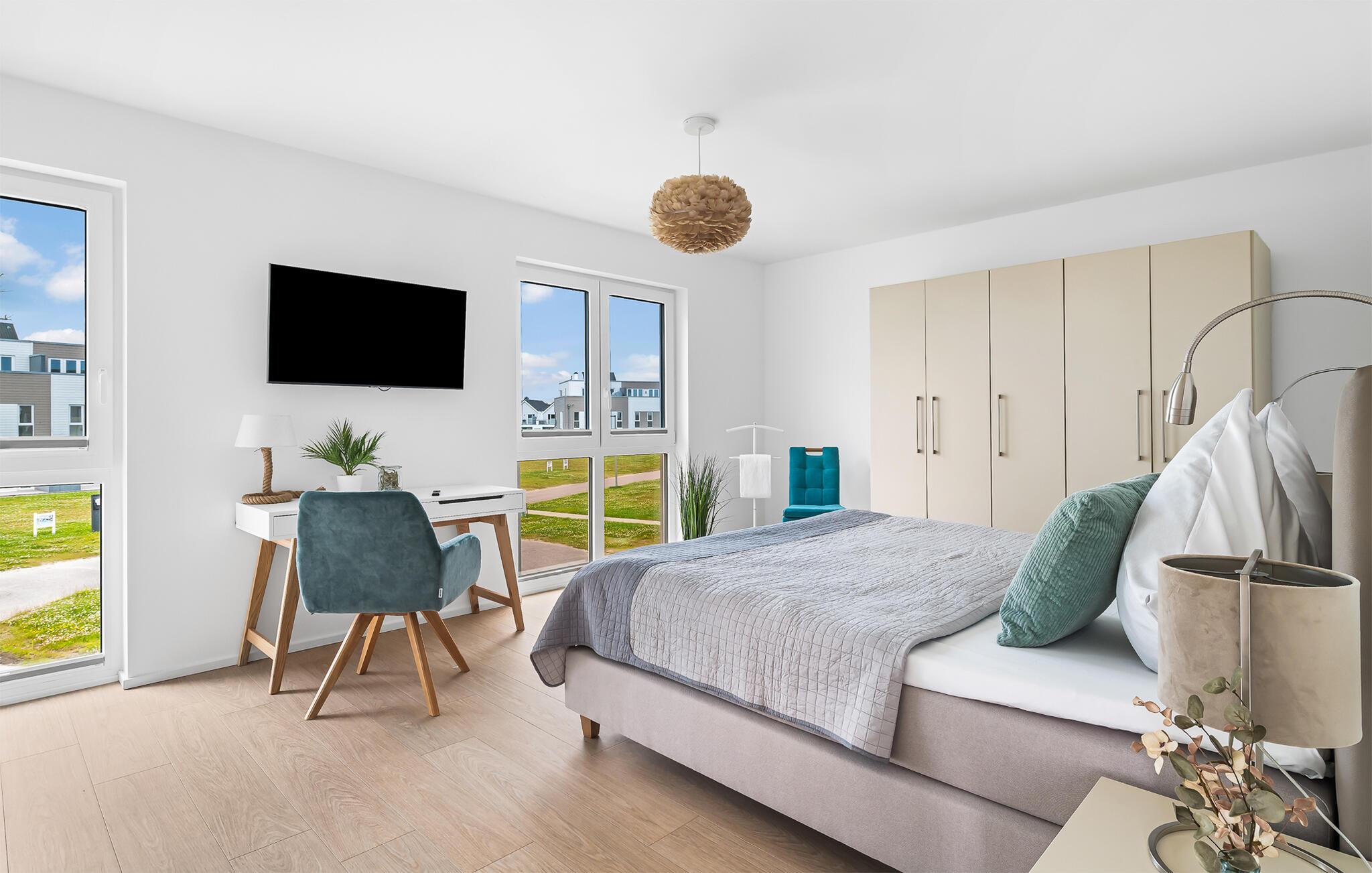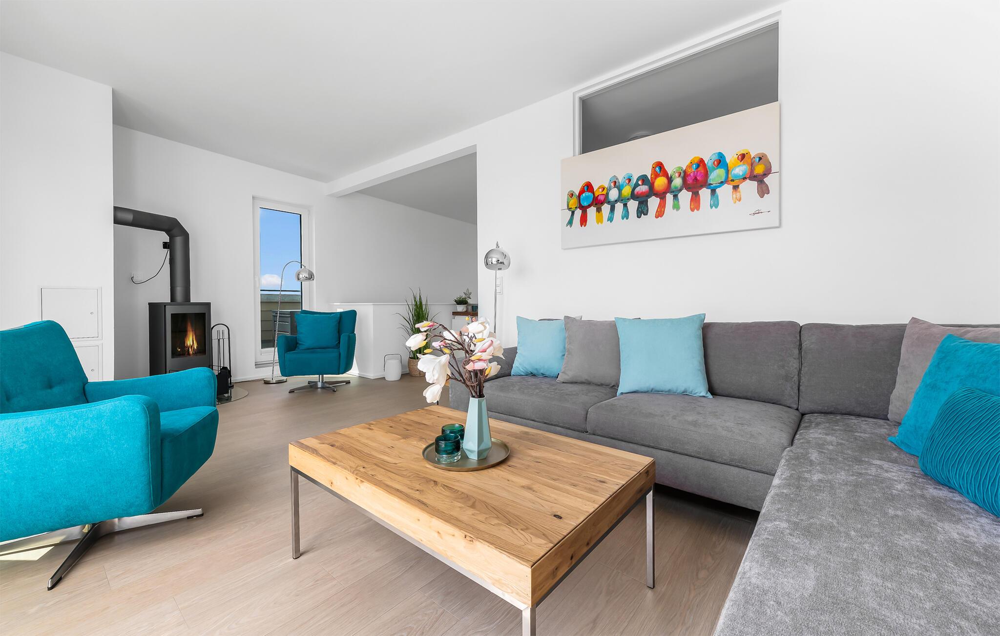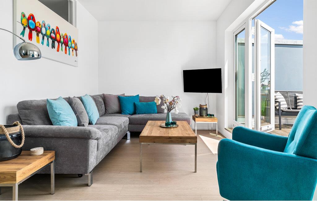 HAVUDSIGT Hvad mere har I brug for i en ferielejlighed? Heldigvis kan I i denne eksklusive ferielounge forvente ikke kun uindskrænket havudsigt, men også en høj standard og plads nok til 8 personer. Midt i den fortryllende kulisse af feriestedet Olpenitz ved Østersøen, strækker denne rummelige maisonette-lejlighed sig over 1. og 2. etage og tilbyder et uforlignelig tilflugtssted for jeres ferie. Velkommen til jeres oase af afslapning! Sandstranden Weidefelder med kiosk, restaurant og strandstole ligger i gåafstand og er et attraktivt rejsemål på alle tider af året. Minigolfbanen med maritimt tema ligger også i umiddelbar nærhed og nydes af både unge og gamle. Lystbådehavnen og havnepromenaden med supermarked og restaurant kan også nås på få minutter til fods. I kommer ind i HAVUDSIGT på første sal. De tre soveværelser af høj kvalitet er placeret på dette niveau. I disse maritimt temaværelser venter to komfortable dobbeltsenge og en to enkeltsenge for at give jer en afslappende nat efter en eventyrlig dag. Det rummelige badeværelse på denne etage imponerer ikke kun med et forfriskende brusebad, men også med en infrarød sauna, der lover afslapning og wellness. På anden sal er der en åben opholdsstue og et perfekt udstyret køkken, der venter på jer. Køkkenet er hjertet af kulinariske lækkerier og hyggelige madlavningsaftener. Det store spisebord kan sagtens rumme 8 personer. I tilknytning til spisepladsen ligger den hyggelige opholdsstue, som byder på en indbydende opholdsstue. Den store sofa kan nemt laves om til en seng til to personer. En smagfuld indretning i maritim stil af høj kvalitet giver SEA VIEW en harmonisk og afslappende atmosfære. I finder i alt tre Smart TV i ferielejligheden. Se jeres yndlingsfilm på sofaen ved siden af den knitrende pejs eller i to af soveværelserne. Udsigten fra stuen fører til en rummelig terrasse, hvorfra I kan overskue den smukke Østersø og saltvandsengene foran den med deres mangfoldige flora og fauna. Med lidt held vil I opleve det naturlige liv og se hjorte eller kaniner i deres naturlige miljø. På denne etage finder I et andet badeværelse med badekar, som runder følelsen af og sikrer et afslappende ophold på alle tider af året. I finder en privat parkeringsplads lige foran huset. Hele ferielejligheden er udstyret med WiFi og gulvvarme. Se selv, der er ikke noget smukkere end HAVUDSIGT! Vores favoritsted: Nyd en kop kaffe om morgenen i en strandstol med udsigt over Østersøen. Bemærk venligst: OstseeResort Olpenitz er meget populært, og der bygges fortsat i parken. Ikke desto mindre kan I se frem til en 5-stjernet standard og et førsteklasses ophold. Byggeaktiviteterne kommer ikke til at forstyrre jer på ferien, og derfor gives der ikke yderligere afslag i prisen.
