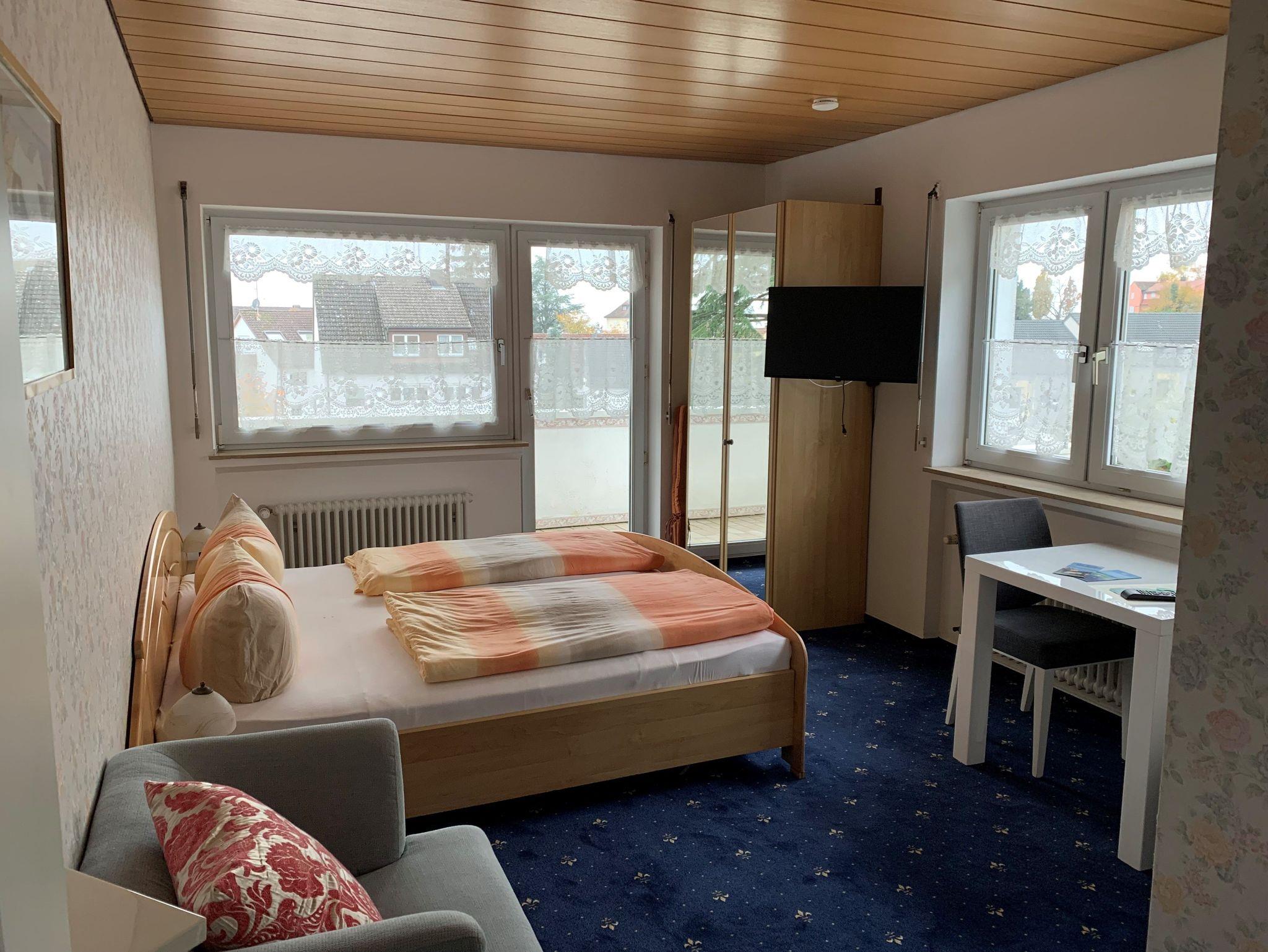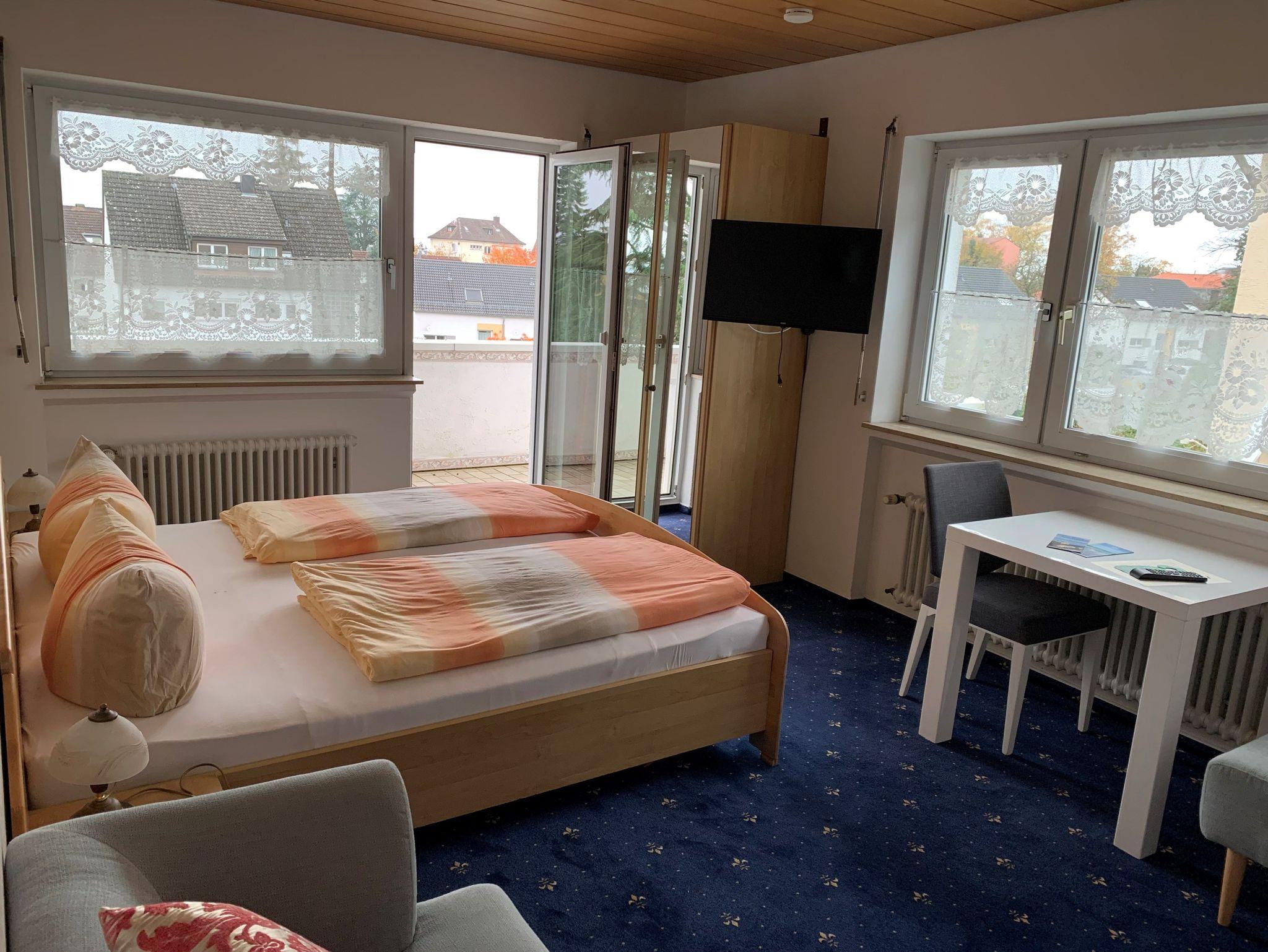 Ruhige Pension in sonniger Lage. In Gartenanlage ohne Verkehrslärm. Vier Gehminuten zur Altstadt, kostenlose Parkplätze und abschließbare Fahrradgarage direkt am Haus, Doppelzimmer mit Kühlschrank, Geschirrschrank, DU/WC, TV, Tresor, Wlan und zum größten Teil mit Balkon oder Terrasse. Zimmer ohne Frühstück, Frühstücksmöglichkeiten in der nahen Altstadt.