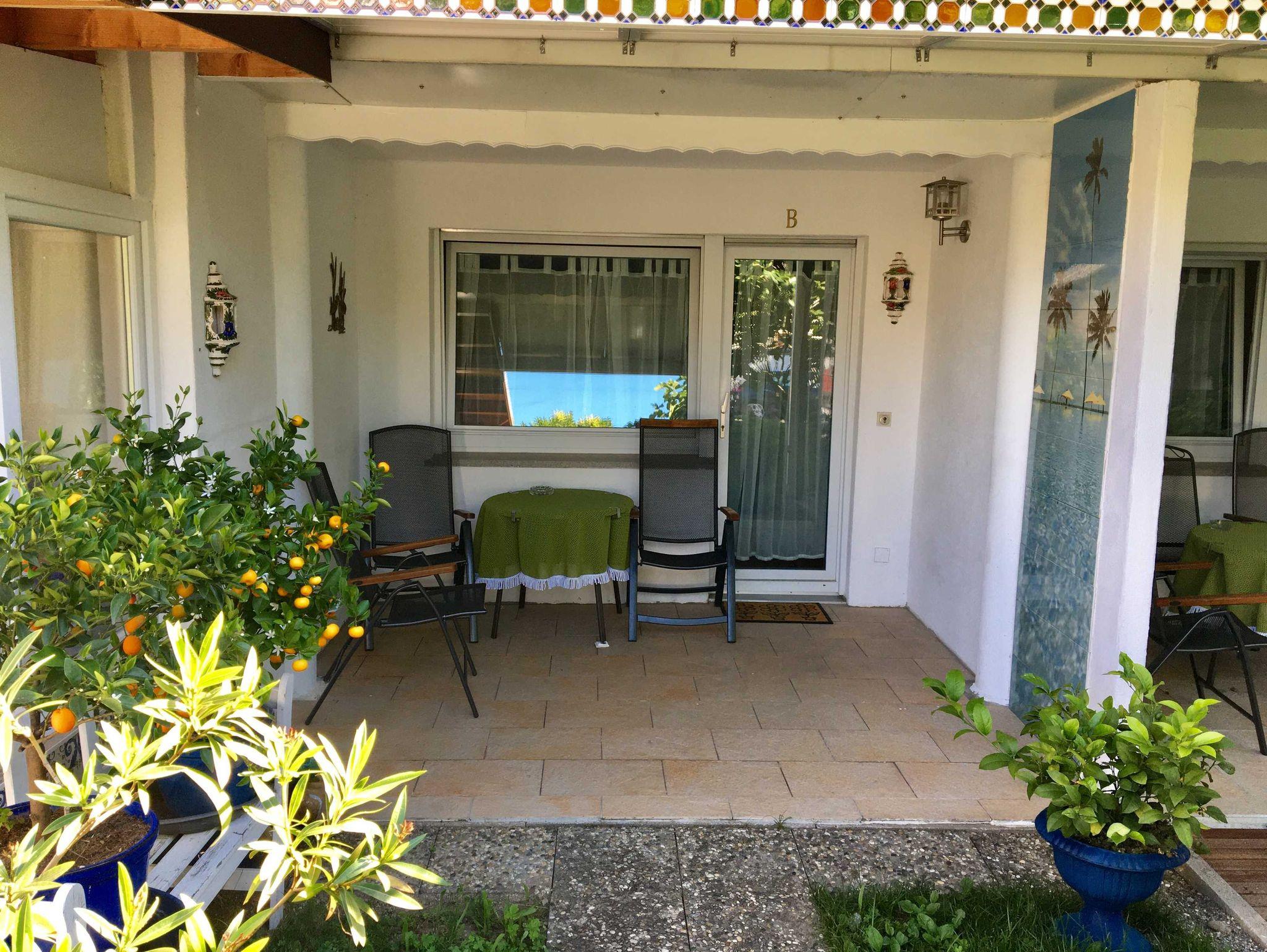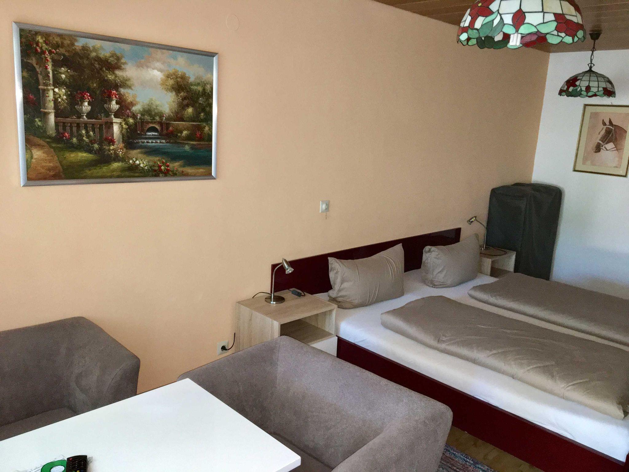 Großes Doppelzimmer (Nr. B) mit Miniküche, Kühlschrank und Kaffeemaschine, Du/WC, TV, Safe, Wlan, Laminatfußboden, überdachte Terrasse in Südlage. Das Zimmer liegt parterre im Garten. Auf Anfrage kann in diesem Zimmer ein Hund mitgebracht werden.