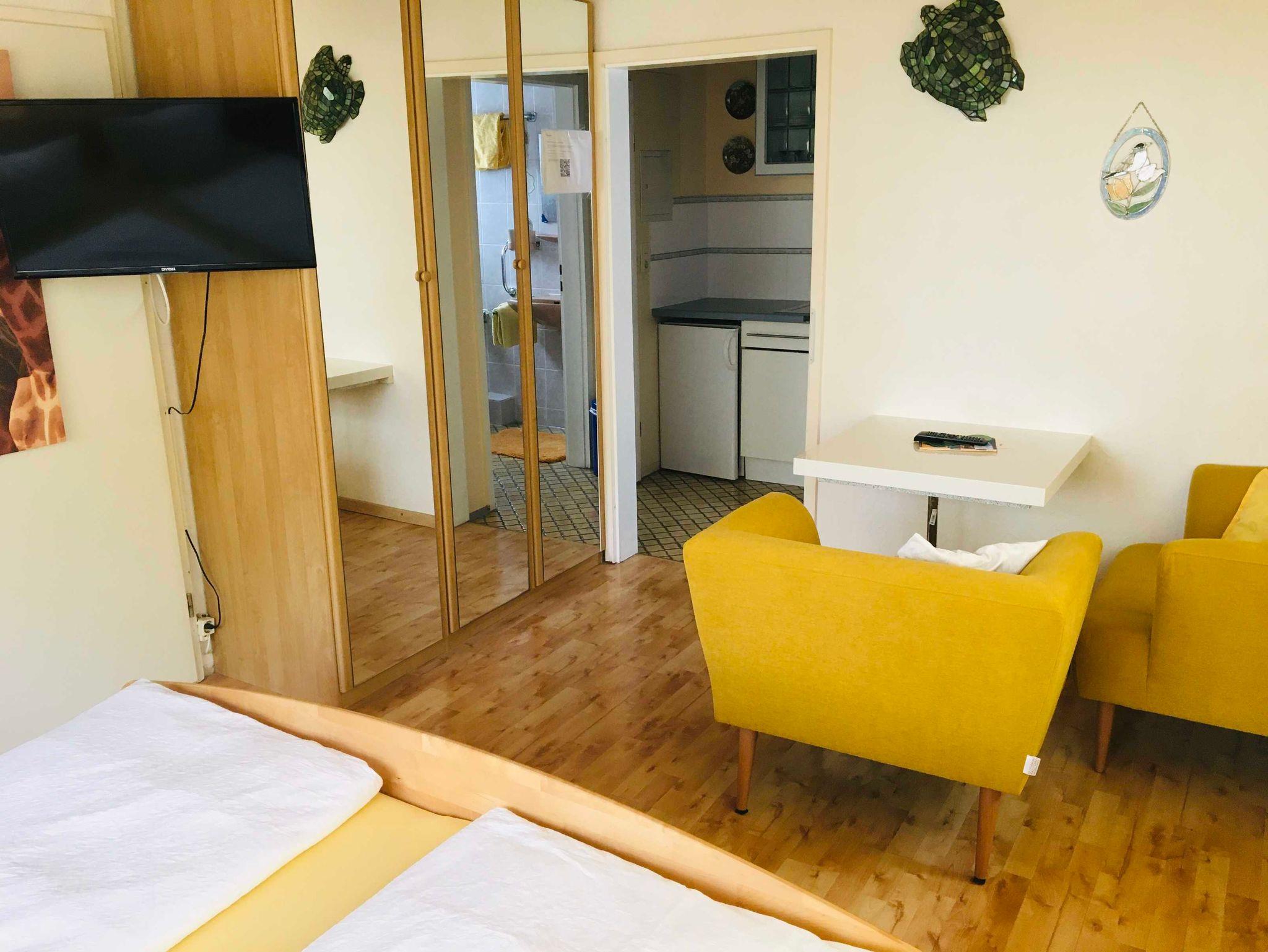 Doppelzimmer Nr. 1 mit Du/WC, TV, Safe, Kühlschrank, Kaffeemaschine, Geschirrschrank, Laminatboden und Wlan. Das Zimmer ist in Nord-West-Ausrichtung und befindet sich in der Nähe des Eingangsbereichs (ohne Balkon).