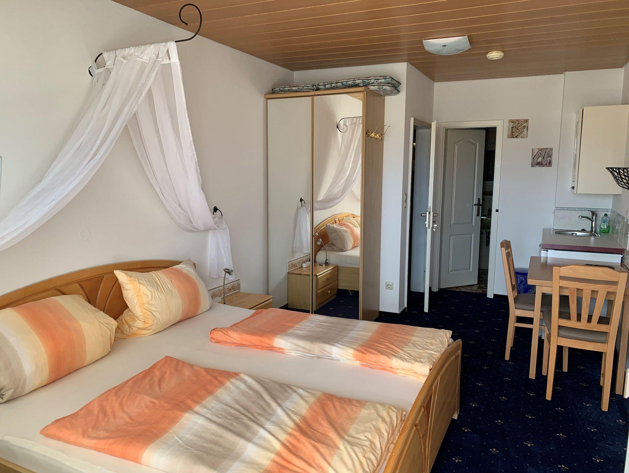 Kleineres Doppelzimmer (Nr. 8) in Südlage mit Du/WC, TV, Safe, Kühlschrank, Geschirrschrank, Kaffeemaschine, Wlan, Balkon in Südlage. Das Zimmer befindet sich im 2. Stock.