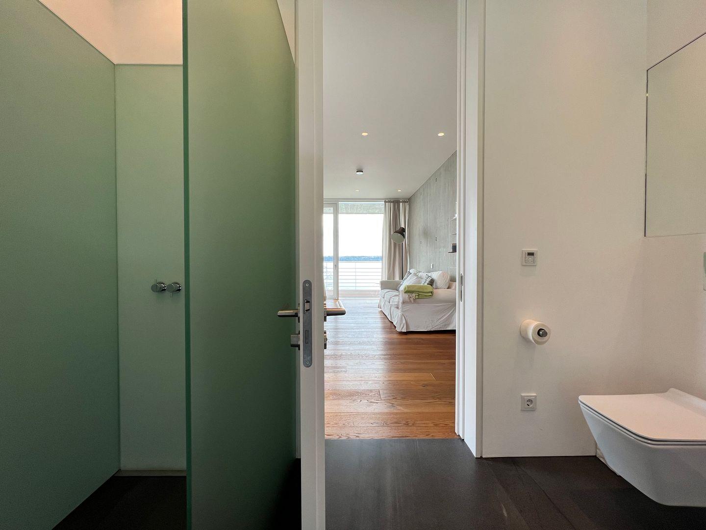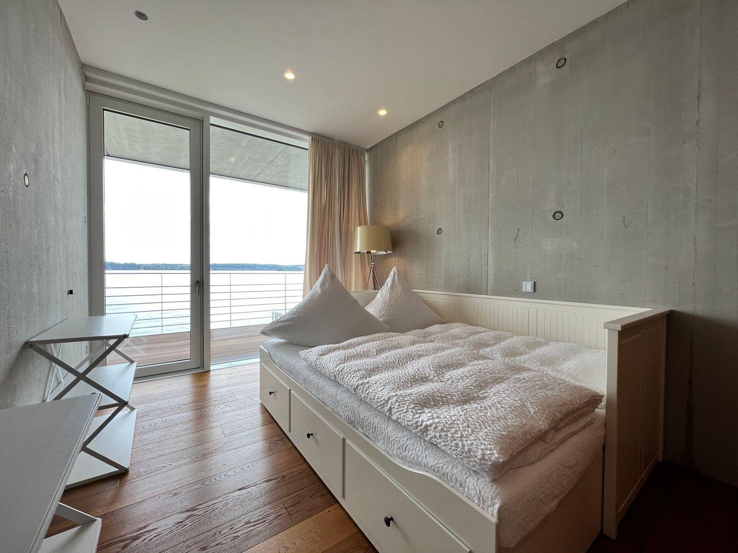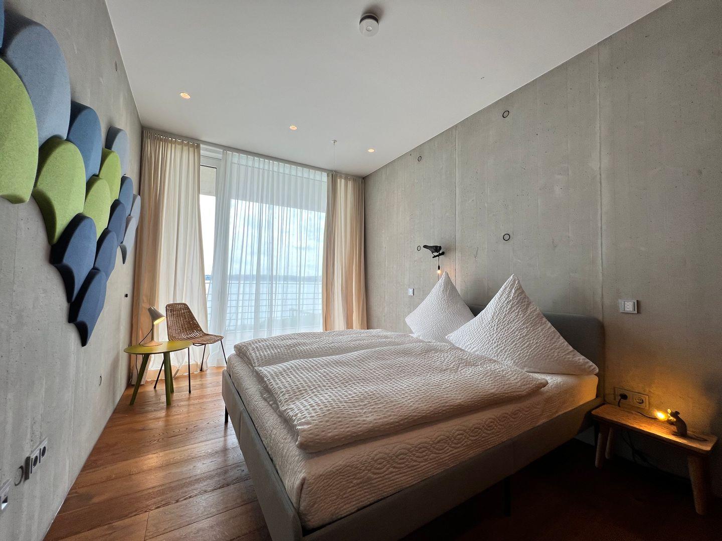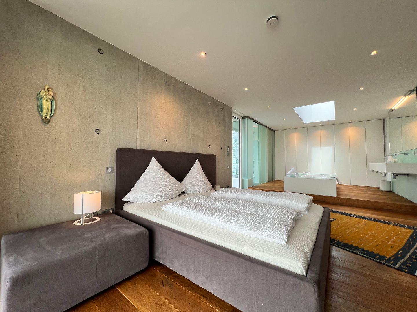 ?Im lichtdurchfluteten Master-Schlafzimmer erwartet Sie erlesenes Interieur im modernen Design und harmonischen Farben: Mit hochwertigem Kingsize-Doppelbett (180×220 cm) und Badezimmer en Suite. Das Badezimmer en Suite verfügt über eine freistehende Badewanne mit Seeblick, eine großzügige Panorama-Dusche, einen Doppelwaschtisch sowie einen abgetrennten WC-Bereich.