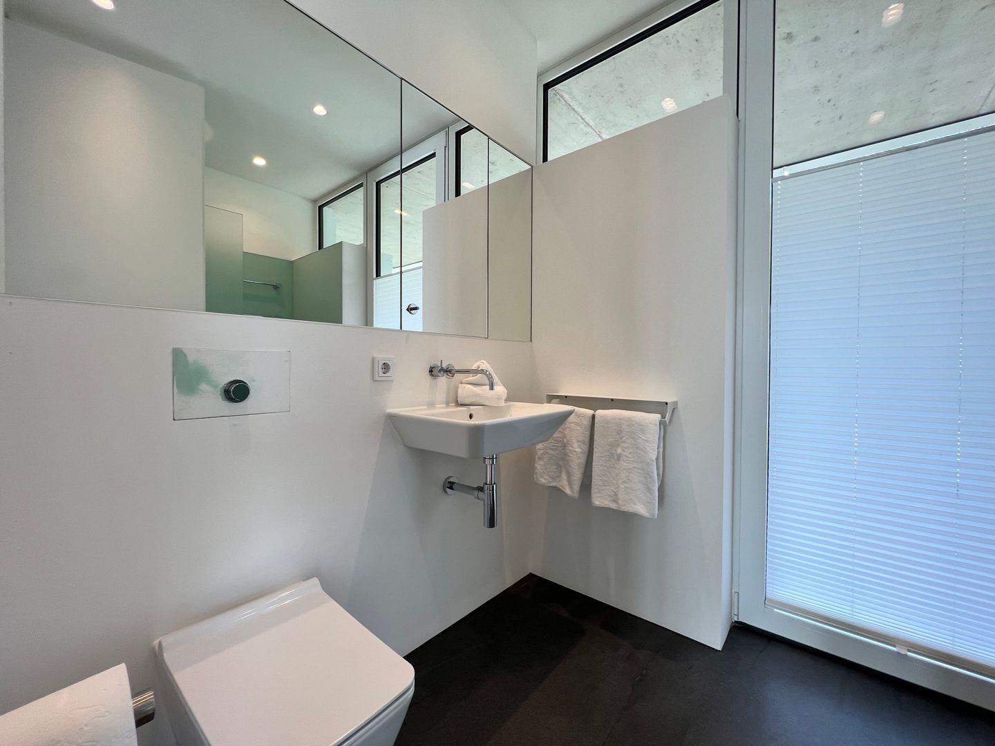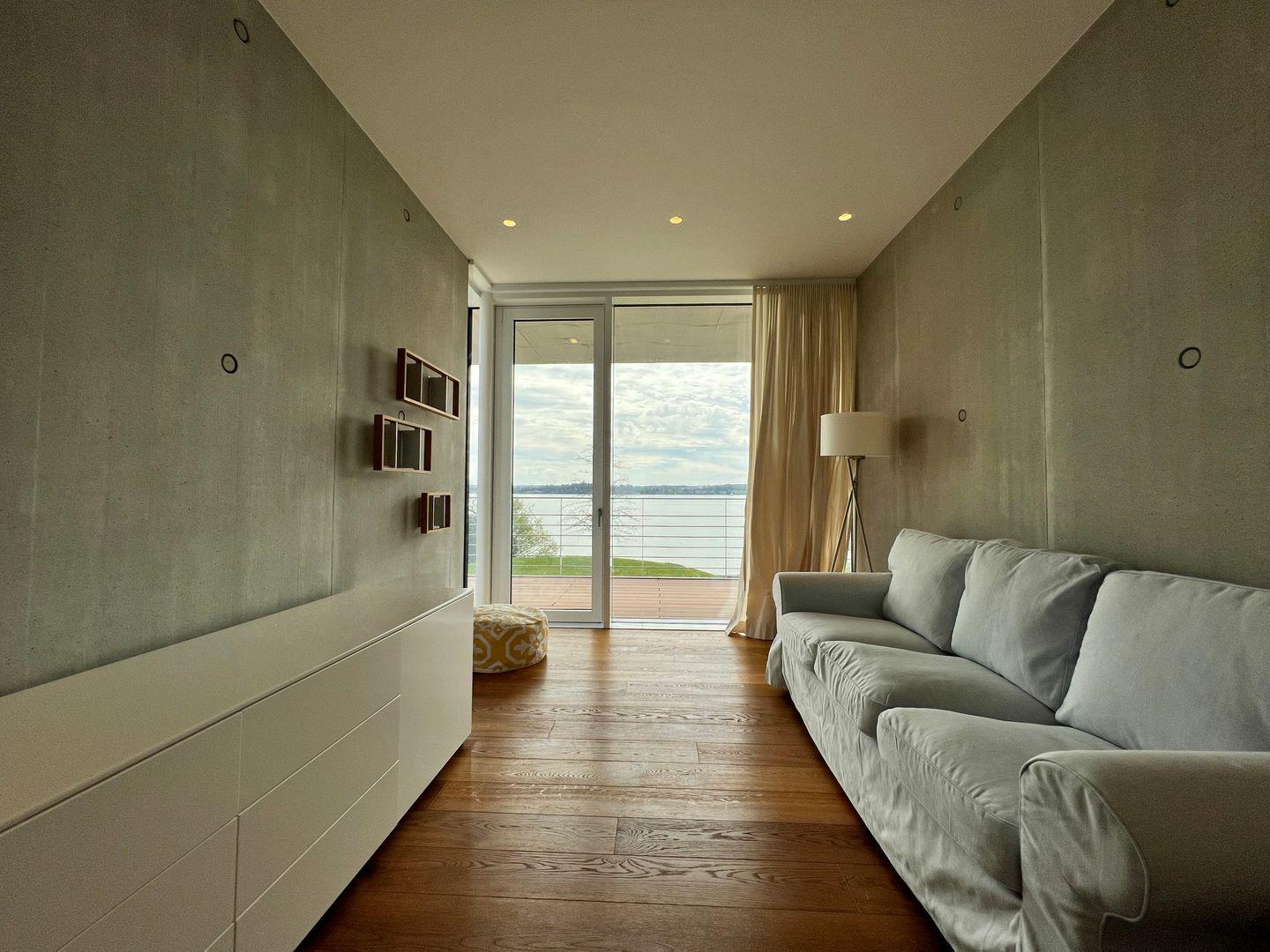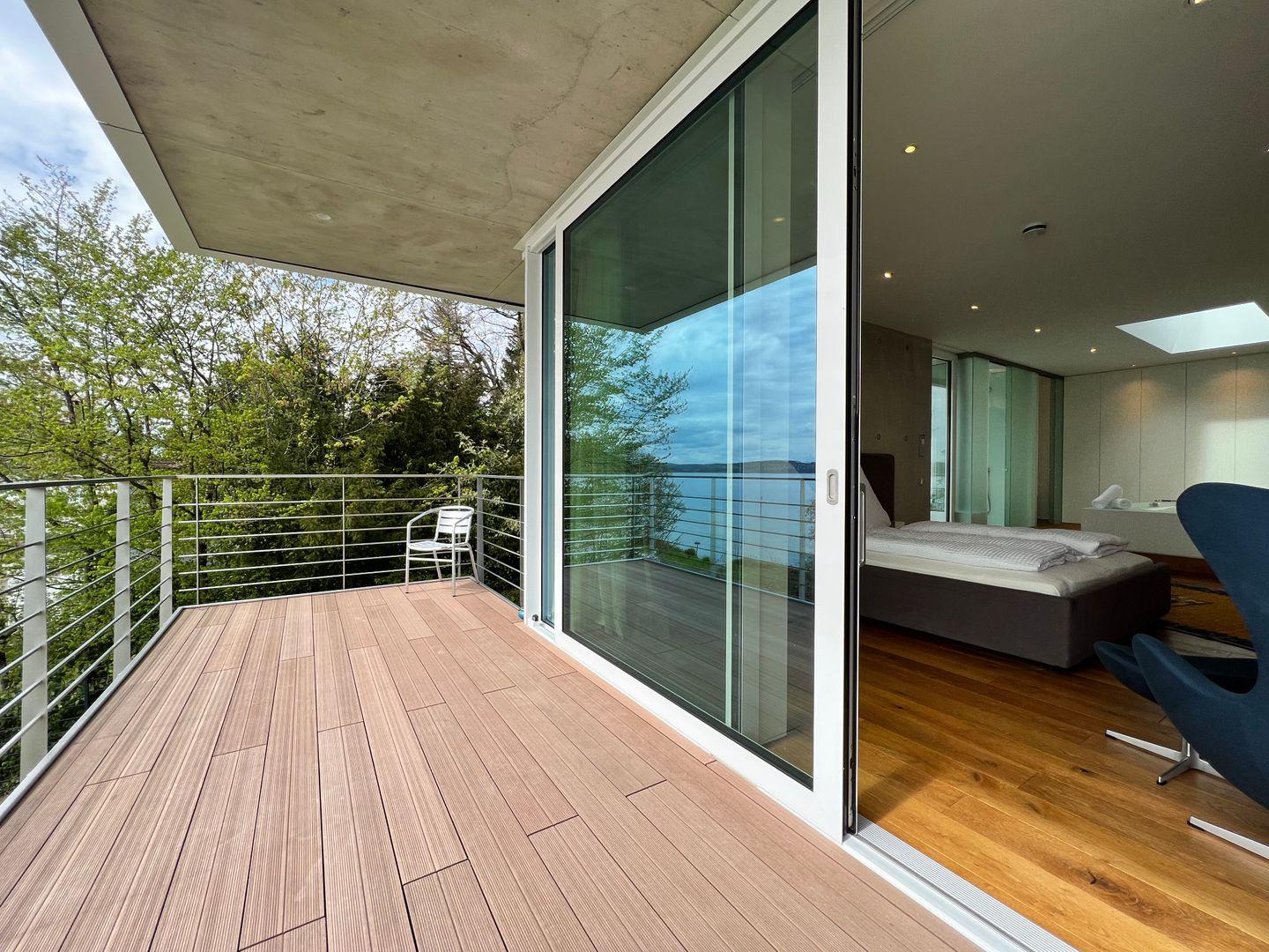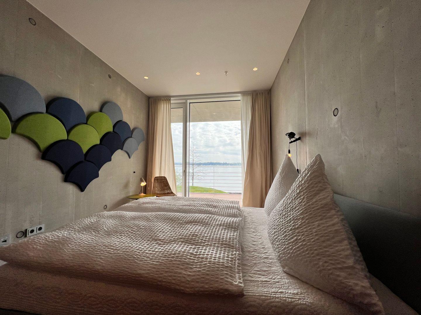 ?Im lichtdurchfluteten Master-Schlafzimmer erwartet Sie erlesenes Interieur im modernen Design und harmonischen Farben: Mit hochwertigem Kingsize-Doppelbett (180×220 cm) und Badezimmer en Suite. Das Badezimmer en Suite verfügt über eine freistehende Badewanne mit Seeblick, eine großzügige Panorama-Dusche, einen Doppelwaschtisch sowie einen abgetrennten WC-Bereich.
