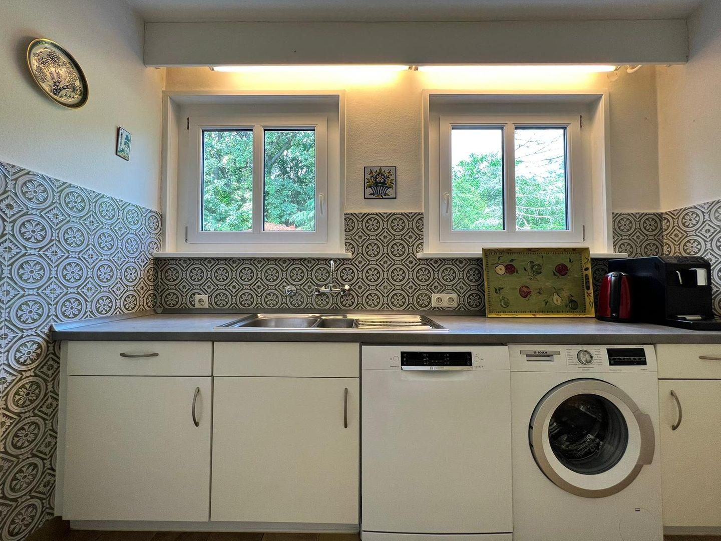 Im Erdgeschoss lädt ein großzügiges Wohnzimmer mit Kamin, komfortabler Wohnlandschaft und TV zu gemütlichen Stunden ein. Das separate Esszimmer bietet Platz für bis zu 8 Personen. Vom Erdgeschoss gelangen Sie auf die großzügige Terrasse mit Essplatz für 8 Personen, bequemen Gartenliegen und einem Außen-Kamin. Ein Holzkohlegrill steht für gesellige Grillabende zur Verfügung. Die vollausgestattete Küche mit Kühlschrank, Herd, Backofen, Kaffeevollautomat, Spülmaschine und Waschmaschine lässt keine Wünsche offen.