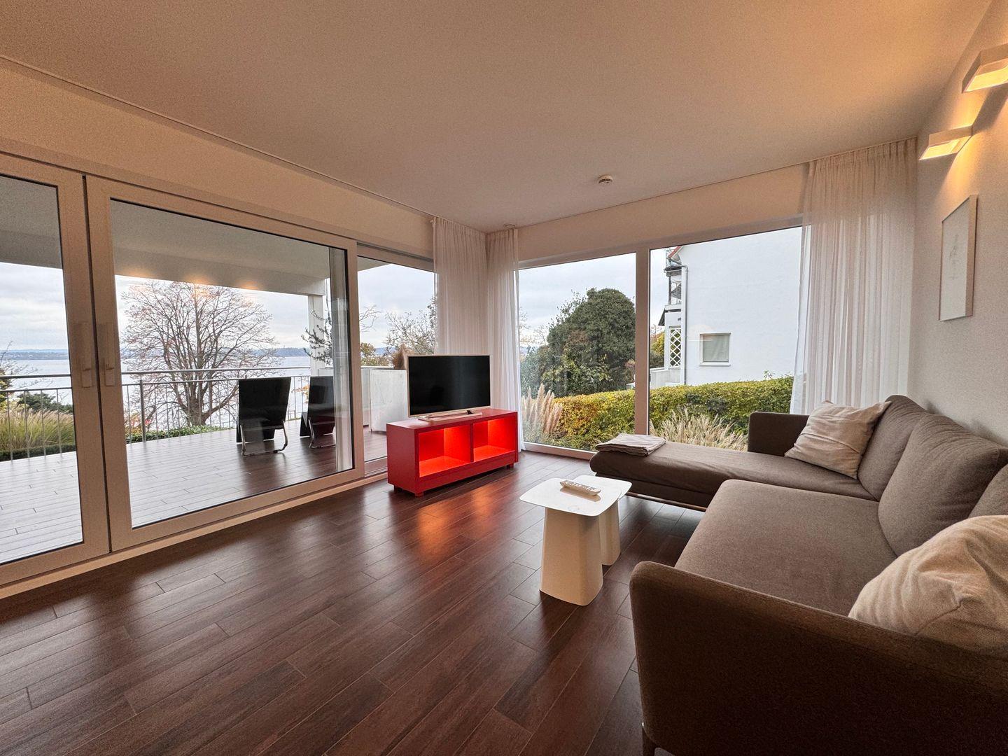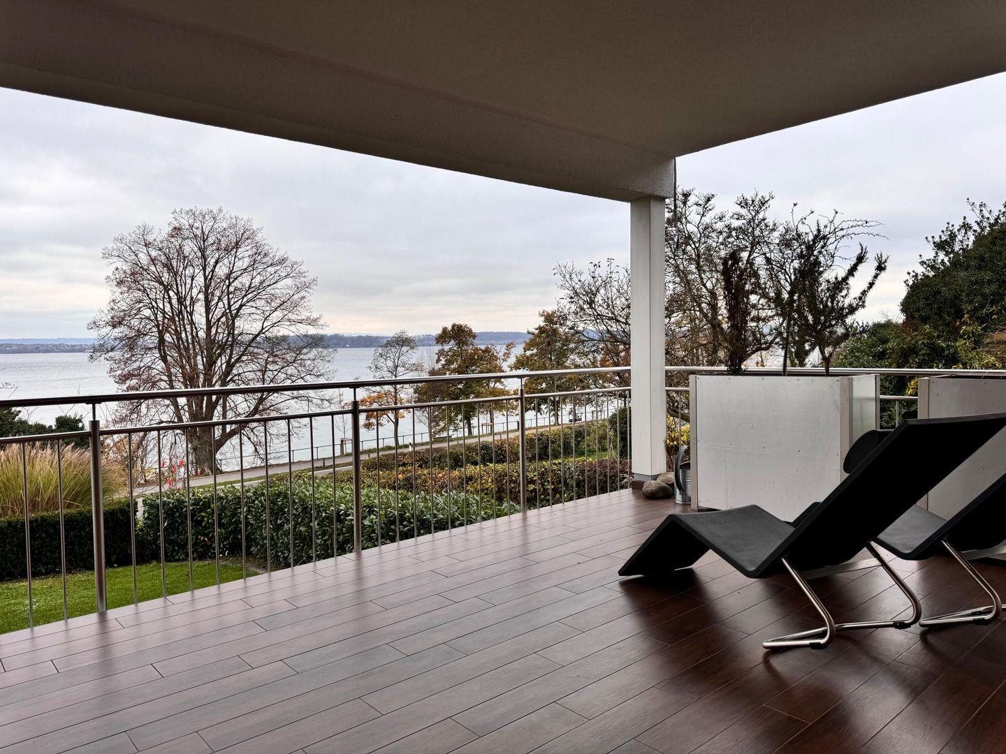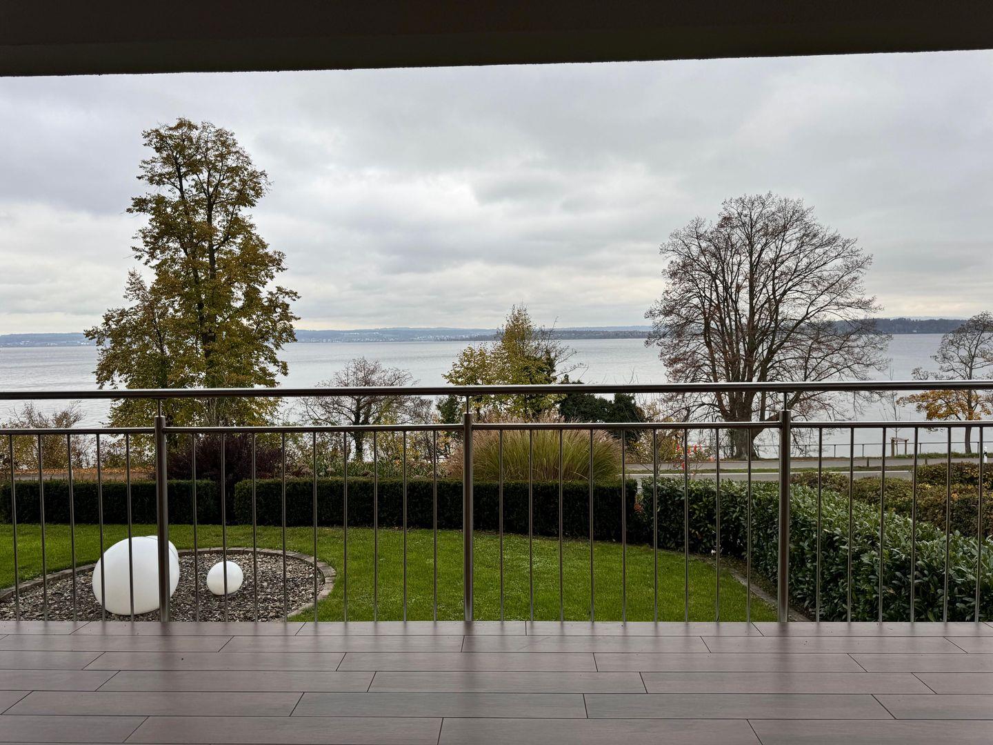 Vom überdachten, geschlossenen Balkon oder der Terrasse genießen Sie ein entspanntes Frühstück oder lassen den Tag bei herrlichem Seeblick ausklingen. Sonnenliegen und Gartenmöbel laden zum Verweilen ein. Das Apartment ist bequem per Aufzug erreichbar. Für Gäste steht ein Privatparkplatz auf dem Grundstück zur Verfügung, wobei die Nutzung eines Autos empfohlen wird.