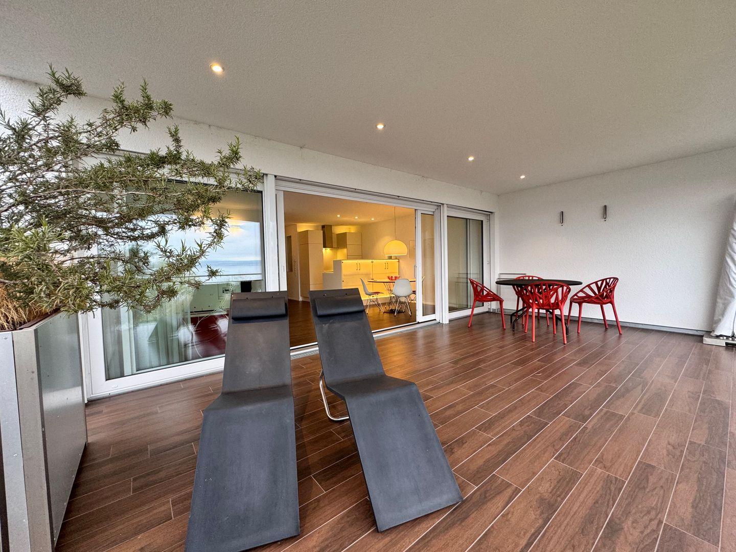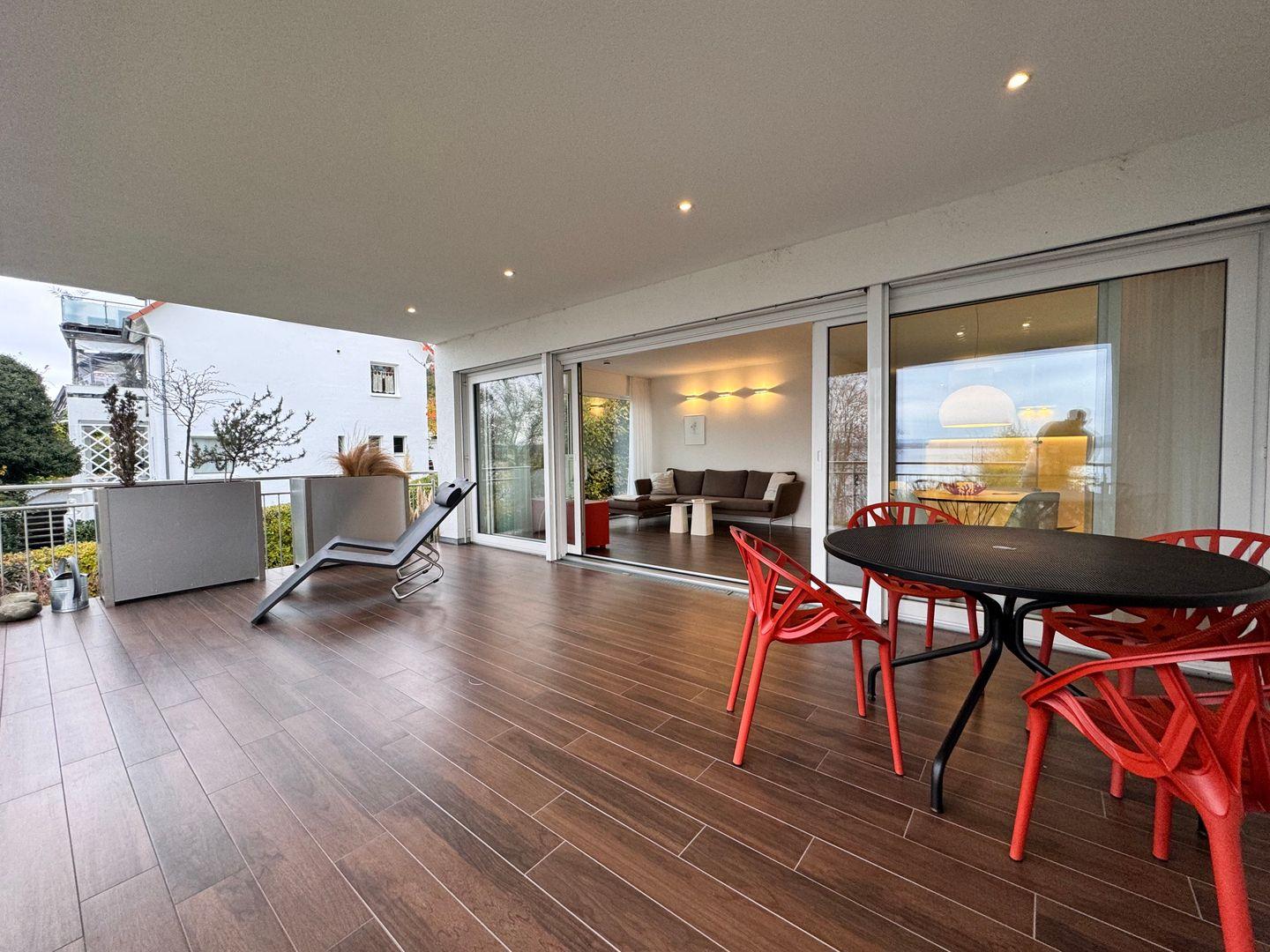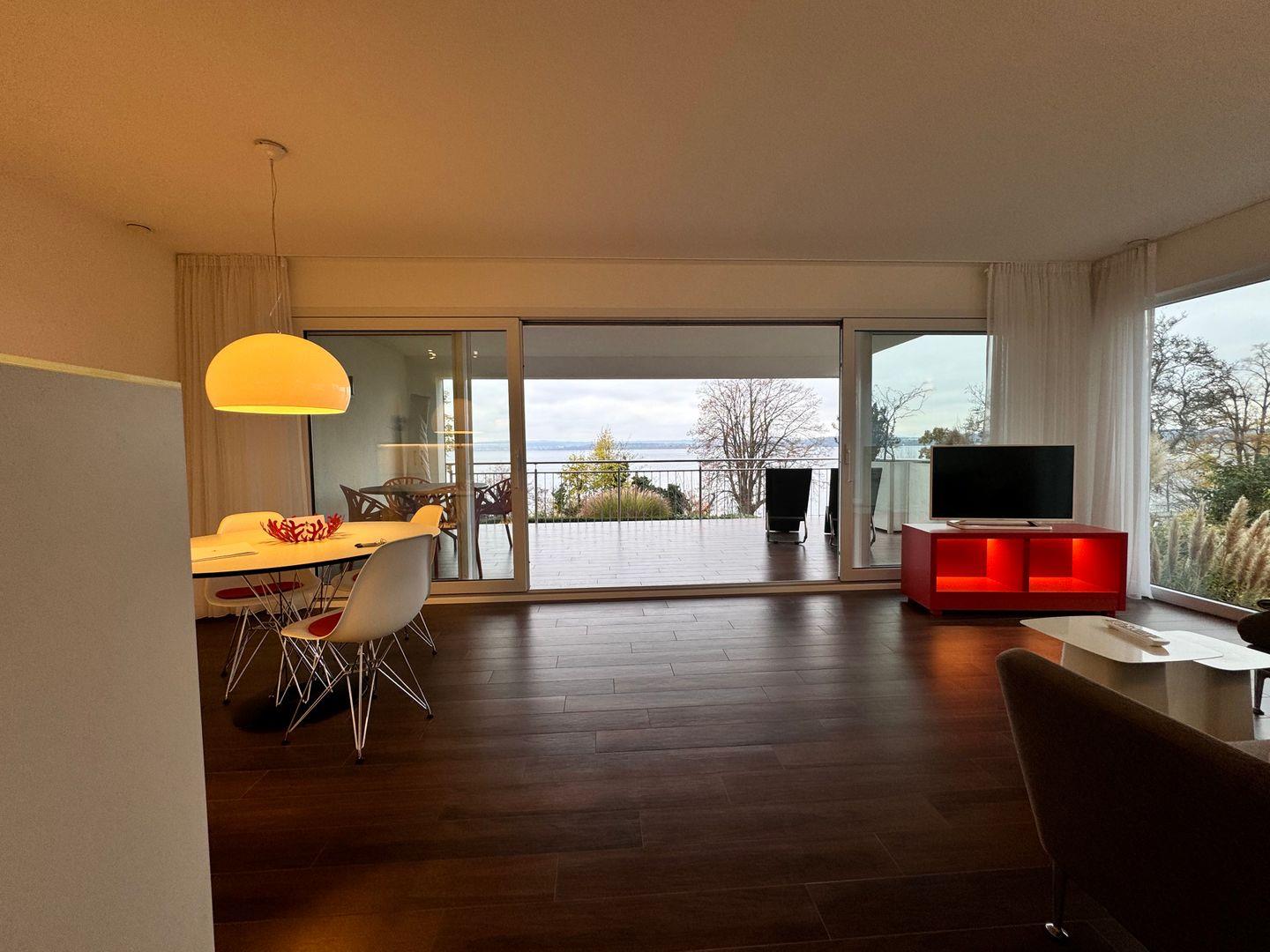 Vom überdachten, geschlossenen Balkon oder der Terrasse genießen Sie ein entspanntes Frühstück oder lassen den Tag bei herrlichem Seeblick ausklingen. Sonnenliegen und Gartenmöbel laden zum Verweilen ein. Das Apartment ist bequem per Aufzug erreichbar. Für Gäste steht ein Privatparkplatz auf dem Grundstück zur Verfügung, wobei die Nutzung eines Autos empfohlen wird.