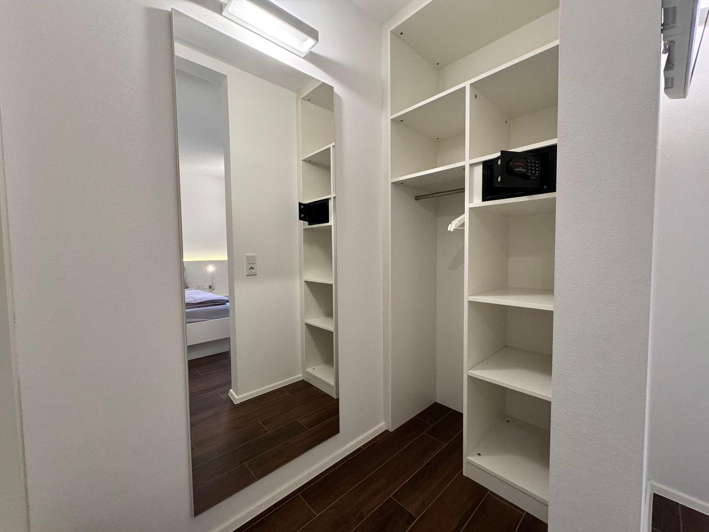 Der Zugang zu schnellem WLAN sowie ein Staubsauger sind vorhanden, sodass Sie auch längere Aufenthalte komfortabel gestalten können. Ein Feuermelder und Rauchmelder sorgen für zusätzliche Sicherheit. Für die Aufbewahrung Ihrer Garderobe steht eine geräumige Garderobe zur Verfügung, ein Ganzkörperspiegel rundet das Angebot ab.
