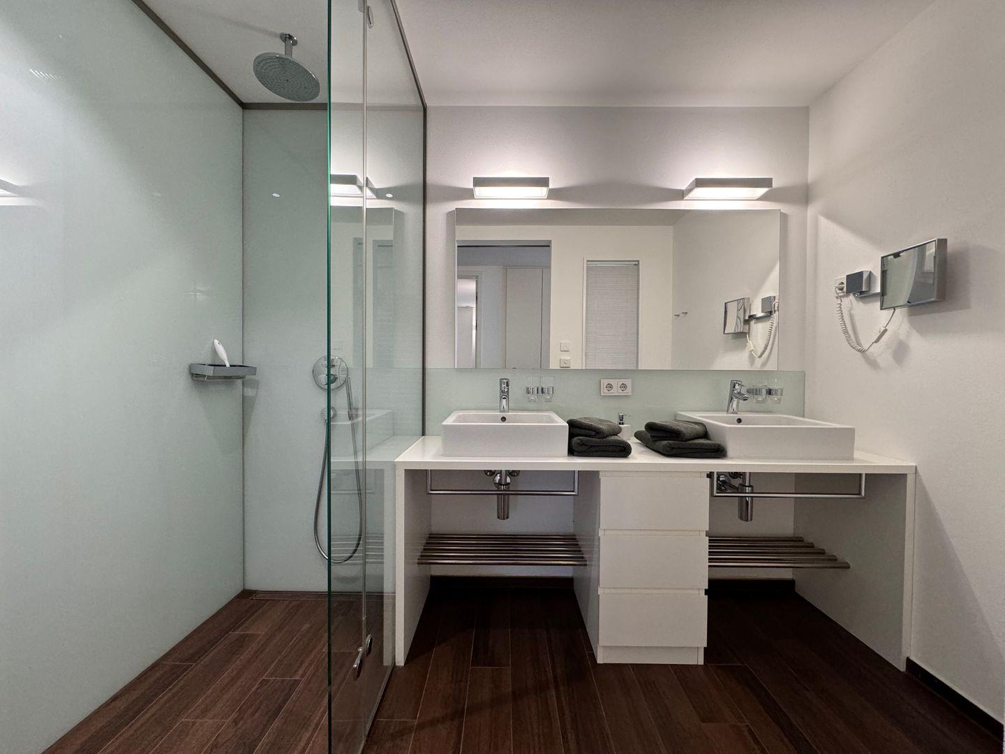 Das Badezimmer ist mit einer bodengleichen Dusche, Waschbecken, Spiegel, Kosmetikspiegel und Haartrockner modern und funktional ausgestattet. Zusätzlich steht Ihnen ein Gäste-WC zur Verfügung. Fußbodenheizung und Zentralheizung sorgen im gesamten Apartment für wohlige Wärme, unabhängig von der Jahreszeit.