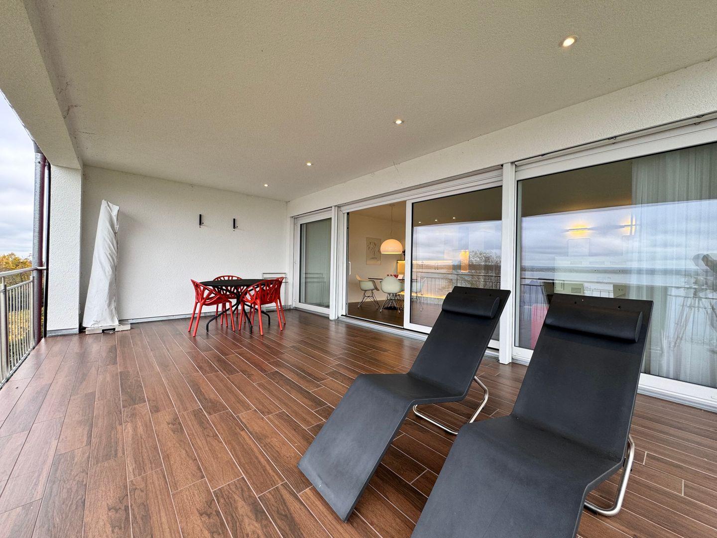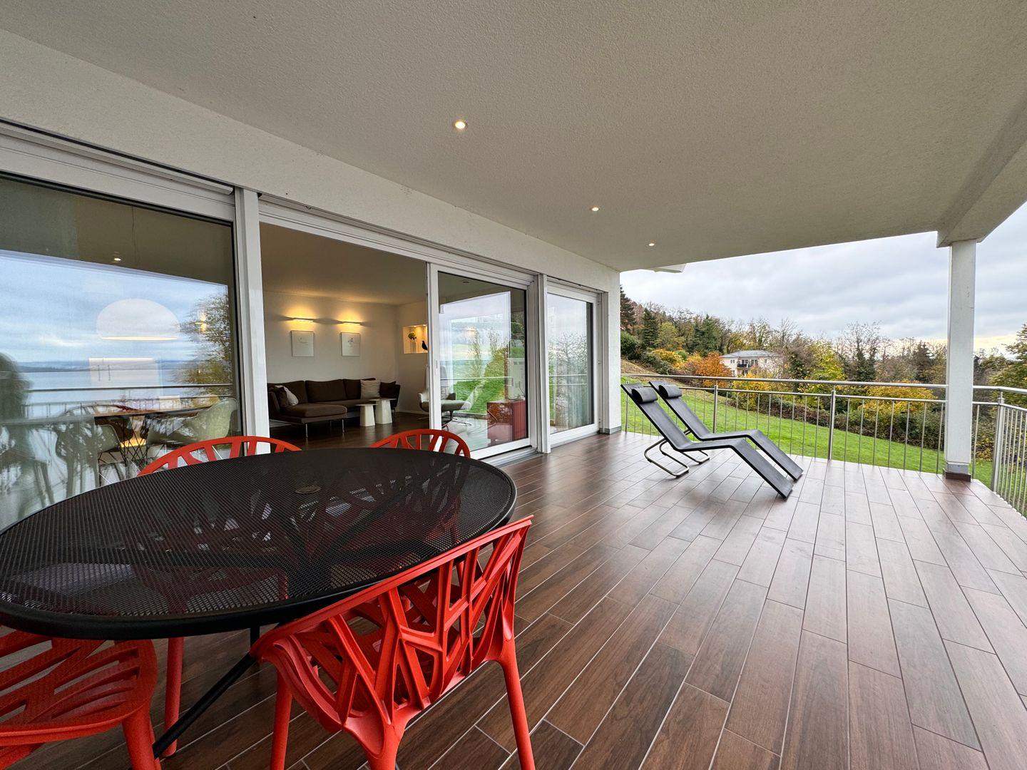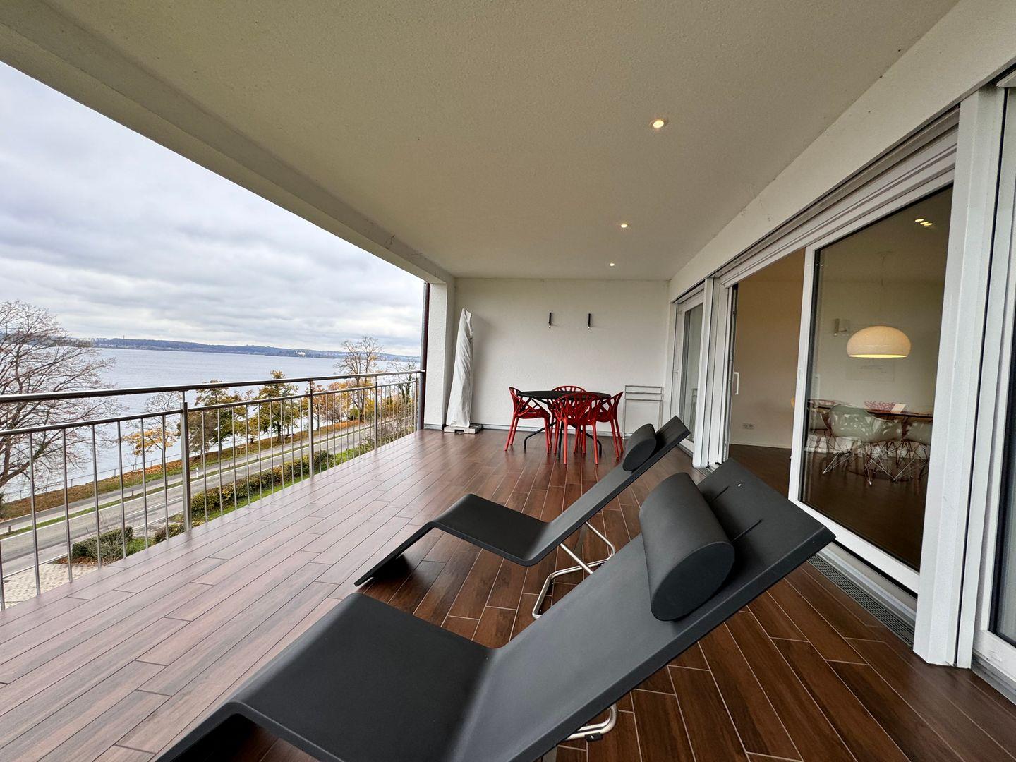 Der geschlossene und überdachte Balkon ist mit Gartenmöbeln und Sonnenliegen ausgestattet und bietet zu jeder Tageszeit einen privaten Rückzugsort mit Seeblick, Gartenblick sowie Blick auf die umliegende ländliche Kulisse. Durch den Sichtschutz an allen Fenstern wird Ihre Privatsphäre optimal gewahrt.