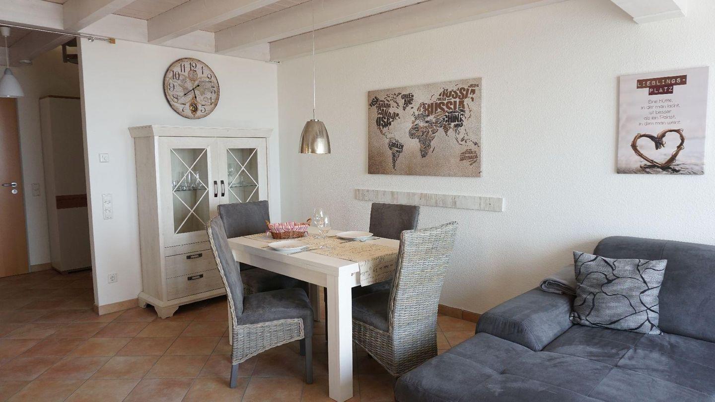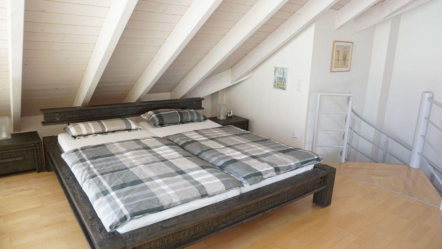 Die Wohnung erstreckt sich über zwei Ebenen. Im unteren Bereich befinden sich der Wohn- und Essbereich sowie die offene Küche mit Bartresen und Barhockern, die zum gemeinsamen Kochen und Verweilen einlädt. Über eine Wendeltreppe gelangen Sie in den oberen Bereich mit dem offenen Schlafbereich unter dem Dach. Sichtbare Holzbalken und die gemütliche Gestaltung schaffen hier eine besonders behagliche Atmosphäre.