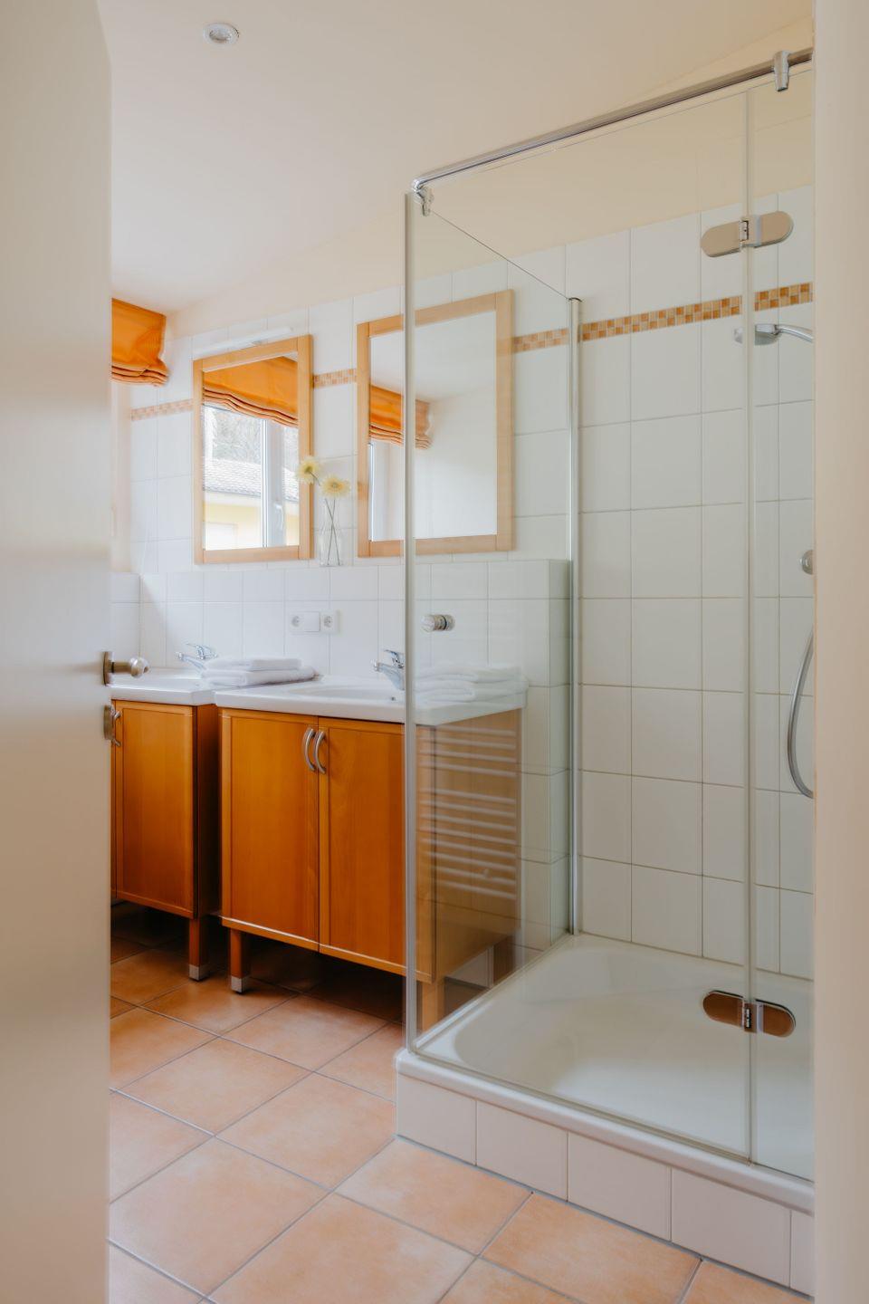 Das moderne Badezimmer überzeugt durch Helligkeit, klare Linien und eine großzügige Dusche. Hochwertige Materialien und eine gepflegte Ausstattung unterstreichen den wohnlichen Charakter des Hauses und sorgen auch hier für ein angenehmes Wohlgefühl.