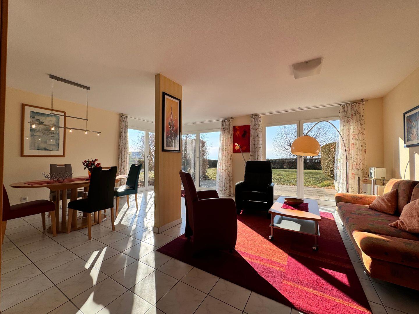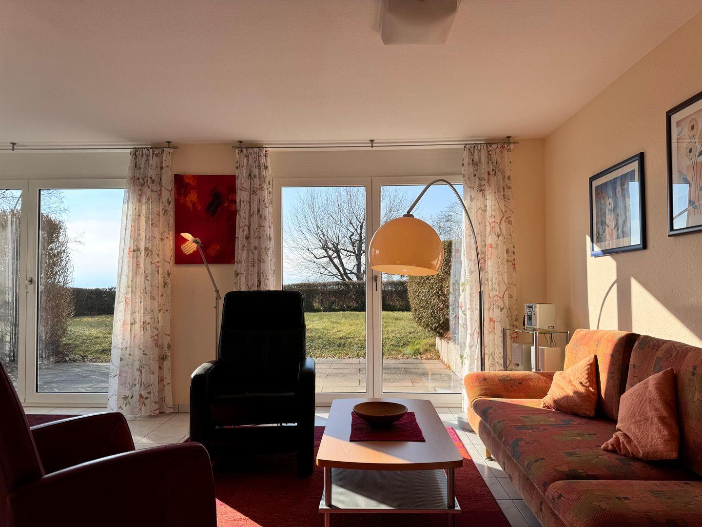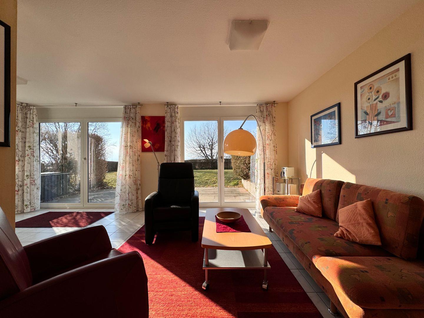 Unsere 76 Quadratmeter große Ferienwohnung bietet Platz für bis zu drei Personen, ein Schlafzimmer, ein Badezimmer mit Dusche und Badewanne, eine voll ausgestattete Küche, ein Wohnzimmer mit Schlafcouch, eine Terrasse mit Teilseeblick, einen Tiefgaragenstellplatz und eine gemeinschaftliche Liegewiese.