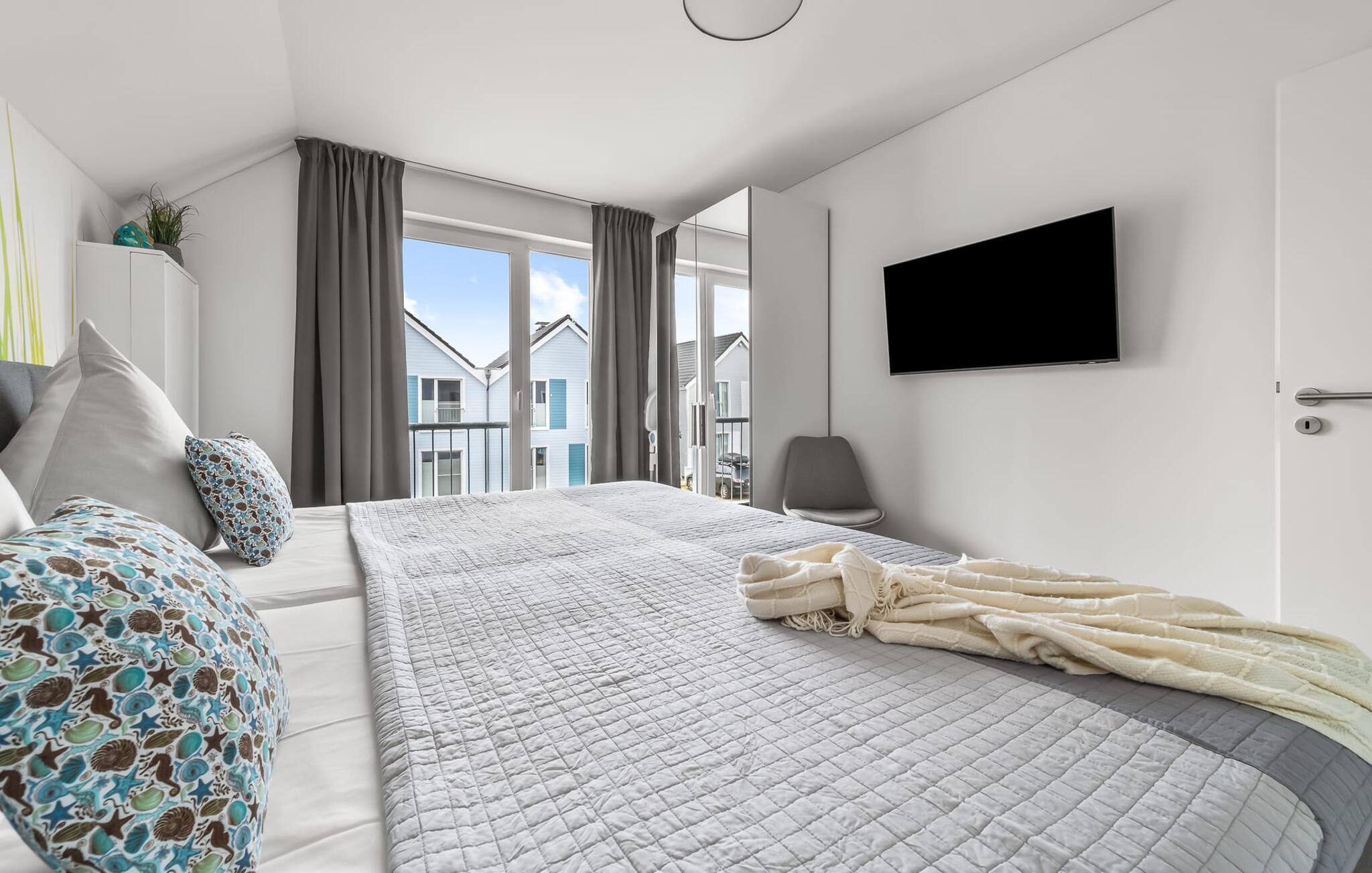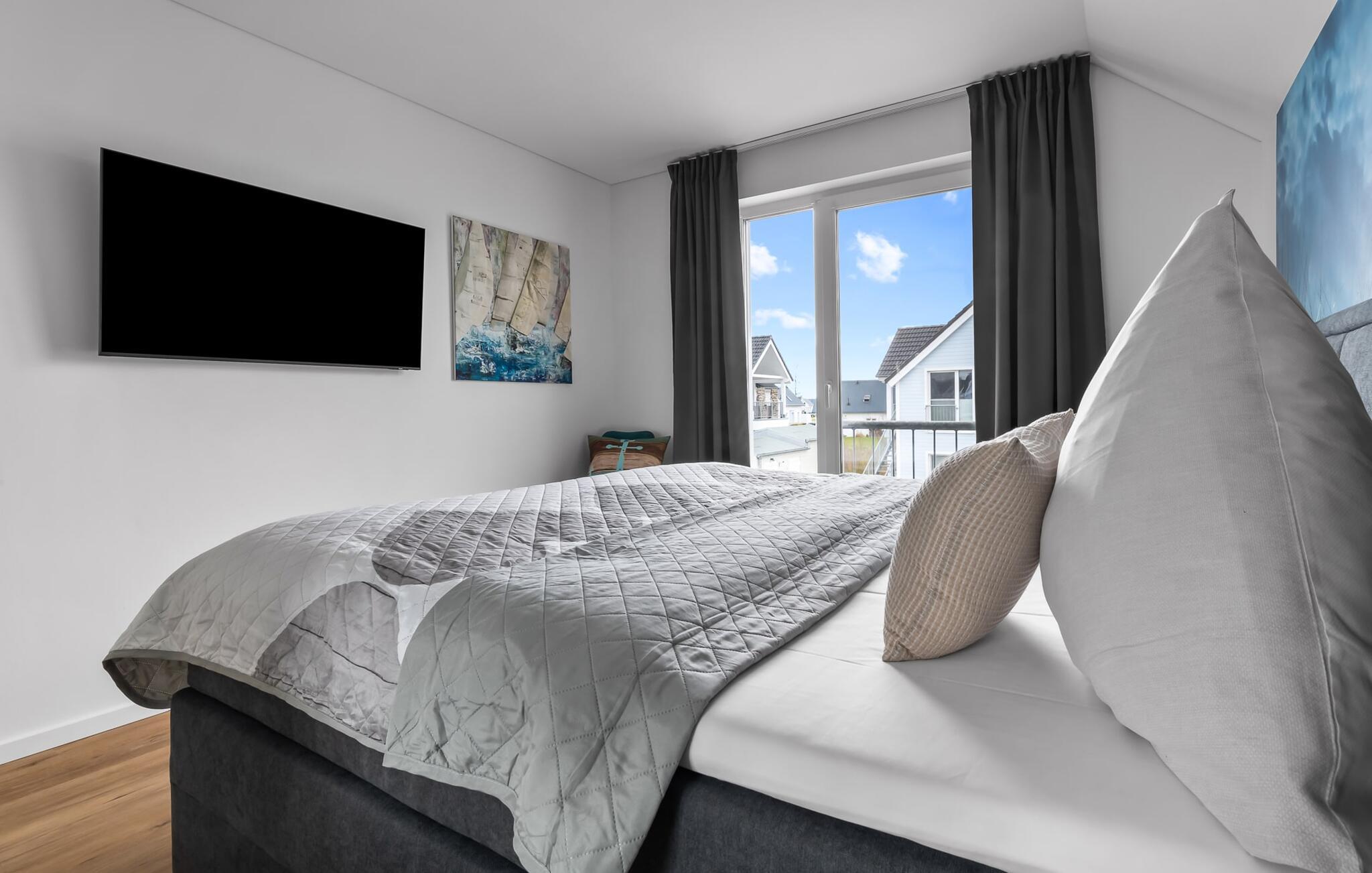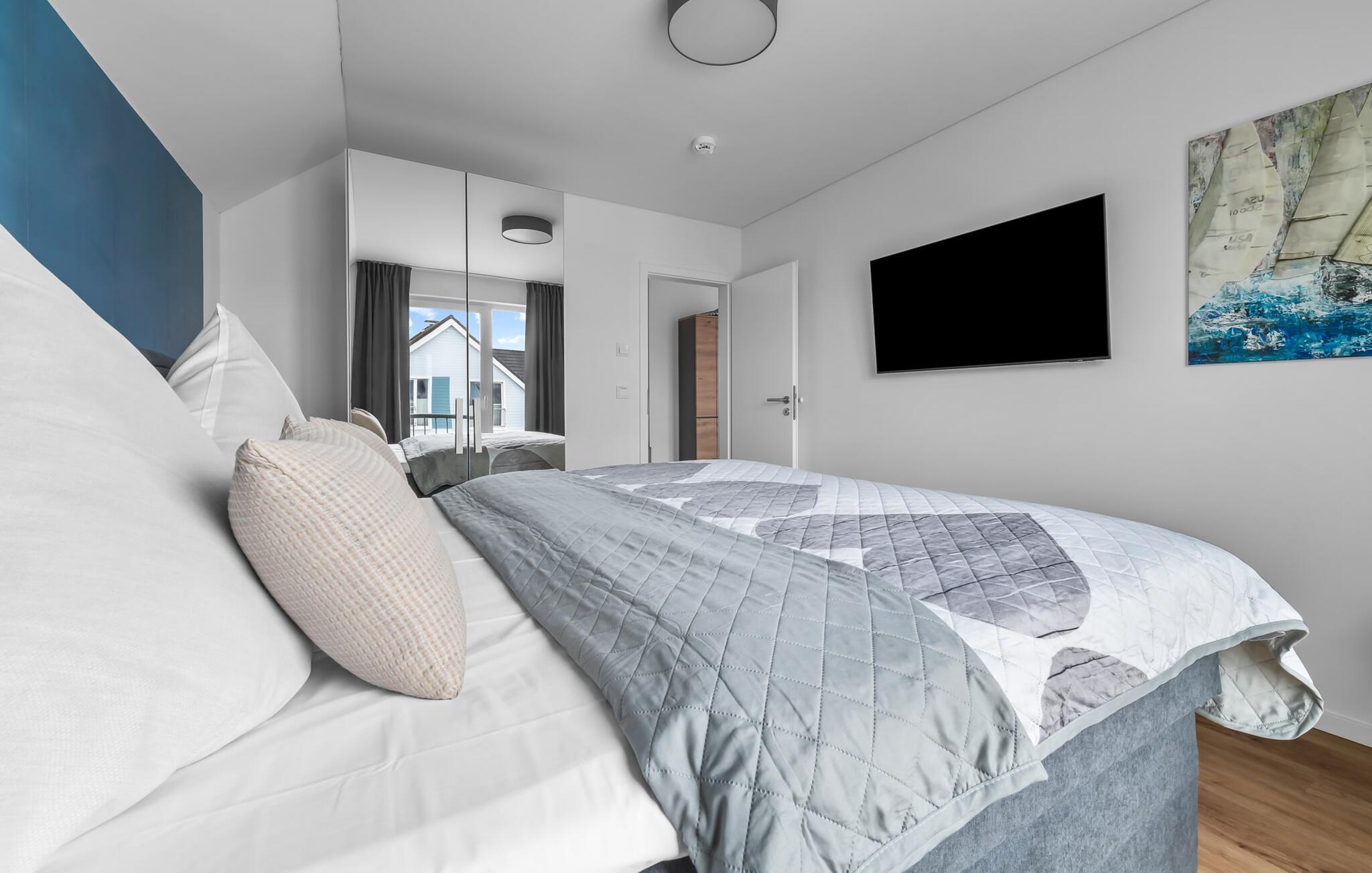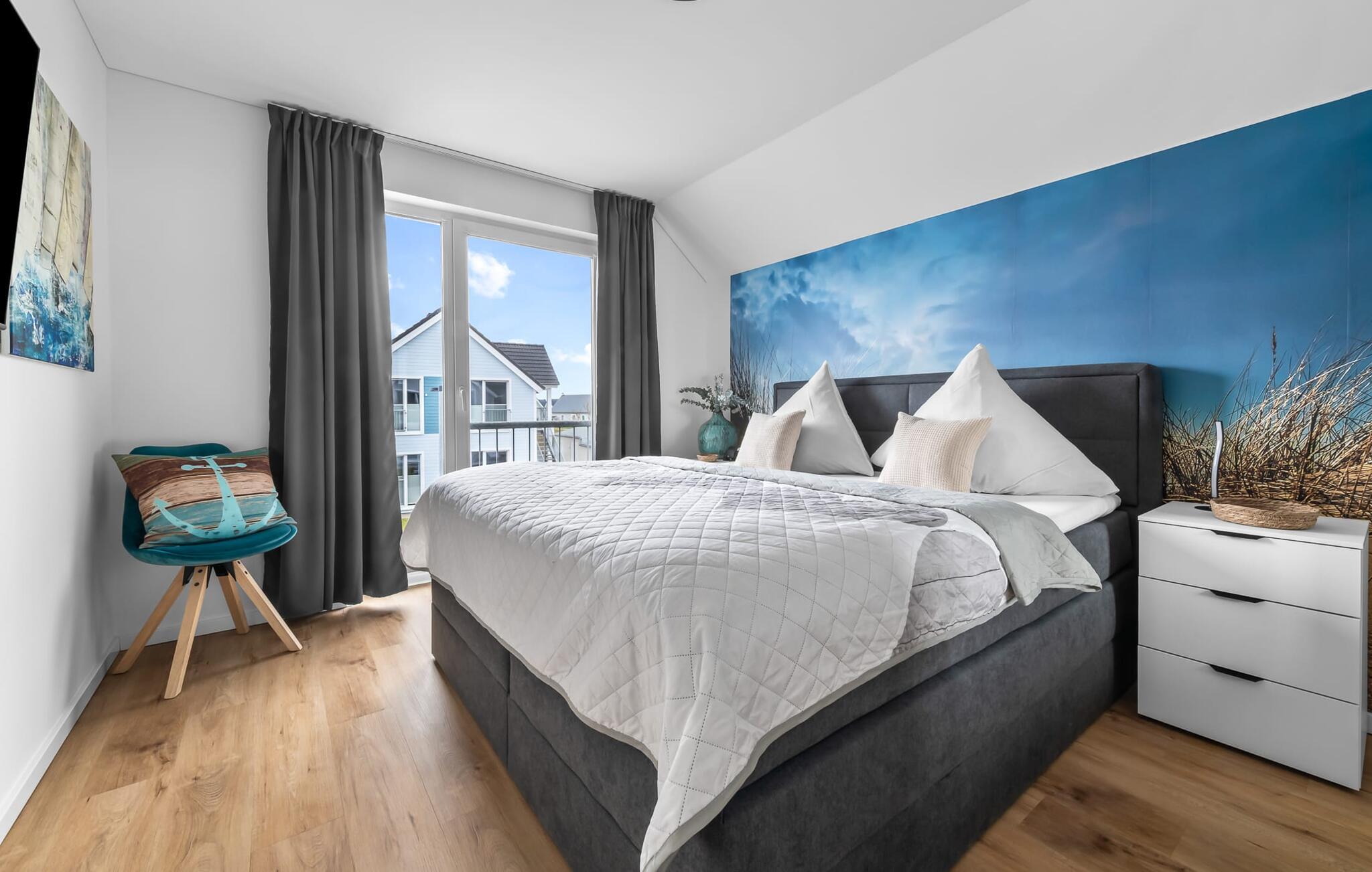 MEERVERLIEBT er en rummelig og rummelig ferielejlighed på øverste etage, der imponerer med indretning af høj kvalitet og elegant indretning. Her kan I nyde jeres ferie fuldt ud og tilbringe afslappende timer i en strandstol. Sandstranden Weidefelder med kiosk, restaurant og strandstole ligger i gåafstand og er et attraktivt rejsemål på alle tider af året. Ligeledes i umiddelbar nærhed ligger en minigolfbane med maritimt tema, som både store og små nydes. Den livlige havnepromenade med indkøbsmuligheder og lystbådehavnen ligger også i nærheden af MEERVERLIEBT. Den åbne stue/spisestue med gulv-til-loft vinduer og tilstødende stor terrasse er hjertet af MEERVERLIEBT og imponerer med sin middelhavsflair og moderne indretning. Når I træder ind i rummet føler I jer straks hjemme og kan slappe af i den komfortable opholdsstue, nyde naturens fred og ro gennem vinduet eller se tv - et perfekt miljø til ren afslapning og rekreation! Boligarealet kan åbnes op, hvis det er nødvendigt. Sengen (190 x 200) har springmadrasser og lamelbund. På ferien er der masser af tid til kreativ madlavning, og det fuldt udstyrede, moderne køkken-alrum lader intet tilbage at ønske. Bagefter kan I nyde lækkerierne på terrassen eller starte en hyggelig grillaften - den perfekte ferie! Fra opholdsområdet kan I gå direkte til den store terrasse, med en behagelig strandstol, som tilbyder jer afslappende timer væk fra hverdagens stress og jag. Der er også en anden terrasse foran indgangspartiet med et behageligt opholdsområde, der inviterer jer til at slappe af. Der er to soveværelser til rådighed for en god nats søvn. Det første soveværelse er udstyret med en komfortabel boxmadras, mens det andet soveværelse med to individuelle boxmadrasser sikrer afslappende nætter. Begge soveværelser har også et QLED Smart TV med Magenta TV. Der er selvfølgelig også plads til de yngste gæster, en barneseng og en høj stol er til rådighed. Der er også et udfoldelig puslebord fastgjort til væggen. Efter en begivenhedsrig dag vil et brusebad på gulvniveau og en infrarød sauna forkæle jer med afslappende stunder og velvære. Den perfekte afslutning på en vellykket feriedag. For all-round komfort finder I også jeres egen parkeringsplads og et aflåseligt cykelskur foran ferielejligheden. Vores favoritsted: Den infrarøde sauna og pejsen, som sikrer perfekt afslapning, især efter en hel dags ferie. Bemærk venligst, at OstseeResort Olpenitz stadig er under opførelse. På grund byggearbejdet af husene kan udendørsfaciliteterne og bygningstætheden ændre sig og afvige fra de viste billeder. Lejeprisen er allerede beregnet på baggrund af denne byggesituation, hvorfor yderligere rabatter ikke er muligt.