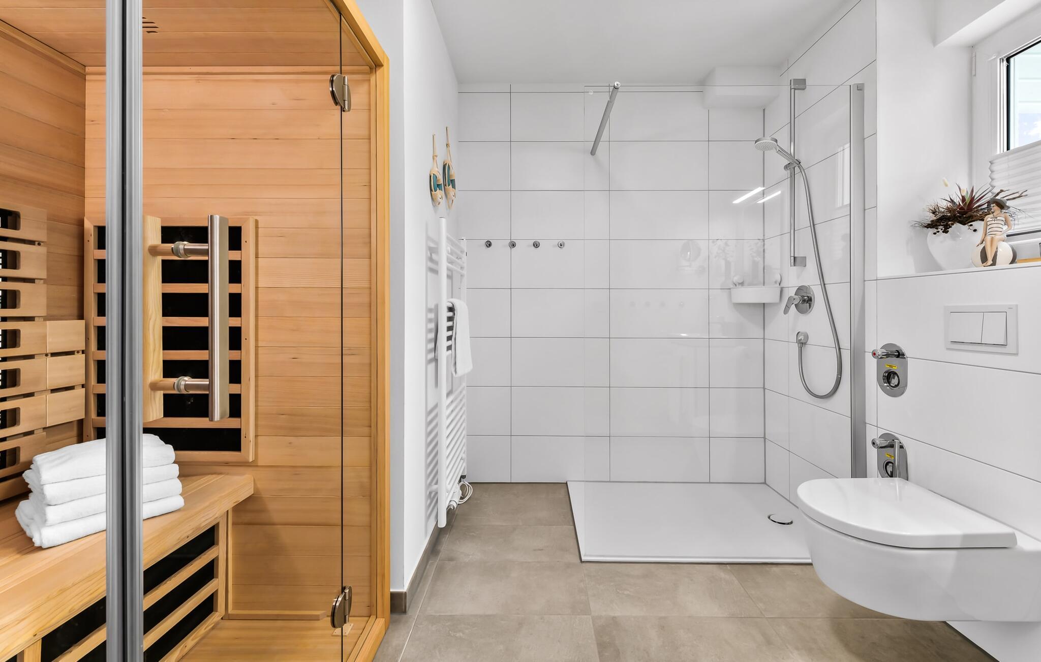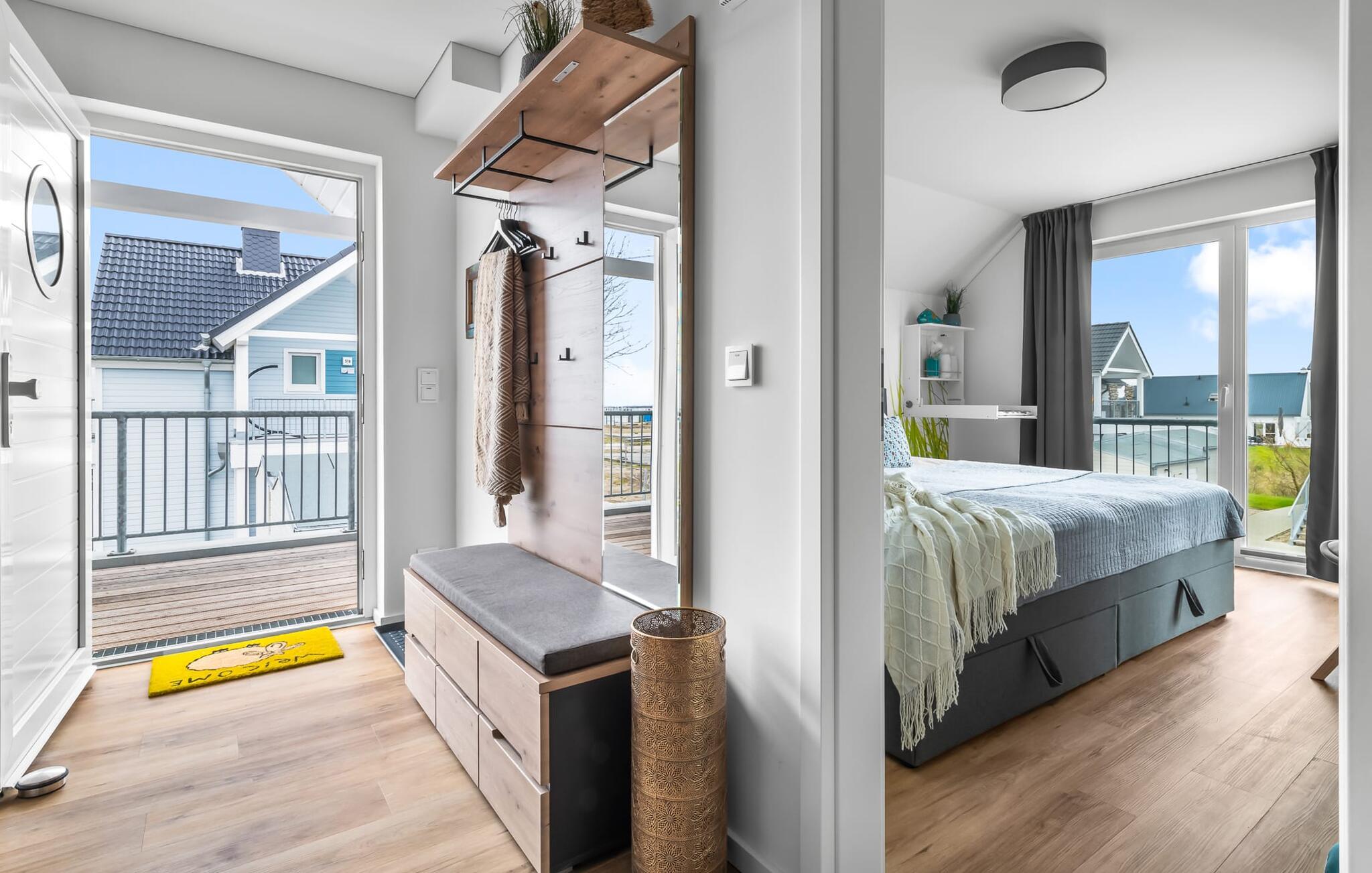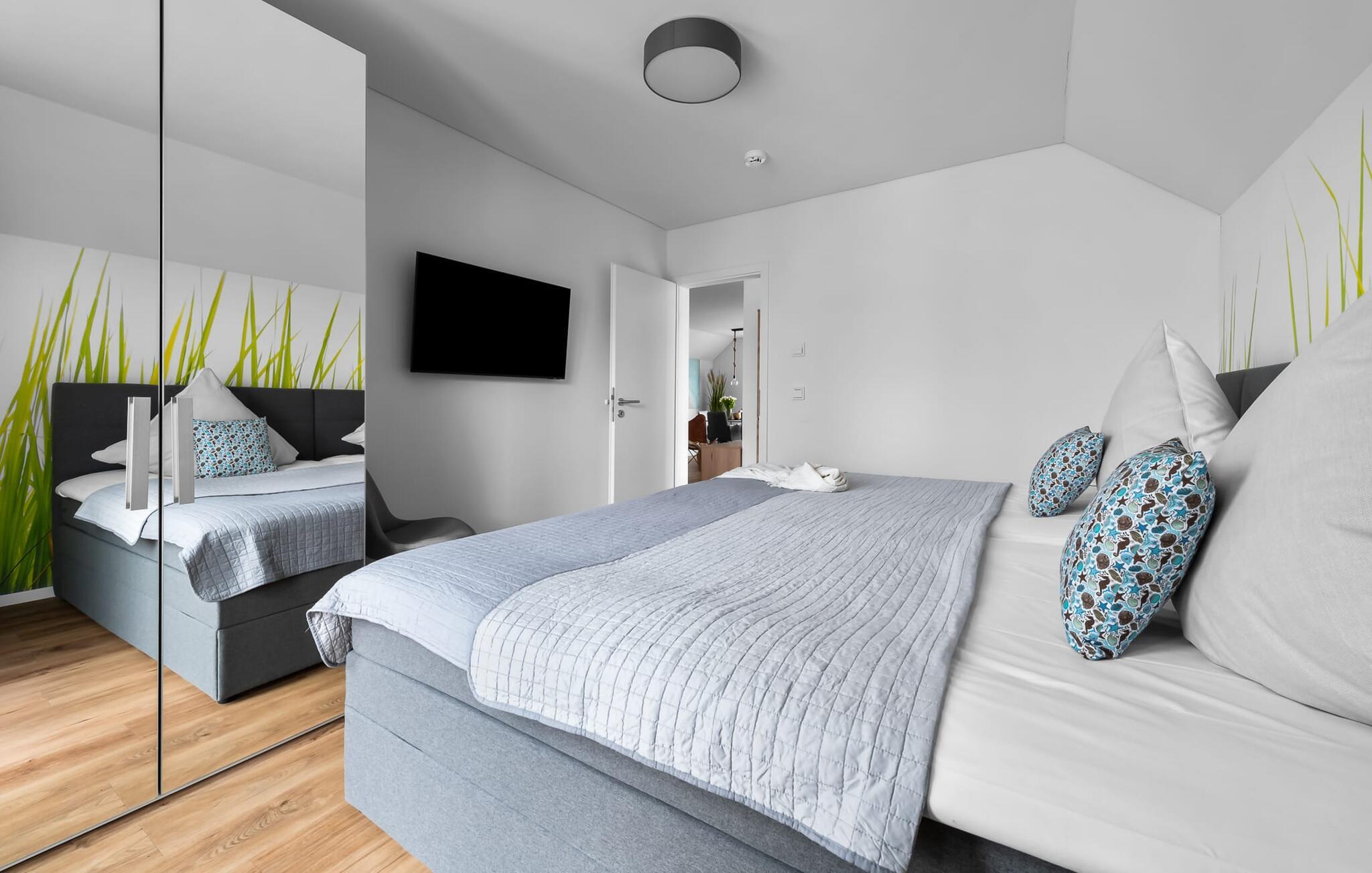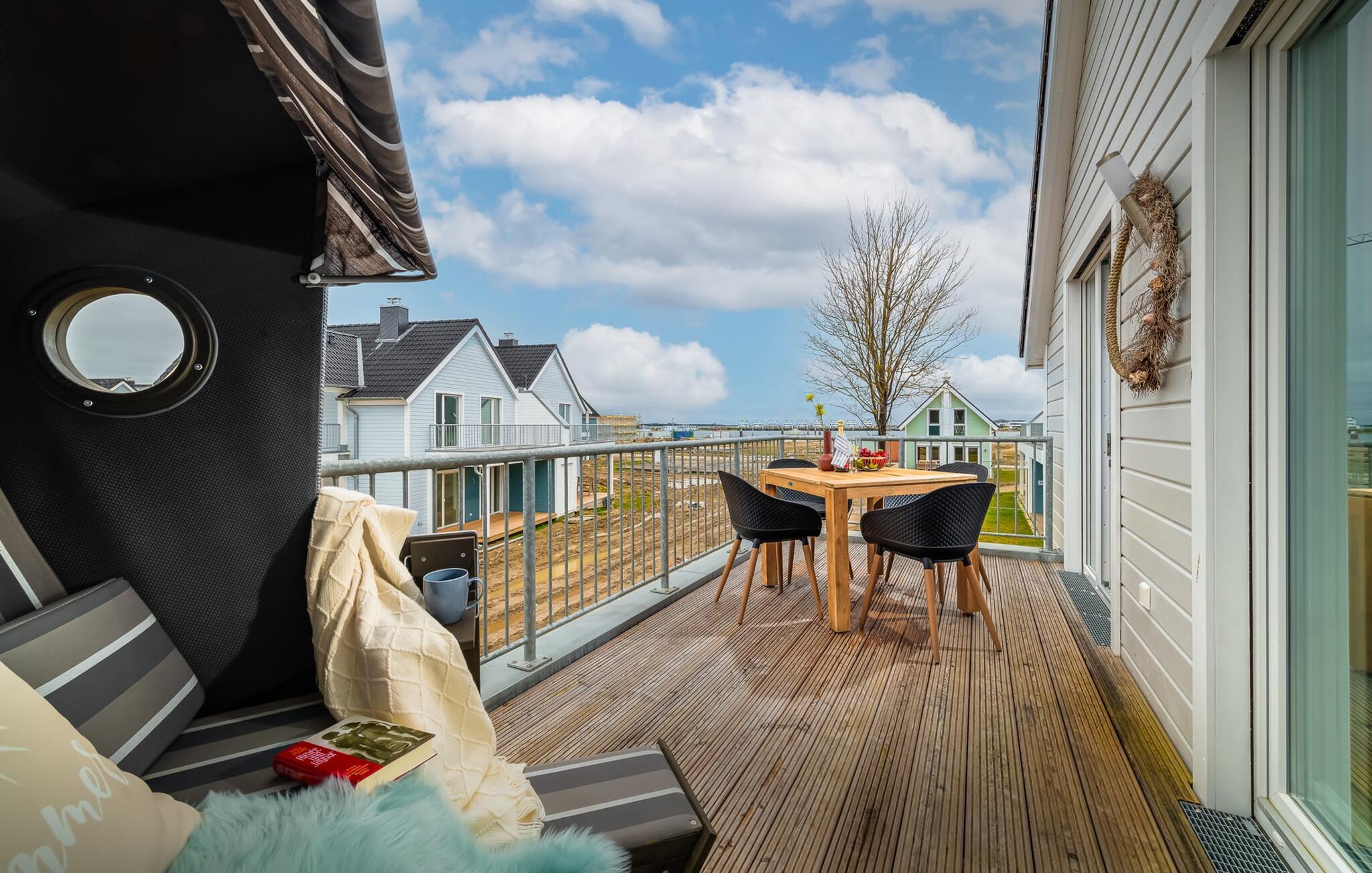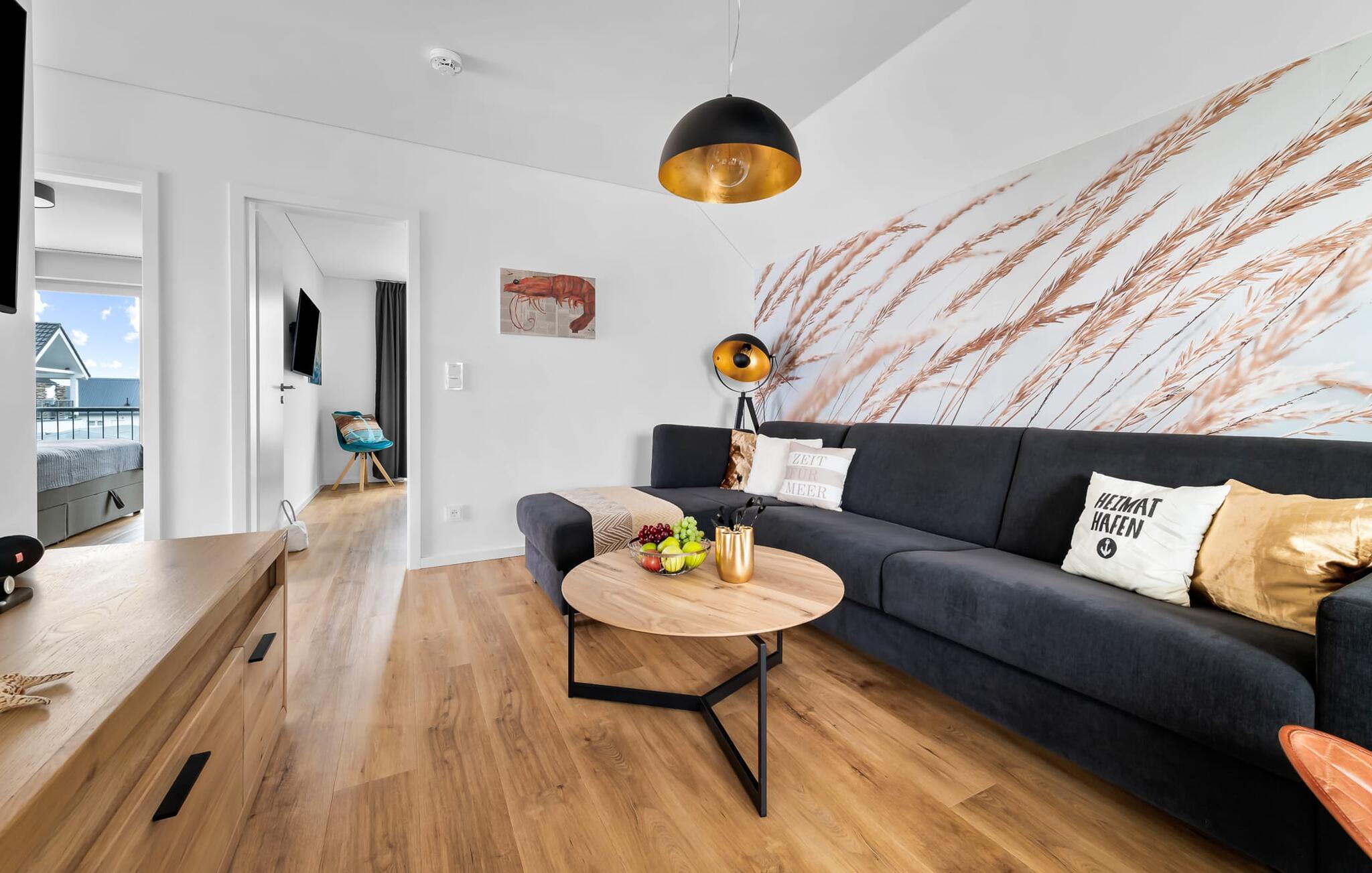 MEERVERLIEBT er en rummelig og rummelig ferielejlighed på øverste etage, der imponerer med indretning af høj kvalitet og elegant indretning. Her kan I nyde jeres ferie fuldt ud og tilbringe afslappende timer i en strandstol. Sandstranden Weidefelder med kiosk, restaurant og strandstole ligger i gåafstand og er et attraktivt rejsemål på alle tider af året. Ligeledes i umiddelbar nærhed ligger en minigolfbane med maritimt tema, som både store og små nydes. Den livlige havnepromenade med indkøbsmuligheder og lystbådehavnen ligger også i nærheden af MEERVERLIEBT. Den åbne stue/spisestue med gulv-til-loft vinduer og tilstødende stor terrasse er hjertet af MEERVERLIEBT og imponerer med sin middelhavsflair og moderne indretning. Når I træder ind i rummet føler I jer straks hjemme og kan slappe af i den komfortable opholdsstue, nyde naturens fred og ro gennem vinduet eller se tv - et perfekt miljø til ren afslapning og rekreation! Boligarealet kan åbnes op, hvis det er nødvendigt. Sengen (190 x 200) har springmadrasser og lamelbund. På ferien er der masser af tid til kreativ madlavning, og det fuldt udstyrede, moderne køkken-alrum lader intet tilbage at ønske. Bagefter kan I nyde lækkerierne på terrassen eller starte en hyggelig grillaften - den perfekte ferie! Fra opholdsområdet kan I gå direkte til den store terrasse, med en behagelig strandstol, som tilbyder jer afslappende timer væk fra hverdagens stress og jag. Der er også en anden terrasse foran indgangspartiet med et behageligt opholdsområde, der inviterer jer til at slappe af. Der er to soveværelser til rådighed for en god nats søvn. Det første soveværelse er udstyret med en komfortabel boxmadras, mens det andet soveværelse med to individuelle boxmadrasser sikrer afslappende nætter. Begge soveværelser har også et QLED Smart TV med Magenta TV. Der er selvfølgelig også plads til de yngste gæster, en barneseng og en høj stol er til rådighed. Der er også et udfoldelig puslebord fastgjort til væggen. Efter en begivenhedsrig dag vil et brusebad på gulvniveau og en infrarød sauna forkæle jer med afslappende stunder og velvære. Den perfekte afslutning på en vellykket feriedag. For all-round komfort finder I også jeres egen parkeringsplads og et aflåseligt cykelskur foran ferielejligheden. Vores favoritsted: Den infrarøde sauna og pejsen, som sikrer perfekt afslapning, især efter en hel dags ferie. Bemærk venligst, at OstseeResort Olpenitz stadig er under opførelse. På grund byggearbejdet af husene kan udendørsfaciliteterne og bygningstætheden ændre sig og afvige fra de viste billeder. Lejeprisen er allerede beregnet på baggrund af denne byggesituation, hvorfor yderligere rabatter ikke er muligt.