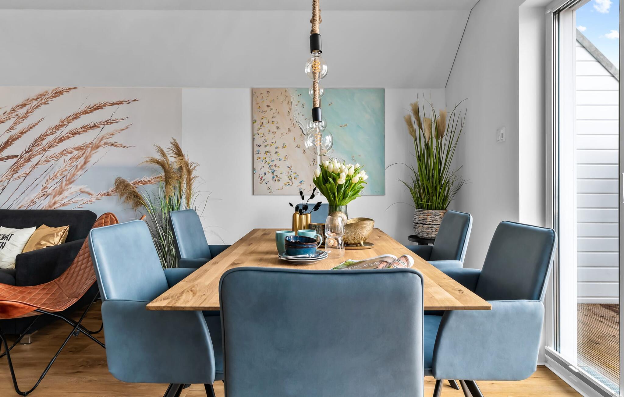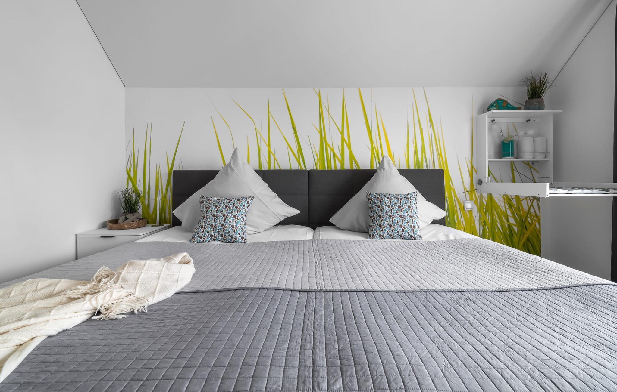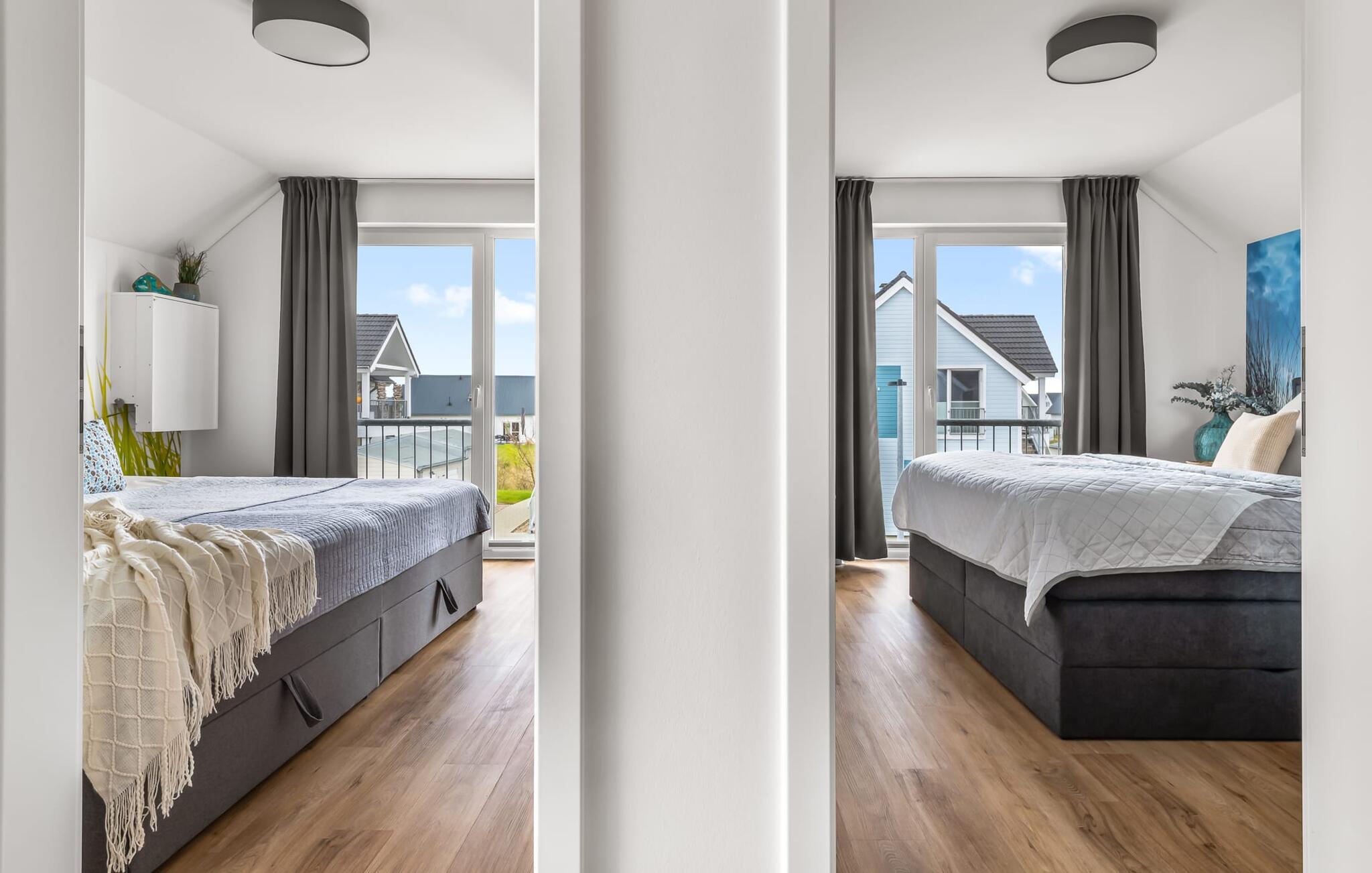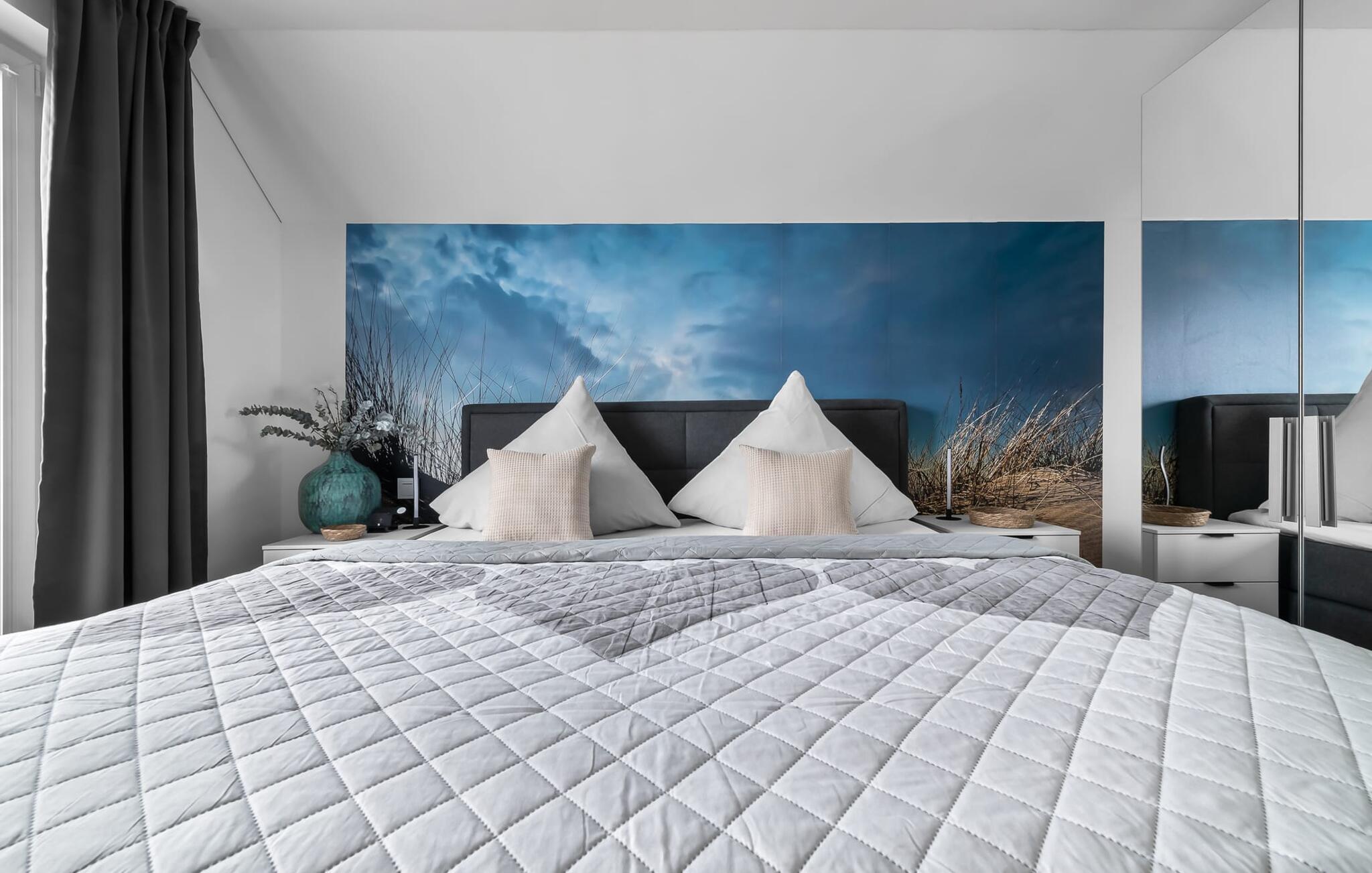 MEERVERLIEBT er en rummelig og rummelig ferielejlighed på øverste etage, der imponerer med indretning af høj kvalitet og elegant indretning. Her kan I nyde jeres ferie fuldt ud og tilbringe afslappende timer i en strandstol. Sandstranden Weidefelder med kiosk, restaurant og strandstole ligger i gåafstand og er et attraktivt rejsemål på alle tider af året. Ligeledes i umiddelbar nærhed ligger en minigolfbane med maritimt tema, som både store og små nydes. Den livlige havnepromenade med indkøbsmuligheder og lystbådehavnen ligger også i nærheden af MEERVERLIEBT. Den åbne stue/spisestue med gulv-til-loft vinduer og tilstødende stor terrasse er hjertet af MEERVERLIEBT og imponerer med sin middelhavsflair og moderne indretning. Når I træder ind i rummet føler I jer straks hjemme og kan slappe af i den komfortable opholdsstue, nyde naturens fred og ro gennem vinduet eller se tv - et perfekt miljø til ren afslapning og rekreation! Boligarealet kan åbnes op, hvis det er nødvendigt. Sengen (190 x 200) har springmadrasser og lamelbund. På ferien er der masser af tid til kreativ madlavning, og det fuldt udstyrede, moderne køkken-alrum lader intet tilbage at ønske. Bagefter kan I nyde lækkerierne på terrassen eller starte en hyggelig grillaften - den perfekte ferie! Fra opholdsområdet kan I gå direkte til den store terrasse, med en behagelig strandstol, som tilbyder jer afslappende timer væk fra hverdagens stress og jag. Der er også en anden terrasse foran indgangspartiet med et behageligt opholdsområde, der inviterer jer til at slappe af. Der er to soveværelser til rådighed for en god nats søvn. Det første soveværelse er udstyret med en komfortabel boxmadras, mens det andet soveværelse med to individuelle boxmadrasser sikrer afslappende nætter. Begge soveværelser har også et QLED Smart TV med Magenta TV. Der er selvfølgelig også plads til de yngste gæster, en barneseng og en høj stol er til rådighed. Der er også et udfoldelig puslebord fastgjort til væggen. Efter en begivenhedsrig dag vil et brusebad på gulvniveau og en infrarød sauna forkæle jer med afslappende stunder og velvære. Den perfekte afslutning på en vellykket feriedag. For all-round komfort finder I også jeres egen parkeringsplads og et aflåseligt cykelskur foran ferielejligheden. Vores favoritsted: Den infrarøde sauna og pejsen, som sikrer perfekt afslapning, især efter en hel dags ferie. Bemærk venligst, at OstseeResort Olpenitz stadig er under opførelse. På grund byggearbejdet af husene kan udendørsfaciliteterne og bygningstætheden ændre sig og afvige fra de viste billeder. Lejeprisen er allerede beregnet på baggrund af denne byggesituation, hvorfor yderligere rabatter ikke er muligt.
