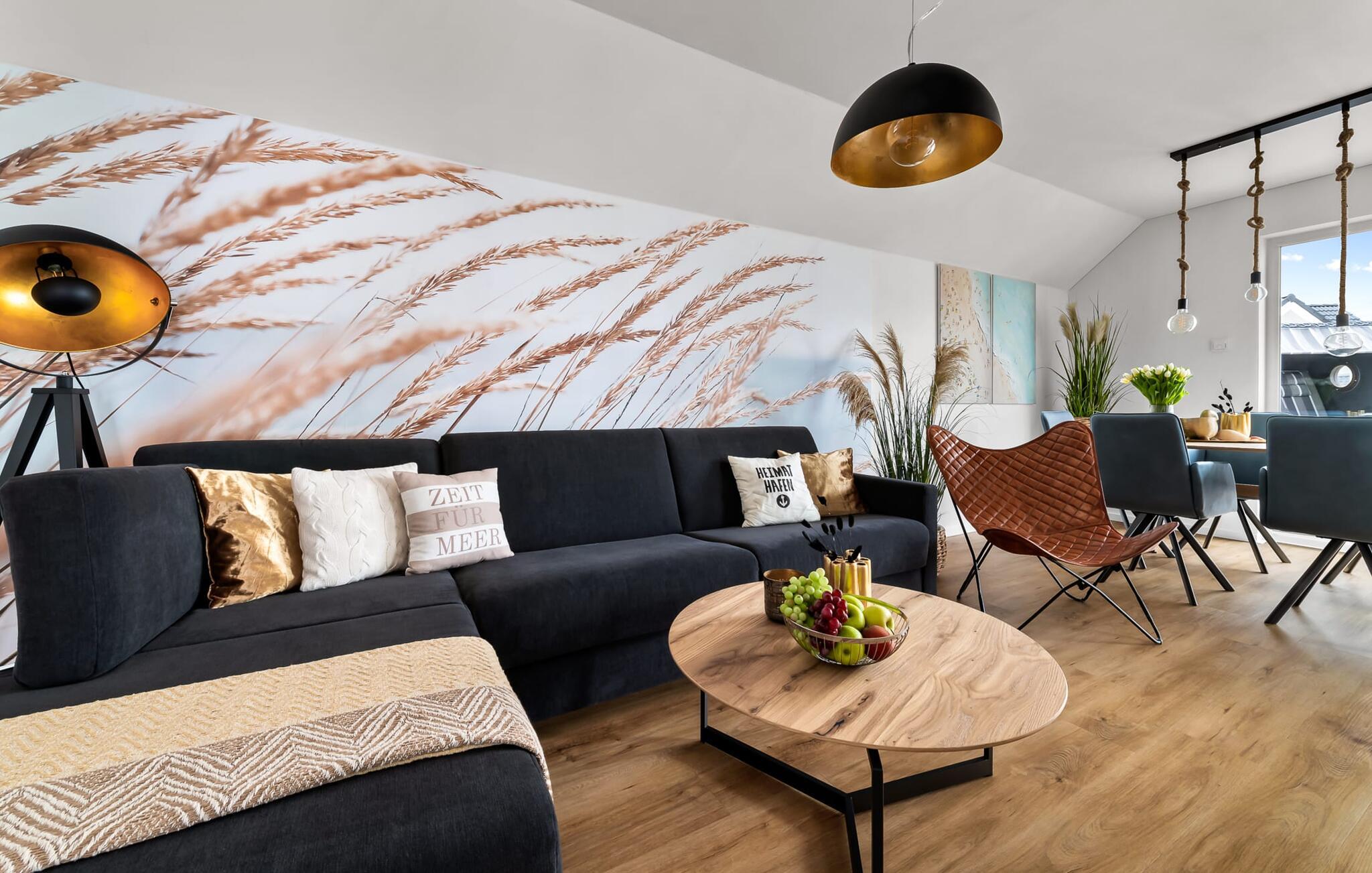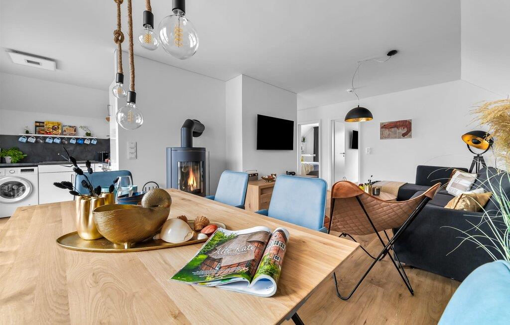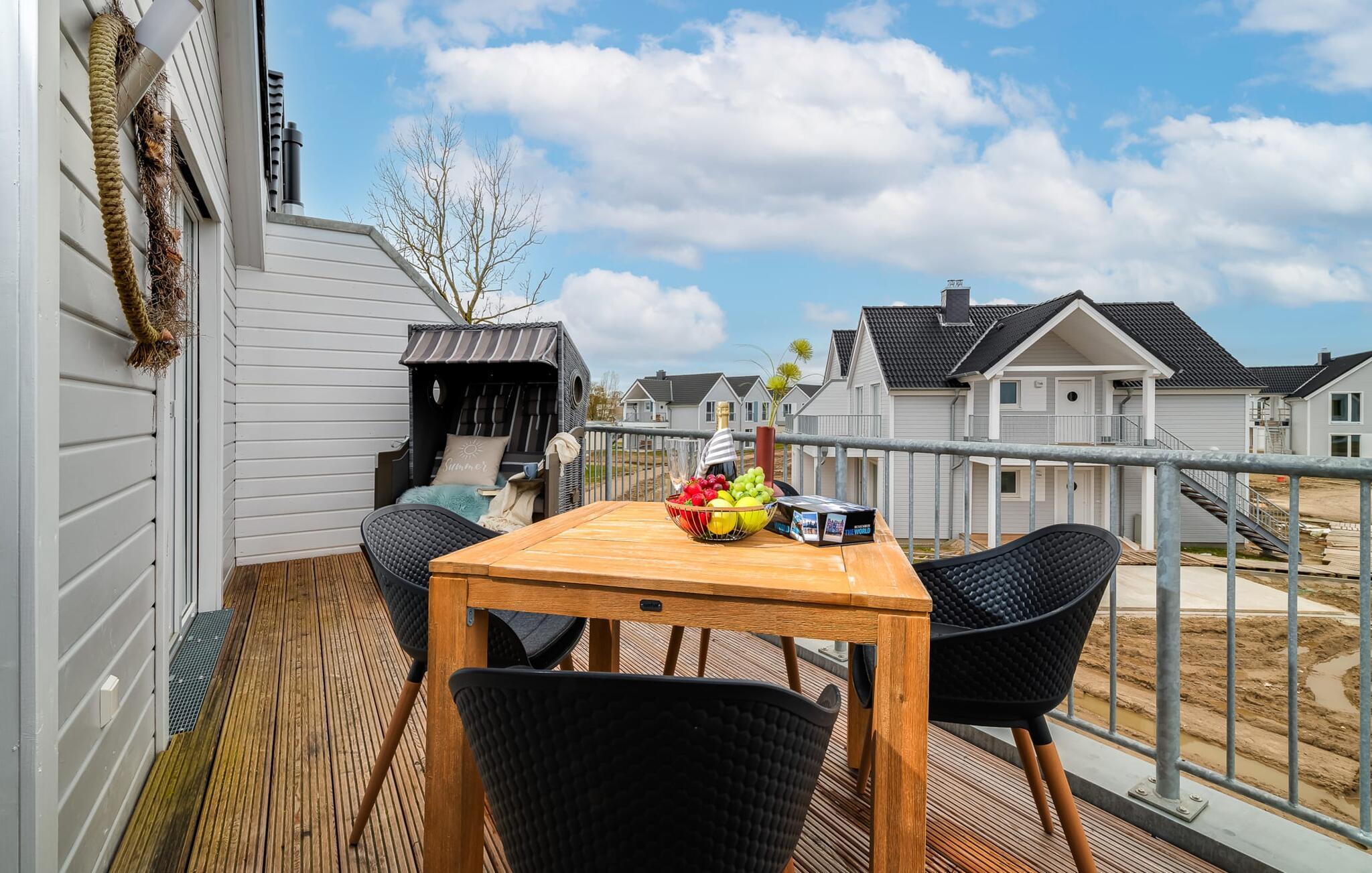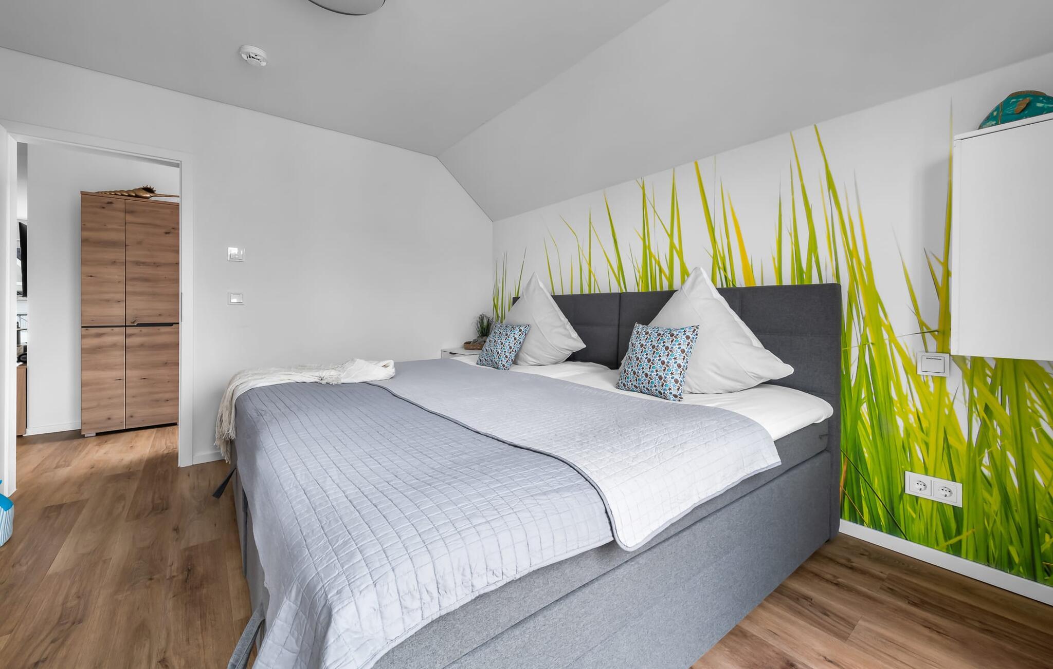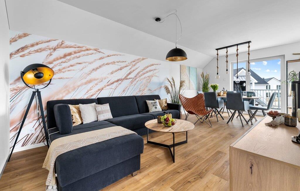 MEERVERLIEBT er en rummelig og rummelig ferielejlighed på øverste etage, der imponerer med indretning af høj kvalitet og elegant indretning. Her kan I nyde jeres ferie fuldt ud og tilbringe afslappende timer i en strandstol. Sandstranden Weidefelder med kiosk, restaurant og strandstole ligger i gåafstand og er et attraktivt rejsemål på alle tider af året. Ligeledes i umiddelbar nærhed ligger en minigolfbane med maritimt tema, som både store og små nydes. Den livlige havnepromenade med indkøbsmuligheder og lystbådehavnen ligger også i nærheden af MEERVERLIEBT. Den åbne stue/spisestue med gulv-til-loft vinduer og tilstødende stor terrasse er hjertet af MEERVERLIEBT og imponerer med sin middelhavsflair og moderne indretning. Når I træder ind i rummet føler I jer straks hjemme og kan slappe af i den komfortable opholdsstue, nyde naturens fred og ro gennem vinduet eller se tv - et perfekt miljø til ren afslapning og rekreation! Boligarealet kan åbnes op, hvis det er nødvendigt. Sengen (190 x 200) har springmadrasser og lamelbund. På ferien er der masser af tid til kreativ madlavning, og det fuldt udstyrede, moderne køkken-alrum lader intet tilbage at ønske. Bagefter kan I nyde lækkerierne på terrassen eller starte en hyggelig grillaften - den perfekte ferie! Fra opholdsområdet kan I gå direkte til den store terrasse, med en behagelig strandstol, som tilbyder jer afslappende timer væk fra hverdagens stress og jag. Der er også en anden terrasse foran indgangspartiet med et behageligt opholdsområde, der inviterer jer til at slappe af. Der er to soveværelser til rådighed for en god nats søvn. Det første soveværelse er udstyret med en komfortabel boxmadras, mens det andet soveværelse med to individuelle boxmadrasser sikrer afslappende nætter. Begge soveværelser har også et QLED Smart TV med Magenta TV. Der er selvfølgelig også plads til de yngste gæster, en barneseng og en høj stol er til rådighed. Der er også et udfoldelig puslebord fastgjort til væggen. Efter en begivenhedsrig dag vil et brusebad på gulvniveau og en infrarød sauna forkæle jer med afslappende stunder og velvære. Den perfekte afslutning på en vellykket feriedag. For all-round komfort finder I også jeres egen parkeringsplads og et aflåseligt cykelskur foran ferielejligheden. Vores favoritsted: Den infrarøde sauna og pejsen, som sikrer perfekt afslapning, især efter en hel dags ferie. Bemærk venligst, at OstseeResort Olpenitz stadig er under opførelse. På grund byggearbejdet af husene kan udendørsfaciliteterne og bygningstætheden ændre sig og afvige fra de viste billeder. Lejeprisen er allerede beregnet på baggrund af denne byggesituation, hvorfor yderligere rabatter ikke er muligt.