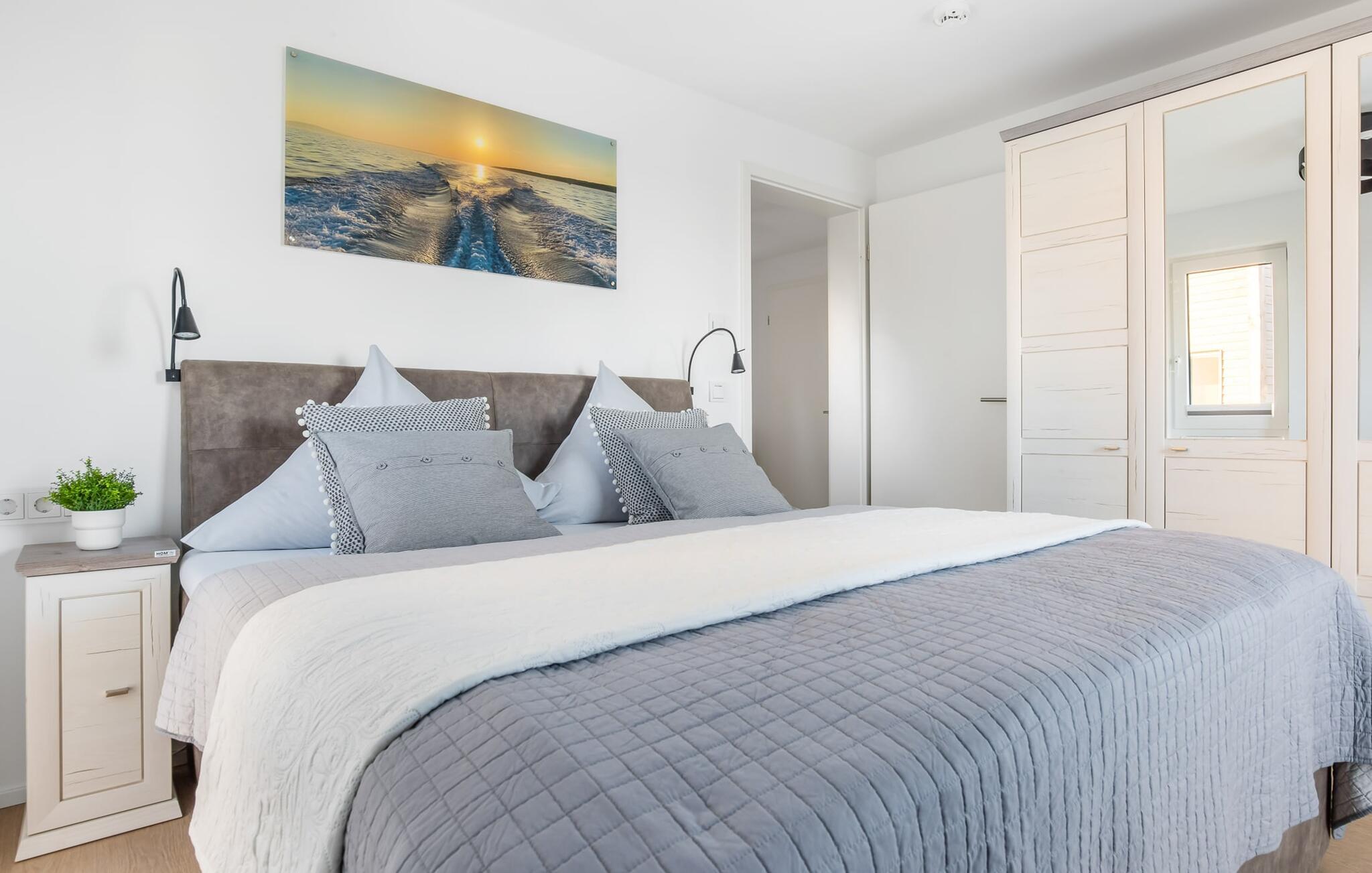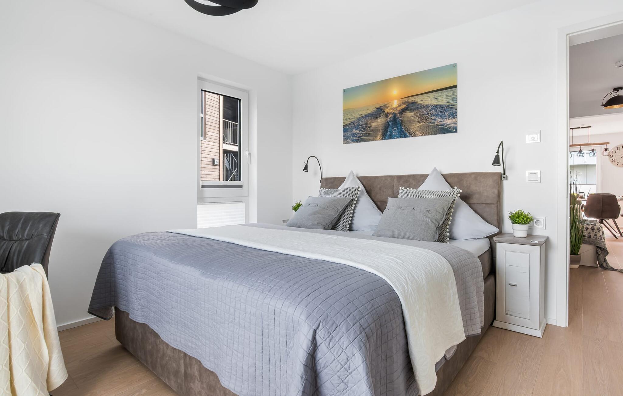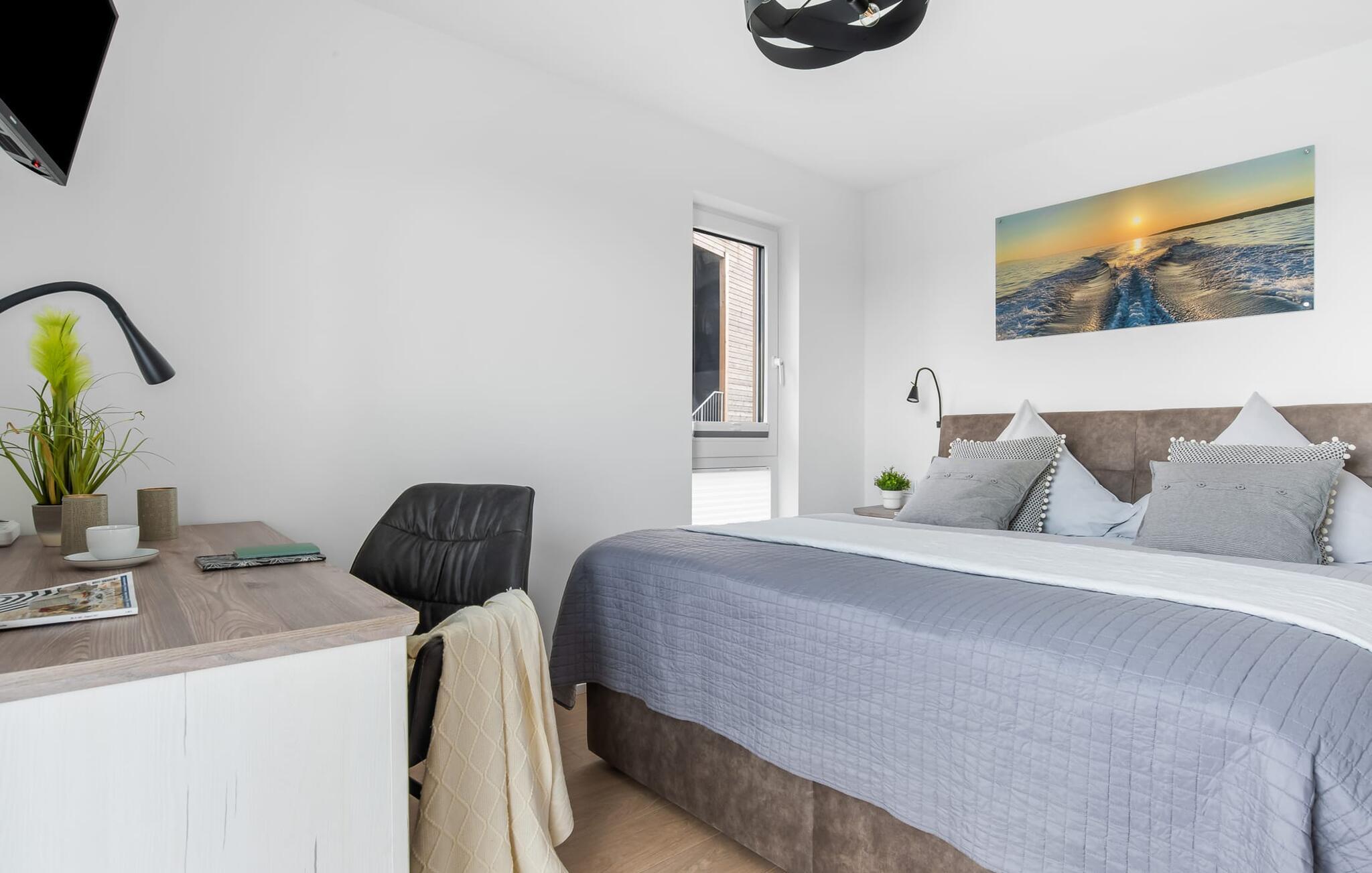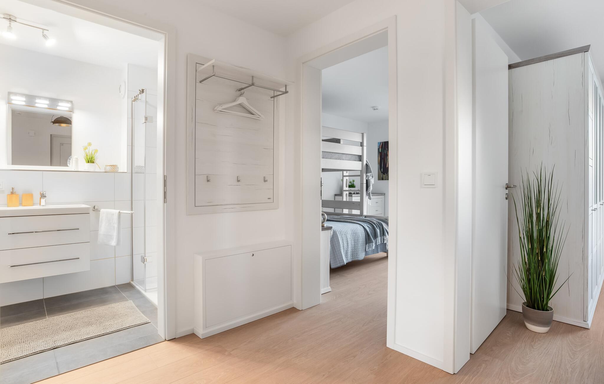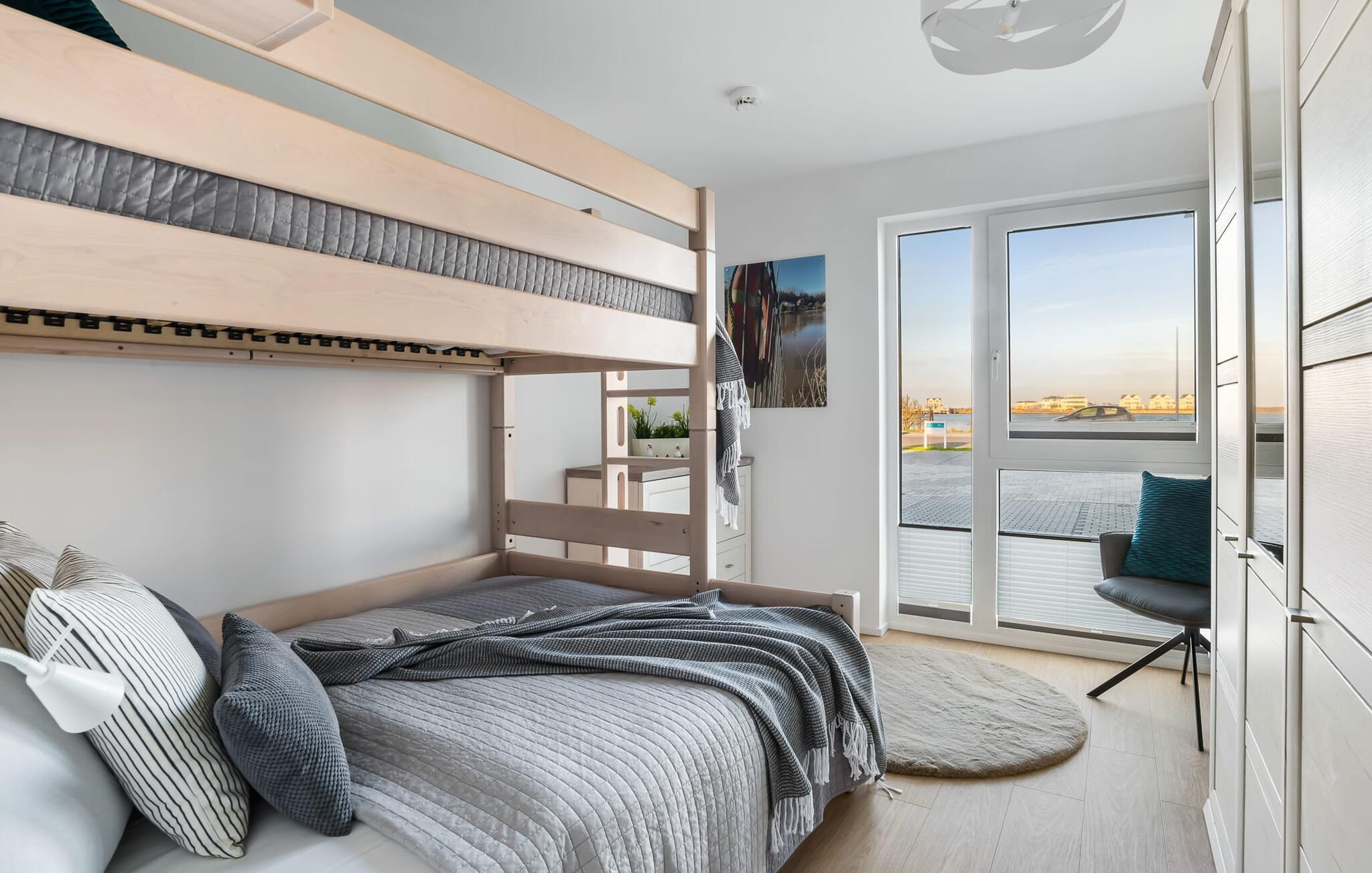 MEERWEH er en rummelig ferielejlighed i stueetagen for op til seks personer. Havnepromenaden i OstseeResort Olpenitz med dets voksende udbud og indkøbsmuligheder samt sejl- og sportsbådshavnen i OstseeResort Olpenitz kan nås til fods. Den maritime minigolfbane ligger i umiddelbar nærhed og byder på sjov for hele familien. Med sin gulv-til-loft vinduesfront og den store tilstødende terrasse er den åbne stue/alrum lejlighedens hjerte. At komme ind her og straks føle sig hjemme er én ting. At slappe af eller se tv i den hyggelige opholdsstue er ren afslapning og afslapning! Hverdagen bliver mere og mere fjern Hvis vejret nogensinde bliver nordisk, vil pejsen med sin brølende ild give yderligere hygge. Det integrerede køkken er perfekt udstyret, og det er sjovt at lave mad sammen. Så nyd de færdige lækkerier på terrassen eller start en hyggelig grillaften med Weber el-grill. Køleskabet har et separat fryserum til forsyninger og Nespresse-maskinen med mælkeskummer giver jer lækker kaffe tidligt om morgenen. Det er ren ferie. Direkte fra opholdsområdet kommer man ind på den store terrasse med syd-vest orientering. De medfølgende havemøbler vender mod bagsiden og inviterer jer til at tilbringe en afslappende ferie. Til afslapning om natten er der to soveværelser med komfortable senge med udsigt over havnen. Det første soveværelse er udstyret med dobbeltseng og har en lille overdækket terrasse med direkte udsigt over havnen. Det andet soveværelse inviterer jer til at tilbringe afslappende nætter med en loftsseng (med et øvre liggeareal på 90 cm bredt og et nedre liggeareal på 140 cm). Med nogle få enkle trin kan sofaen i stuen forvandles til en ekstra soveplads. Bevidst væk fra familielivet i stuen tilbyder MEERWEH en arbejdsplads i soveværelset til alle, der ønsker at bo hjemmefra selv på ferie. Herfra kan I lade blikket vandre over havnen eller tage en lille pause på terrassen. Børn er også meget velkomne på MEERWEH. Udover babyseng og højstol finder I også stikkontaktsikringer og omklædningsfaciliteter på rejsesengen. Der er også faldsikring til sengen. Derudover giver jeres ferieidyl diverse legetøj og børneservice. Bruserummet med brusebad i gulvniveau og infrarød sauna sikrer uforglemmelige wellness-øjeblikke, som I kan nyde i lang tid. For at give en hel feriekomfort finder I jeres egen parkeringsplads foran ferielejligheden. Derudover kan de grønne arealer omkring huset bruges. Vores foretrukne sted: at se solnedgangen over havnen og afslutte dagen på jeres ferie... Bemærk venligst: OstseeResort Olpenitz er meget populært, og der bygges fortsat i parken. Ikke desto mindre kan I se frem til en 5-stjernet standard og et førsteklasses ophold. Byggeaktiviteterne kommer ikke til at forstyrre jer på ferien, og derfor gives der ikke yderligere afslag i prisen.