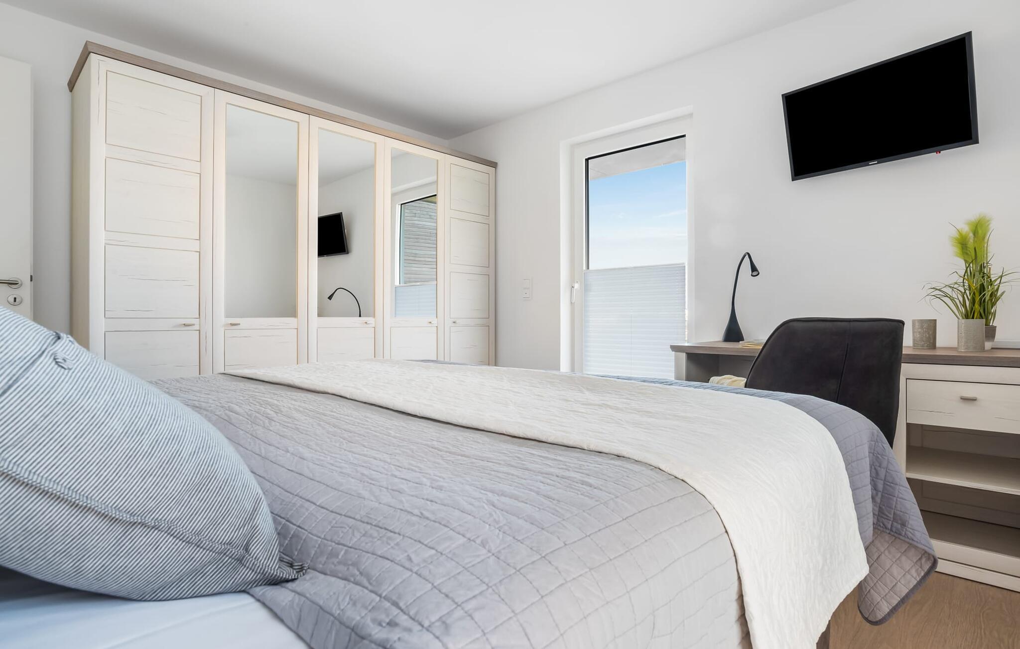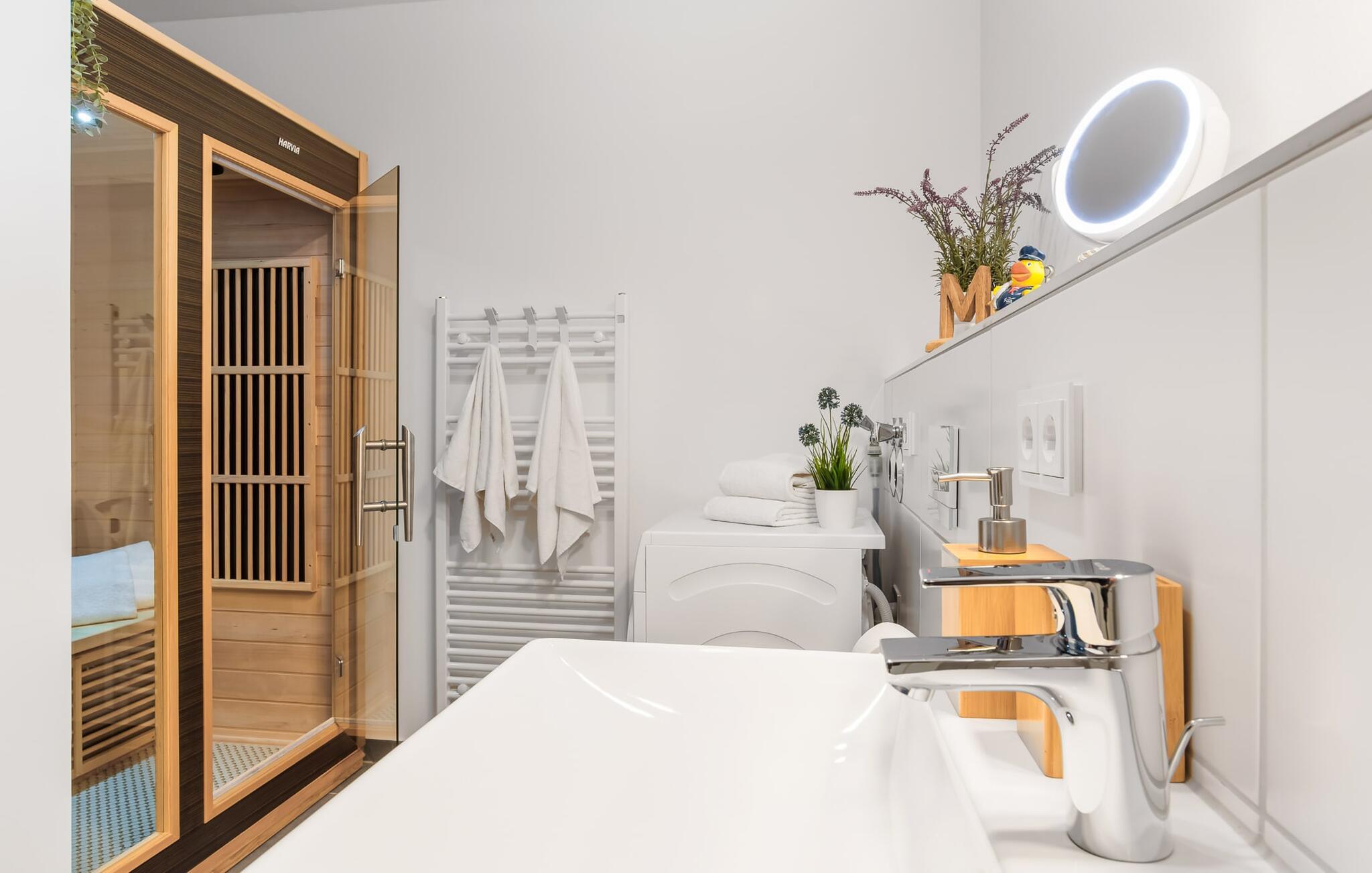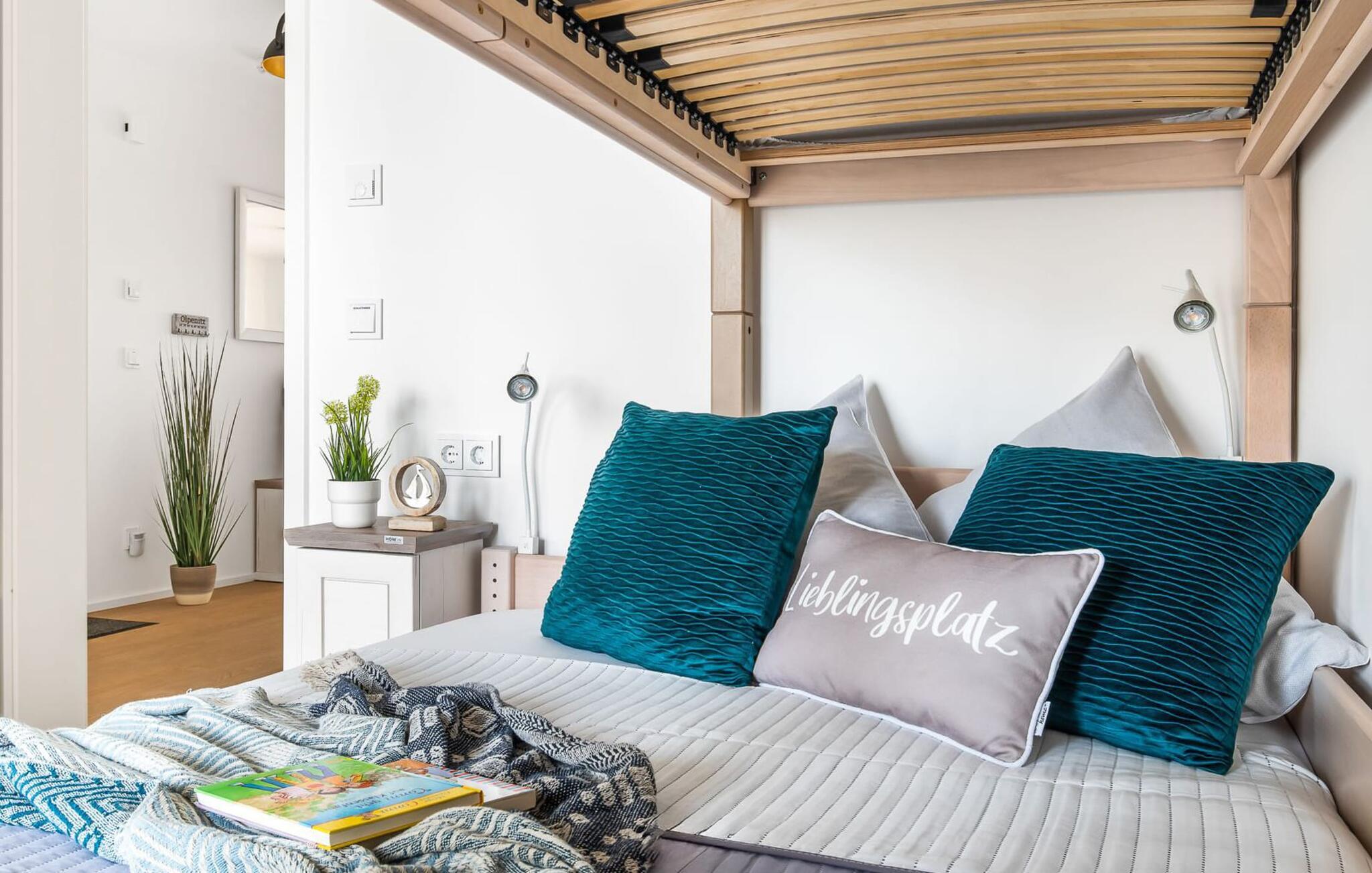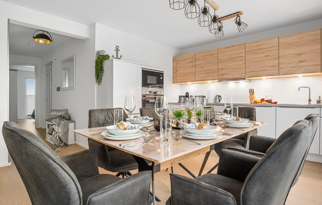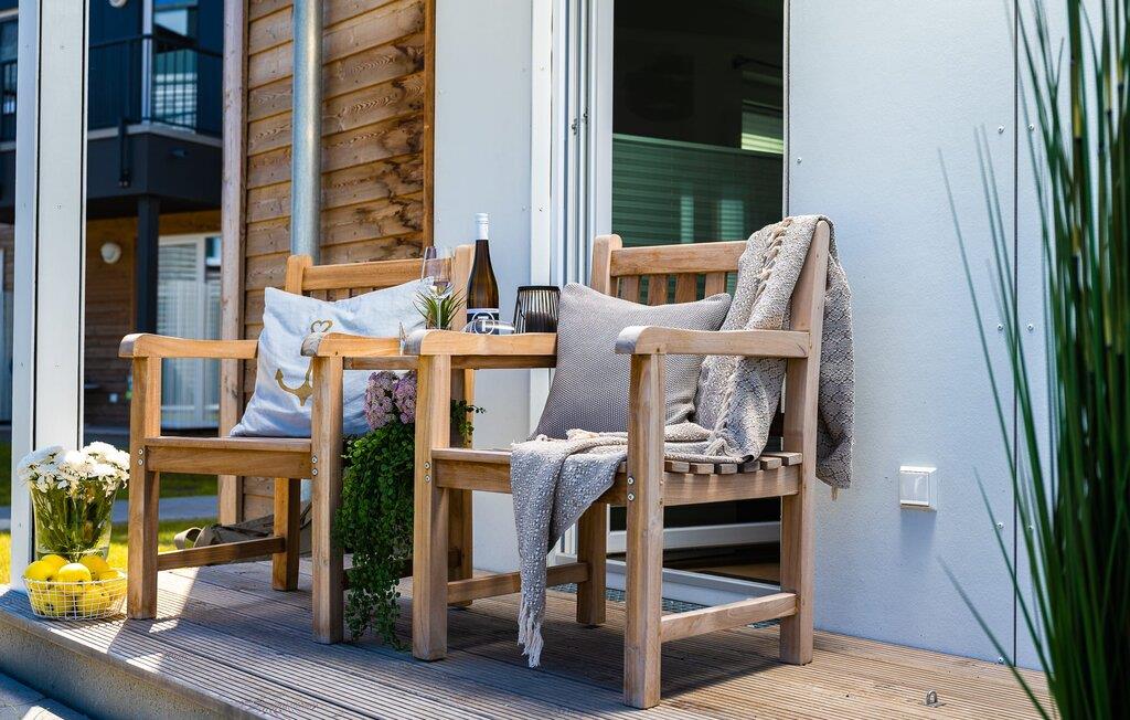 MEERWEH er en rummelig ferielejlighed i stueetagen for op til seks personer. Havnepromenaden i OstseeResort Olpenitz med dets voksende udbud og indkøbsmuligheder samt sejl- og sportsbådshavnen i OstseeResort Olpenitz kan nås til fods. Den maritime minigolfbane ligger i umiddelbar nærhed og byder på sjov for hele familien. Med sin gulv-til-loft vinduesfront og den store tilstødende terrasse er den åbne stue/alrum lejlighedens hjerte. At komme ind her og straks føle sig hjemme er én ting. At slappe af eller se tv i den hyggelige opholdsstue er ren afslapning og afslapning! Hverdagen bliver mere og mere fjern Hvis vejret nogensinde bliver nordisk, vil pejsen med sin brølende ild give yderligere hygge. Det integrerede køkken er perfekt udstyret, og det er sjovt at lave mad sammen. Så nyd de færdige lækkerier på terrassen eller start en hyggelig grillaften med Weber el-grill. Køleskabet har et separat fryserum til forsyninger og Nespresse-maskinen med mælkeskummer giver jer lækker kaffe tidligt om morgenen. Det er ren ferie. Direkte fra opholdsområdet kommer man ind på den store terrasse med syd-vest orientering. De medfølgende havemøbler vender mod bagsiden og inviterer jer til at tilbringe en afslappende ferie. Til afslapning om natten er der to soveværelser med komfortable senge med udsigt over havnen. Det første soveværelse er udstyret med dobbeltseng og har en lille overdækket terrasse med direkte udsigt over havnen. Det andet soveværelse inviterer jer til at tilbringe afslappende nætter med en loftsseng (med et øvre liggeareal på 90 cm bredt og et nedre liggeareal på 140 cm). Med nogle få enkle trin kan sofaen i stuen forvandles til en ekstra soveplads. Bevidst væk fra familielivet i stuen tilbyder MEERWEH en arbejdsplads i soveværelset til alle, der ønsker at bo hjemmefra selv på ferie. Herfra kan I lade blikket vandre over havnen eller tage en lille pause på terrassen. Børn er også meget velkomne på MEERWEH. Udover babyseng og højstol finder I også stikkontaktsikringer og omklædningsfaciliteter på rejsesengen. Der er også faldsikring til sengen. Derudover giver jeres ferieidyl diverse legetøj og børneservice. Bruserummet med brusebad i gulvniveau og infrarød sauna sikrer uforglemmelige wellness-øjeblikke, som I kan nyde i lang tid. For at give en hel feriekomfort finder I jeres egen parkeringsplads foran ferielejligheden. Derudover kan de grønne arealer omkring huset bruges. Vores foretrukne sted: at se solnedgangen over havnen og afslutte dagen på jeres ferie... Bemærk venligst: OstseeResort Olpenitz er meget populært, og der bygges fortsat i parken. Ikke desto mindre kan I se frem til en 5-stjernet standard og et førsteklasses ophold. Byggeaktiviteterne kommer ikke til at forstyrre jer på ferien, og derfor gives der ikke yderligere afslag i prisen.