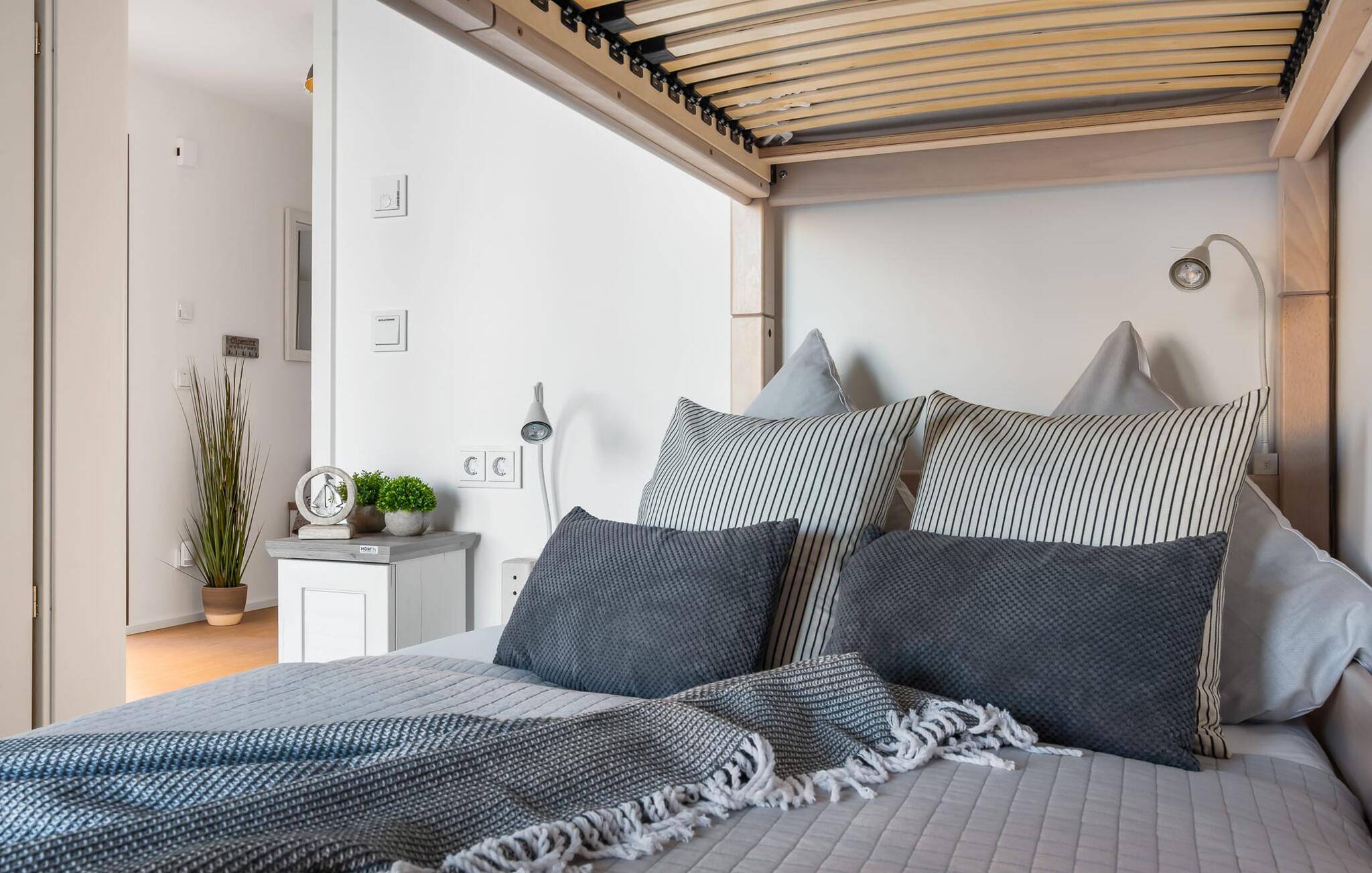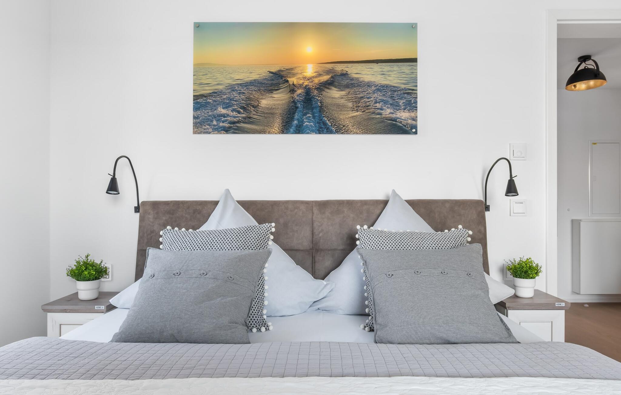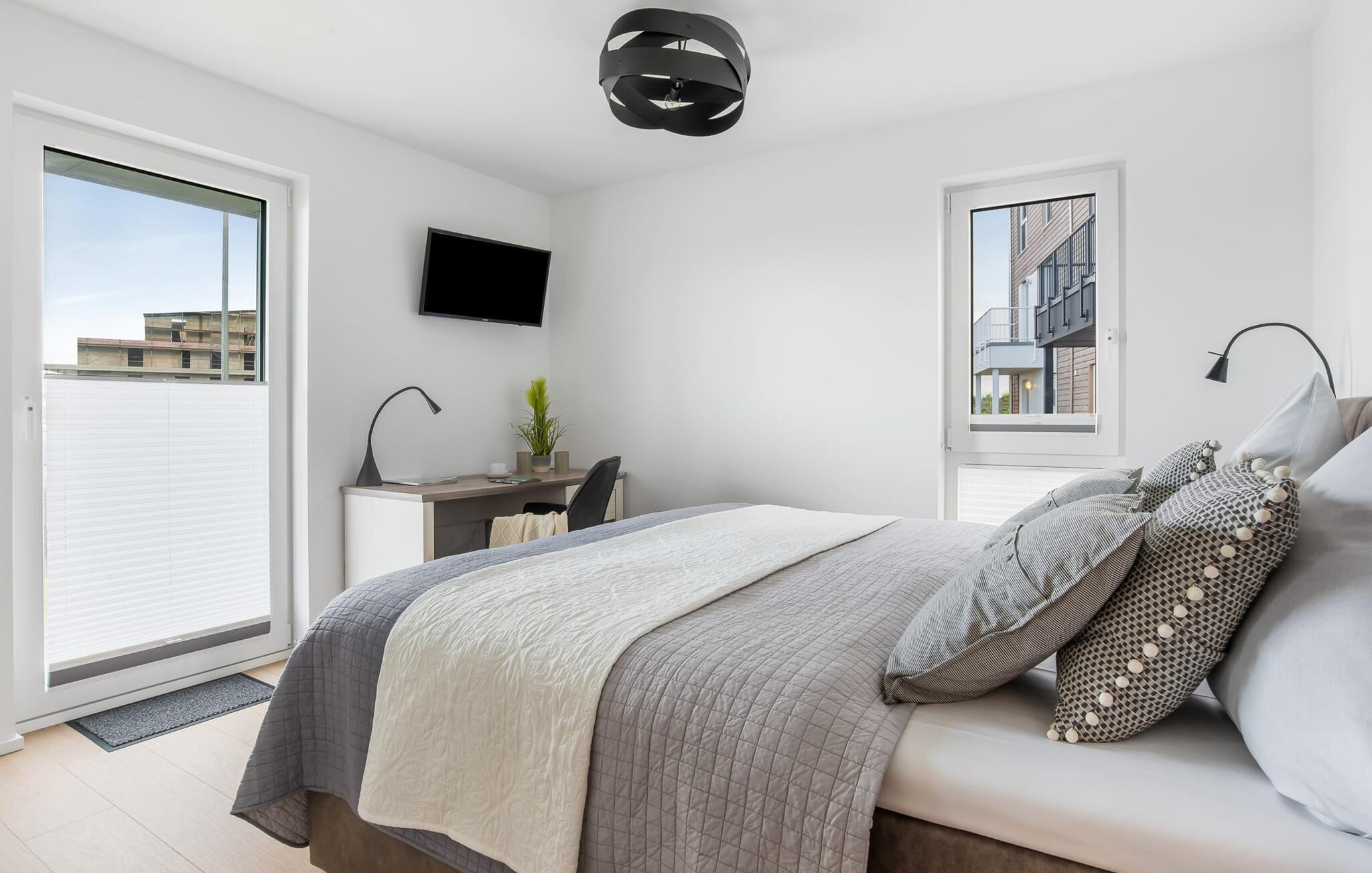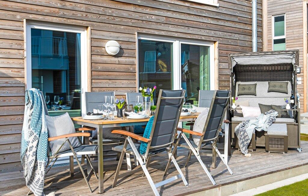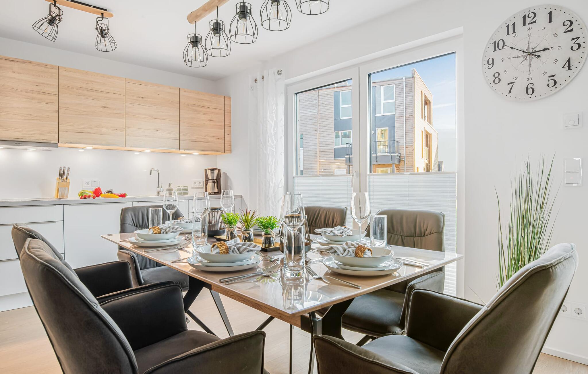 MEERWEH er en rummelig ferielejlighed i stueetagen for op til seks personer. Havnepromenaden i OstseeResort Olpenitz med dets voksende udbud og indkøbsmuligheder samt sejl- og sportsbådshavnen i OstseeResort Olpenitz kan nås til fods. Den maritime minigolfbane ligger i umiddelbar nærhed og byder på sjov for hele familien. Med sin gulv-til-loft vinduesfront og den store tilstødende terrasse er den åbne stue/alrum lejlighedens hjerte. At komme ind her og straks føle sig hjemme er én ting. At slappe af eller se tv i den hyggelige opholdsstue er ren afslapning og afslapning! Hverdagen bliver mere og mere fjern Hvis vejret nogensinde bliver nordisk, vil pejsen med sin brølende ild give yderligere hygge. Det integrerede køkken er perfekt udstyret, og det er sjovt at lave mad sammen. Så nyd de færdige lækkerier på terrassen eller start en hyggelig grillaften med Weber el-grill. Køleskabet har et separat fryserum til forsyninger og Nespresse-maskinen med mælkeskummer giver jer lækker kaffe tidligt om morgenen. Det er ren ferie. Direkte fra opholdsområdet kommer man ind på den store terrasse med syd-vest orientering. De medfølgende havemøbler vender mod bagsiden og inviterer jer til at tilbringe en afslappende ferie. Til afslapning om natten er der to soveværelser med komfortable senge med udsigt over havnen. Det første soveværelse er udstyret med dobbeltseng og har en lille overdækket terrasse med direkte udsigt over havnen. Det andet soveværelse inviterer jer til at tilbringe afslappende nætter med en loftsseng (med et øvre liggeareal på 90 cm bredt og et nedre liggeareal på 140 cm). Med nogle få enkle trin kan sofaen i stuen forvandles til en ekstra soveplads. Bevidst væk fra familielivet i stuen tilbyder MEERWEH en arbejdsplads i soveværelset til alle, der ønsker at bo hjemmefra selv på ferie. Herfra kan I lade blikket vandre over havnen eller tage en lille pause på terrassen. Børn er også meget velkomne på MEERWEH. Udover babyseng og højstol finder I også stikkontaktsikringer og omklædningsfaciliteter på rejsesengen. Der er også faldsikring til sengen. Derudover giver jeres ferieidyl diverse legetøj og børneservice. Bruserummet med brusebad i gulvniveau og infrarød sauna sikrer uforglemmelige wellness-øjeblikke, som I kan nyde i lang tid. For at give en hel feriekomfort finder I jeres egen parkeringsplads foran ferielejligheden. Derudover kan de grønne arealer omkring huset bruges. Vores foretrukne sted: at se solnedgangen over havnen og afslutte dagen på jeres ferie... Bemærk venligst: OstseeResort Olpenitz er meget populært, og der bygges fortsat i parken. Ikke desto mindre kan I se frem til en 5-stjernet standard og et førsteklasses ophold. Byggeaktiviteterne kommer ikke til at forstyrre jer på ferien, og derfor gives der ikke yderligere afslag i prisen.