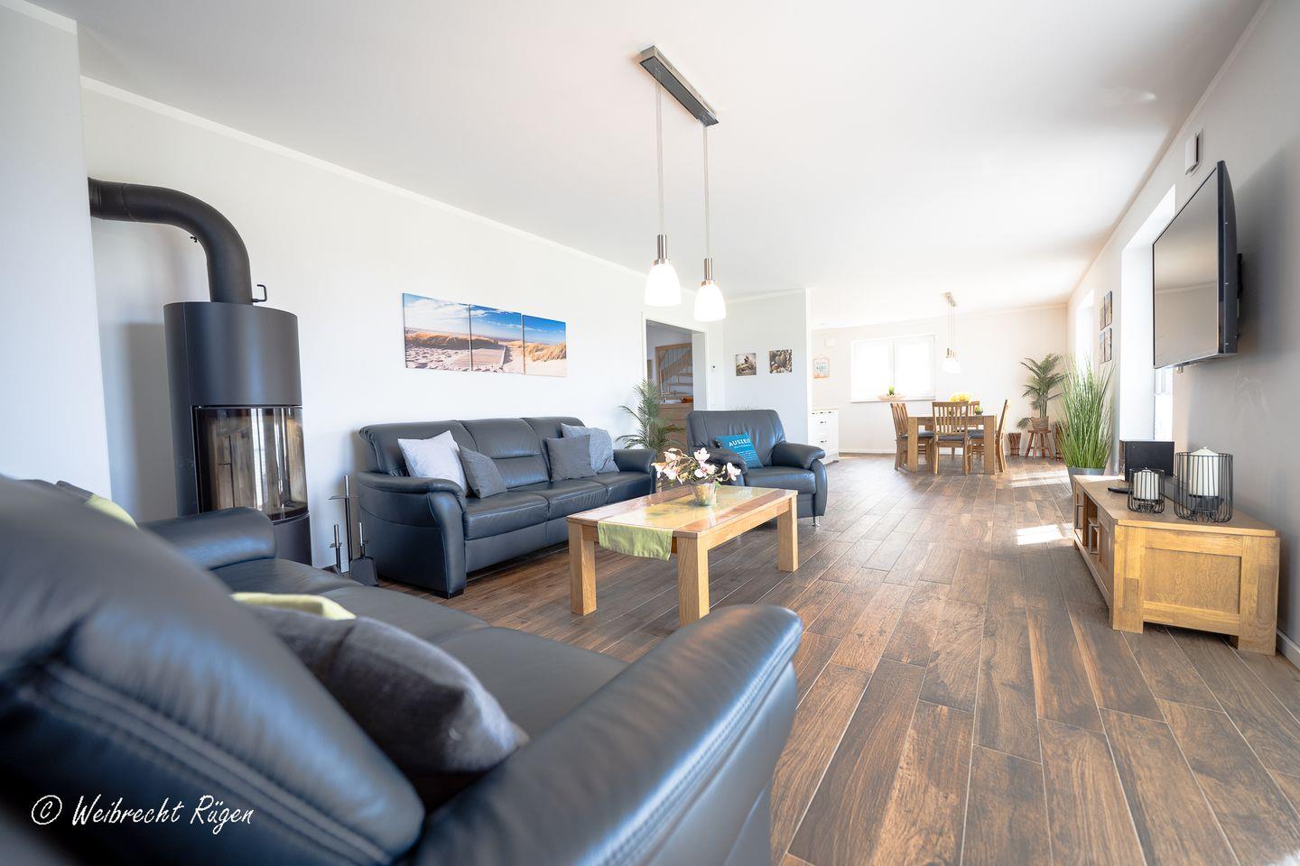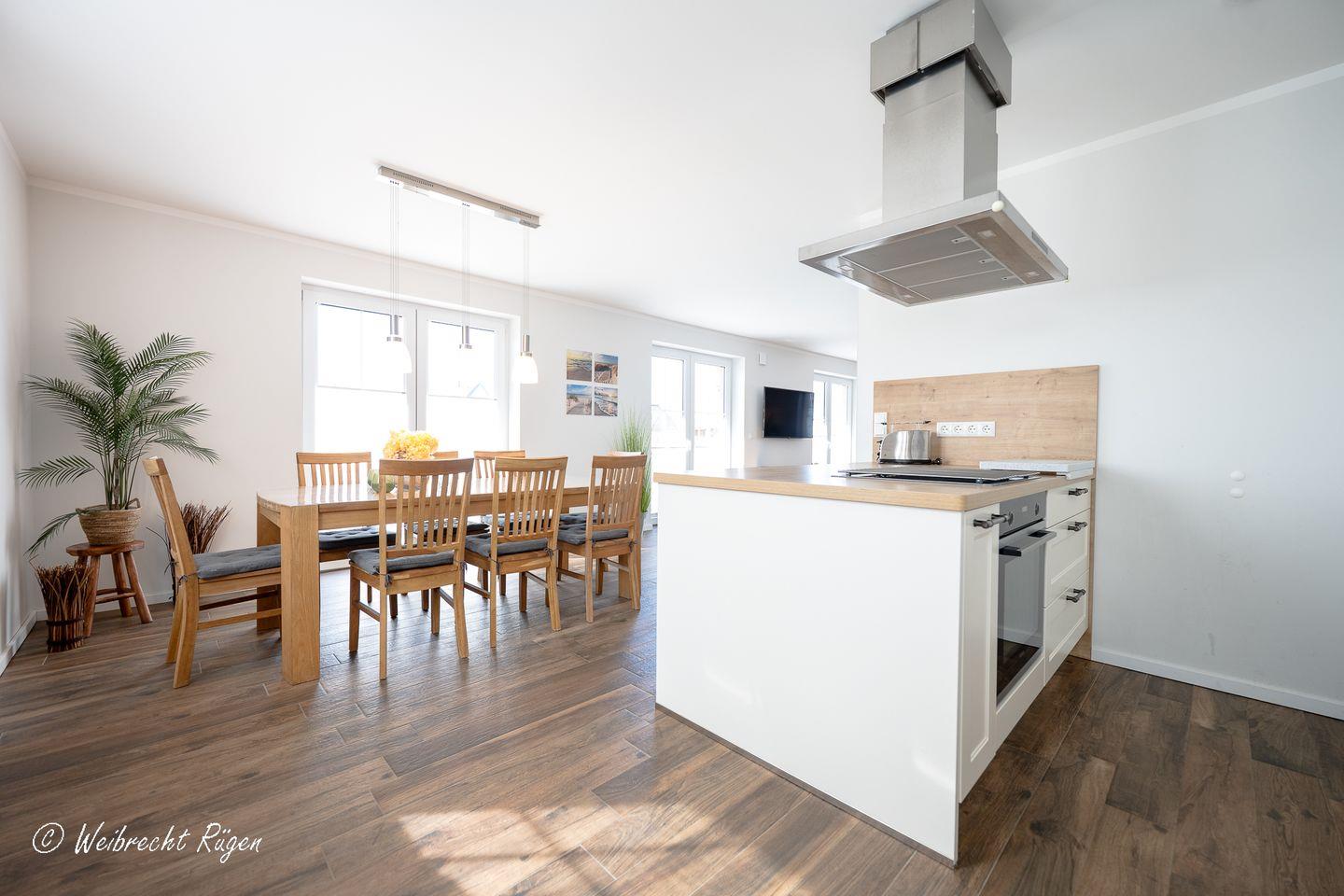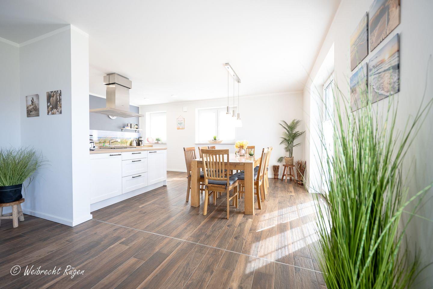 Von der Diele aus gelangen Sie in den großzügigen Wohn-und Essbereich mit Kaminofen und einer offenen Landhausküche, die Kochherzen höher schlagen lässt. Die Terrassentüren lassen viel Licht in die Räumlichkeiten und bieten einen tollen Ausblick in den großen Garten. Im Erdgeschoss befindet sich außerdem ein Wellnessbad mit Infrarotsauna. Waschmaschine sowie Wäschetrockner stehen kostenfrei im HWR für Sie bereit.