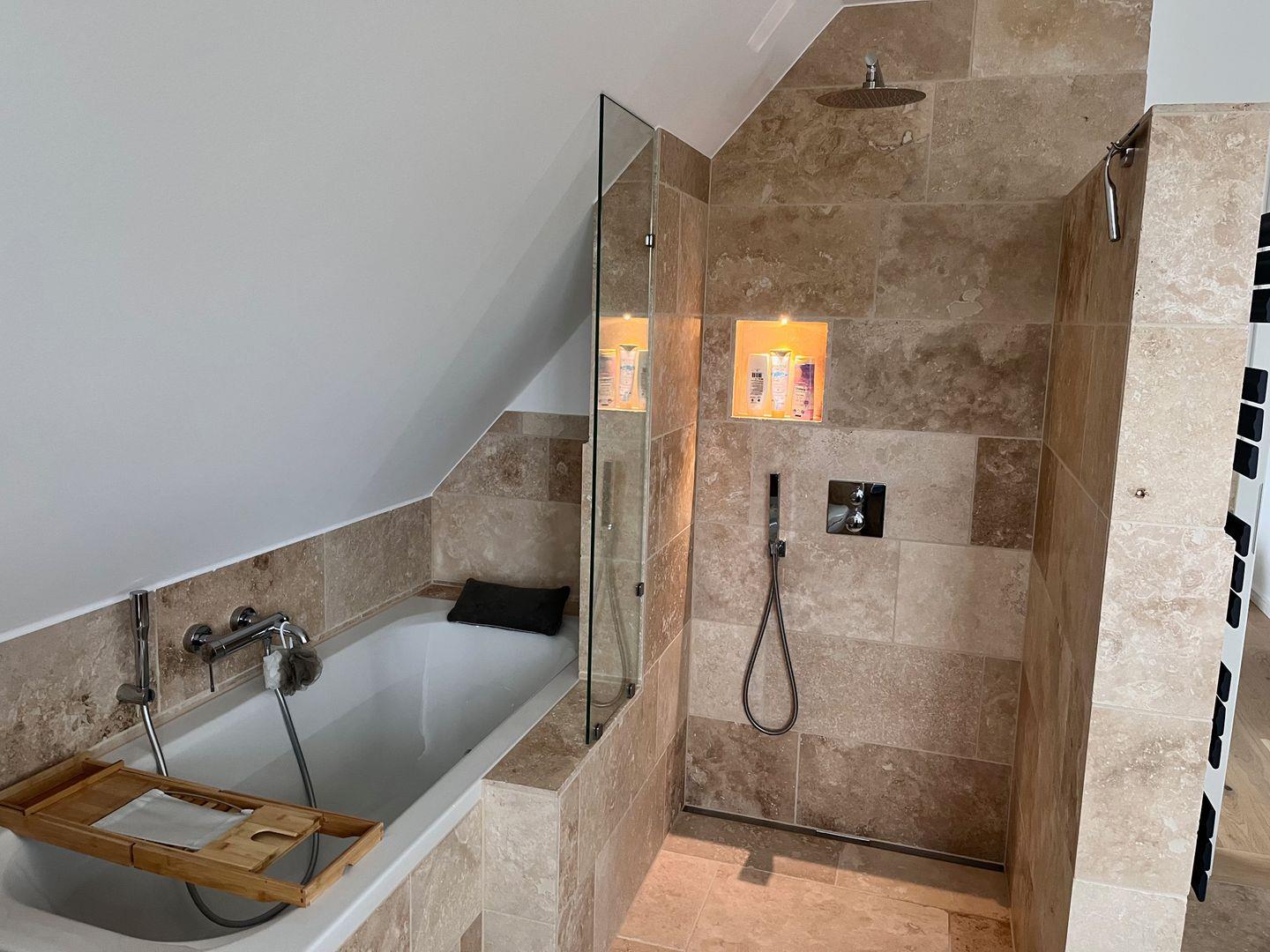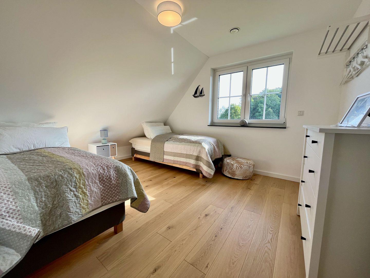 Im Dachgeschoss erwartet Sie eine gemütliche Galerie mit TV-Ecke – perfekt für ruhige Stunden. Zwei der drei Schlafzimmer sind mit komfortablen Doppelbetten ausgestattet, das dritte bietet zwei Einzelbetten. Zwei moderne Bäder – eines mit Dusche, eines mit Badewanne – sowie eine wohltuende Infrarotsauna sorgen für Erholung und Komfort.