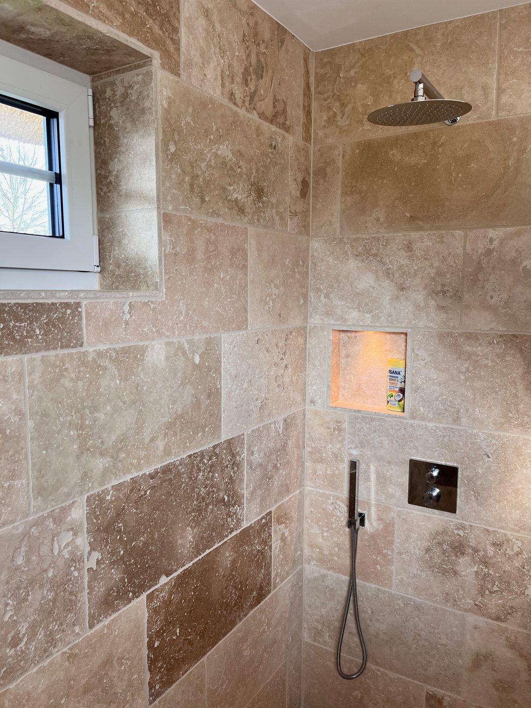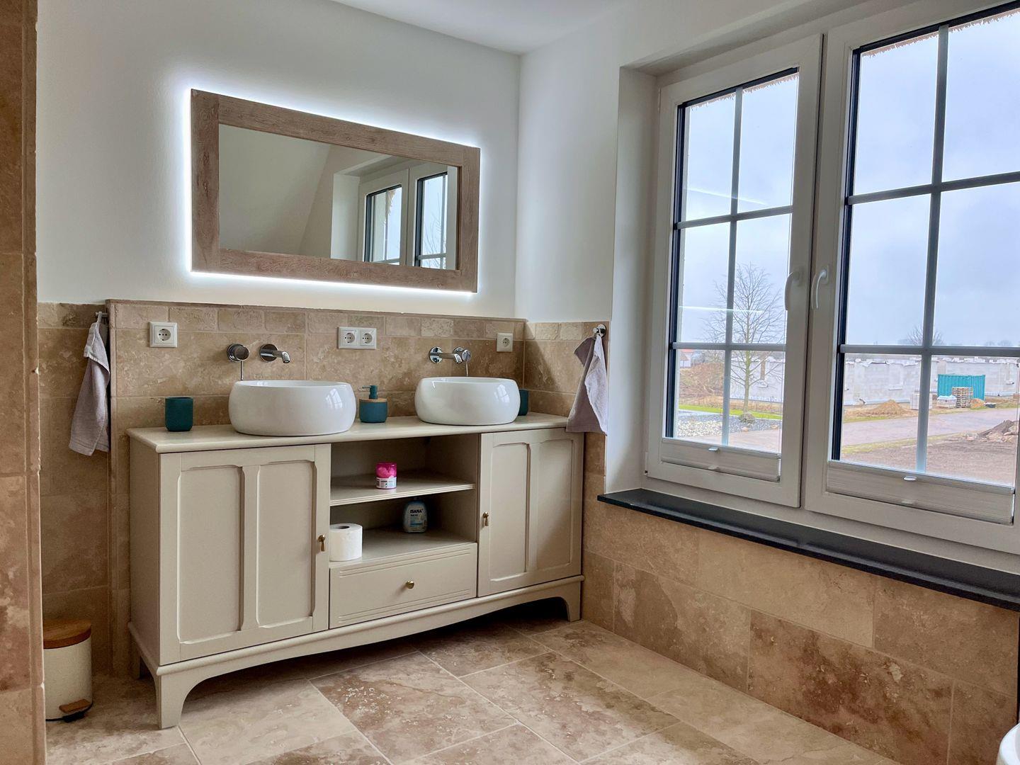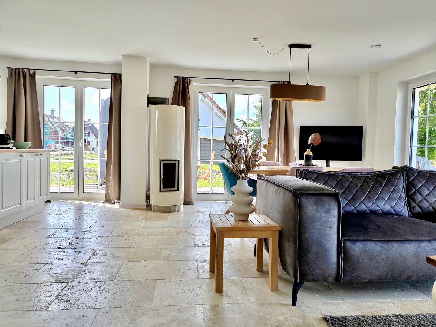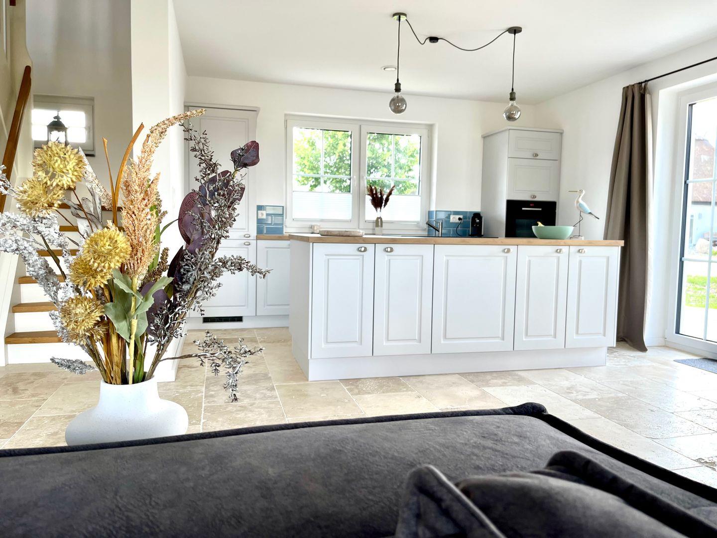 Im Erdgeschoss öffnet sich der großzügige, lichtdurchflutete Wohnbereich mit offener Küche – der lebendige Mittelpunkt des Hauses. Machen Sie es sich auf den bequemen Sofas gemütlich, genießen Sie den weiten Blick über die Felder und lassen Sie sich vom Kaminofen wohlig wärmen.
