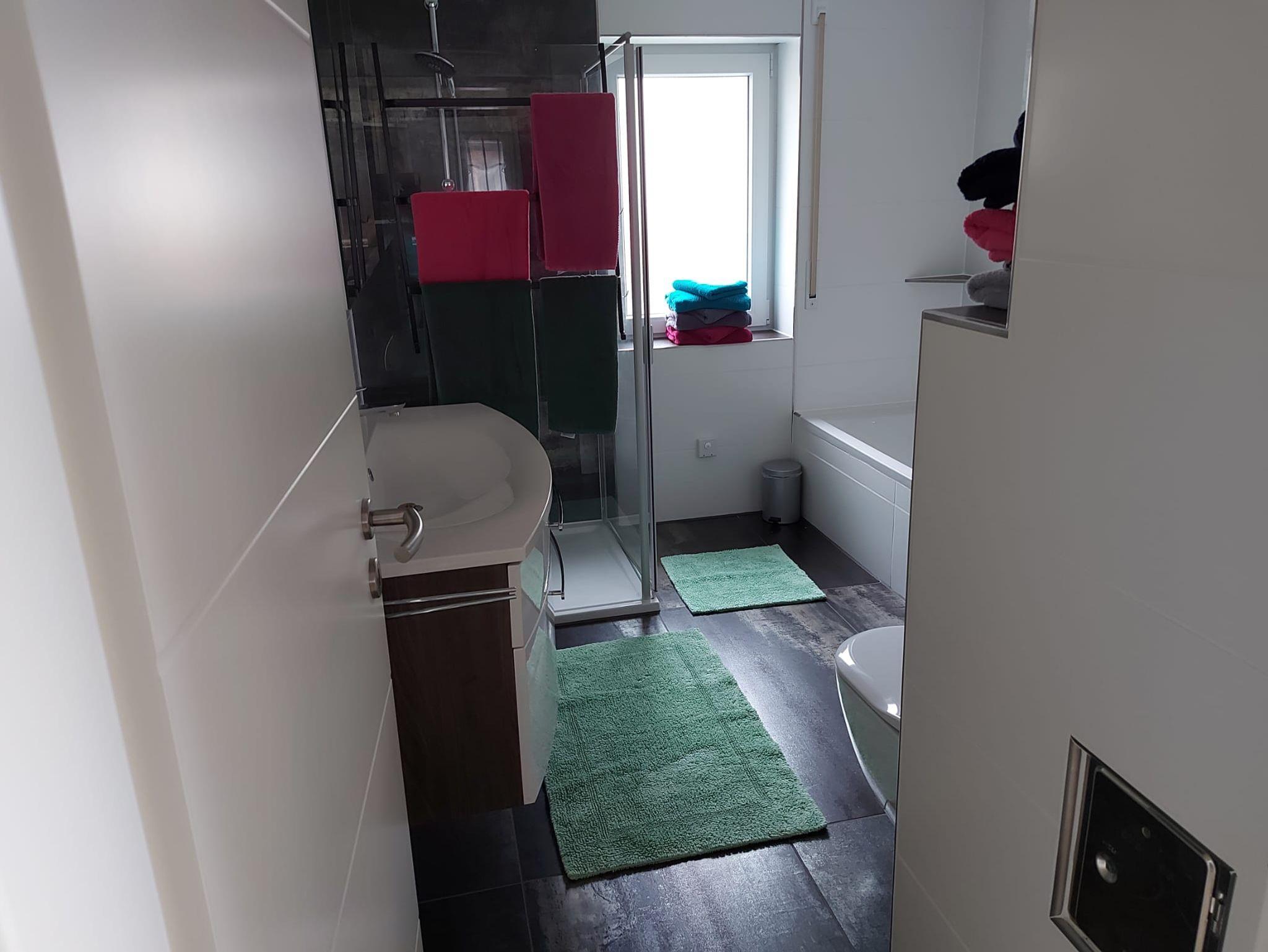 Gästeclou, Bad mit Dusche und Badewanne, sowie Hand und Badetücher.