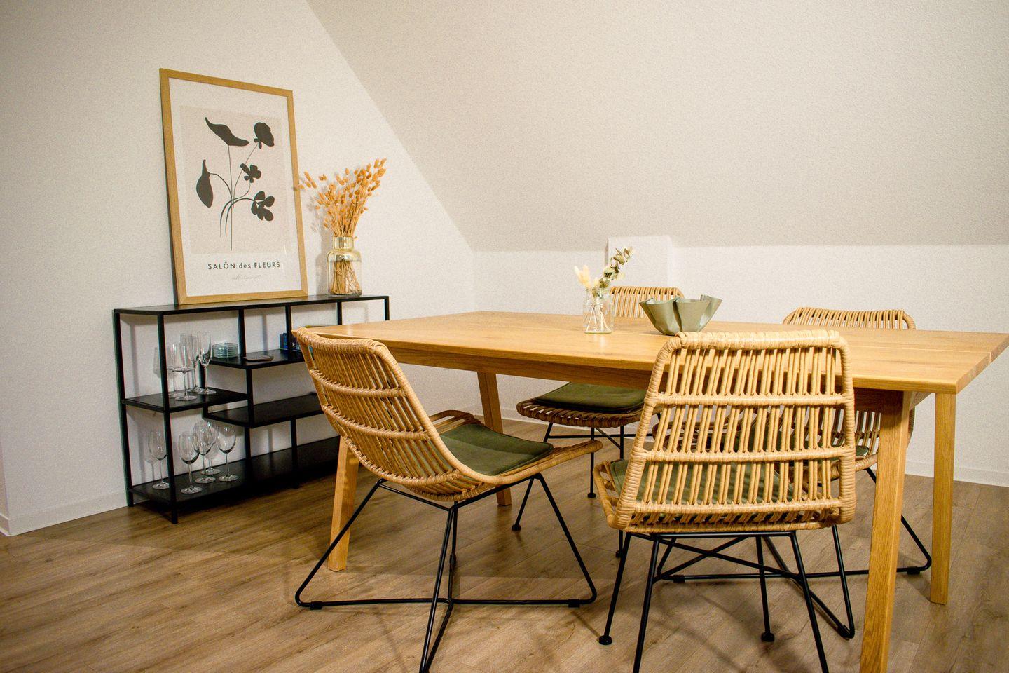 Im Wohnzimmer befindet sich eine riesige, super gemütliche Couch und ein TV mit Sat TV und Streaming Diensten. Es gibt auch einen Esstisch mit Platz für 4 Personen. Die Küche ist mit allem ausgestattet, was man zum Kochen braucht.