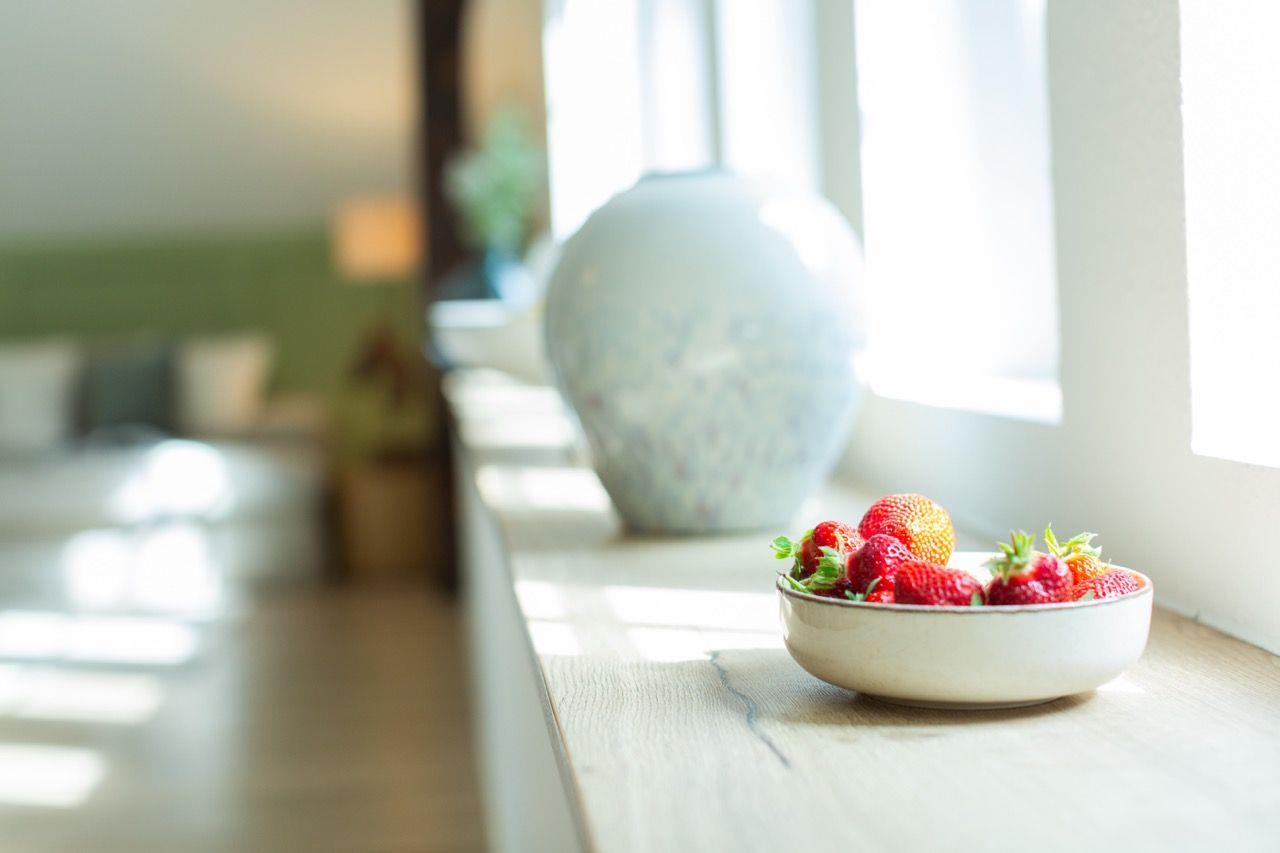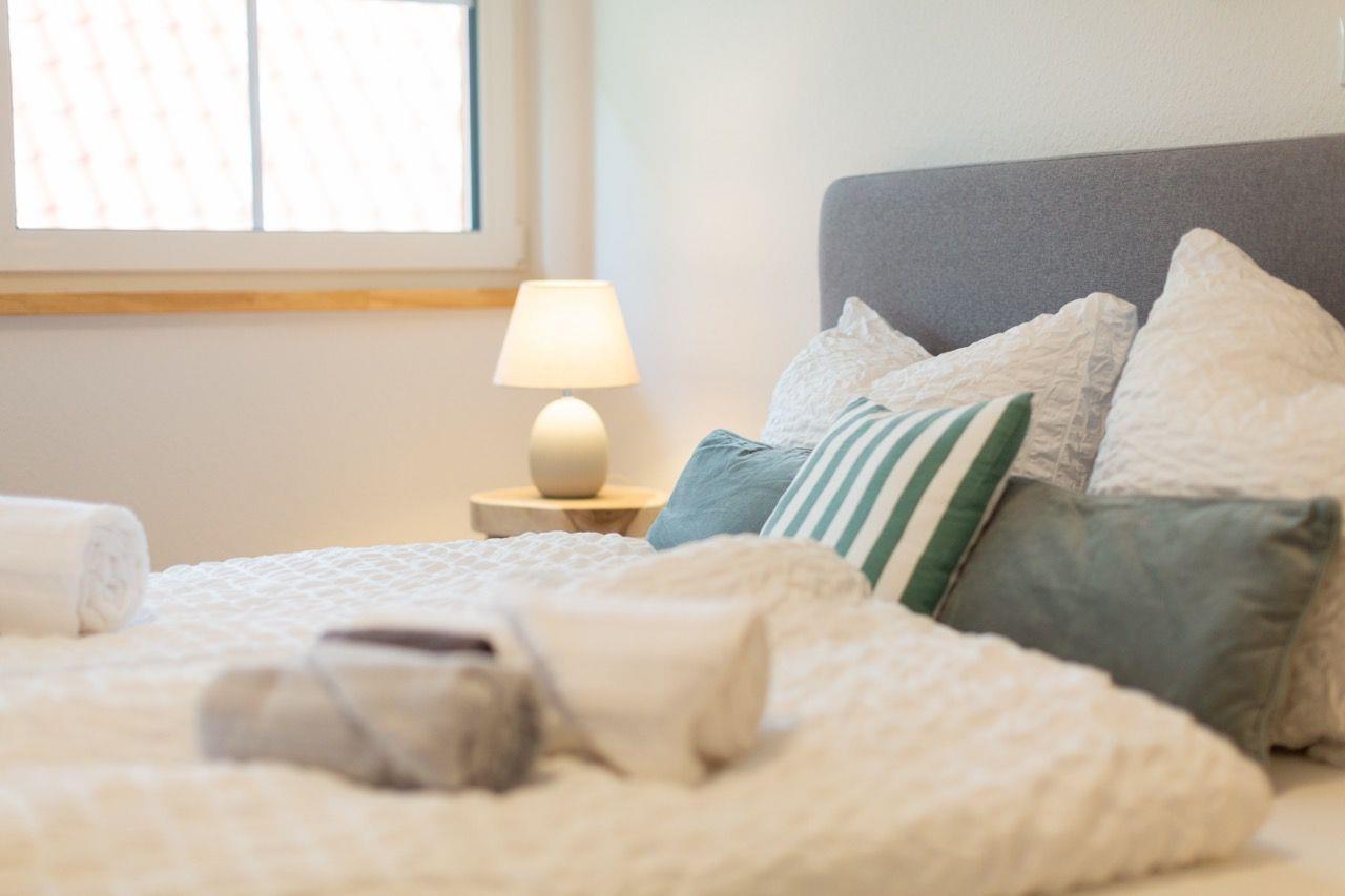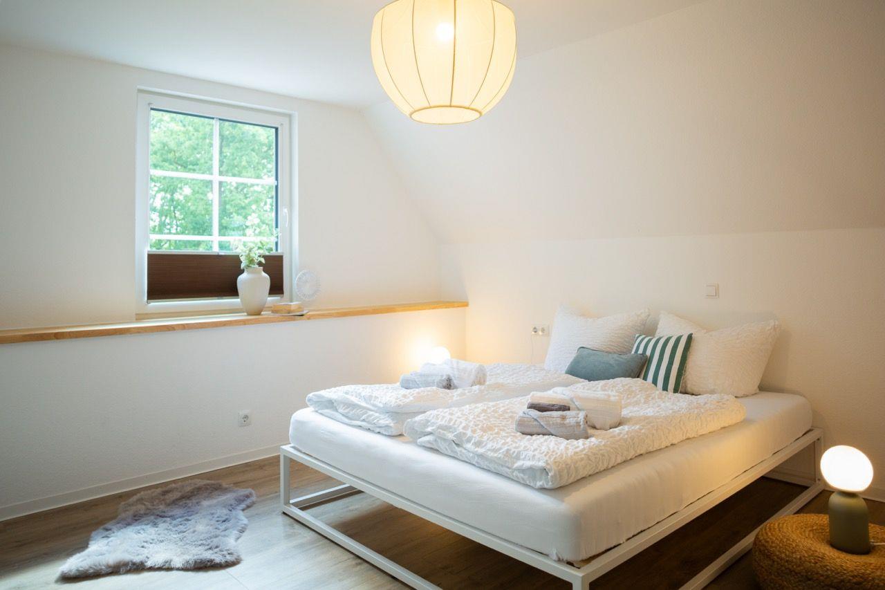 Unsere Ferienwohnung Eickhorst hat 2 Schlafzimmer. Das erste Schlafzimmer bietet ein Doppelbett (160m), einen Kleiderschrank, einen Schreibtisch und elektrische Rollläden zur Verdunklung. Das zweite Schlafzimmer hat ein niedriges Doppelbett (auch 160m) und Ablagefläche für Gepäck und Kleidung. Dieses Schlafzimmer befindet sich im Dachgeschoss und hebt sich besonders durch den wunderschönen Blick in unseren eigenen Wald hervor. Das Wohnzimmer ist durch eine Trennwand vom Rest der Wohnung leicht abgeschottet, sodass man nach einem langen Tag in der Natur auf dem großen und gemütlichen Ecksofa zur Ruhe kommen kann. Der Fernseher ist ein Smart TV mit Netflix, Amazon u.v.m.