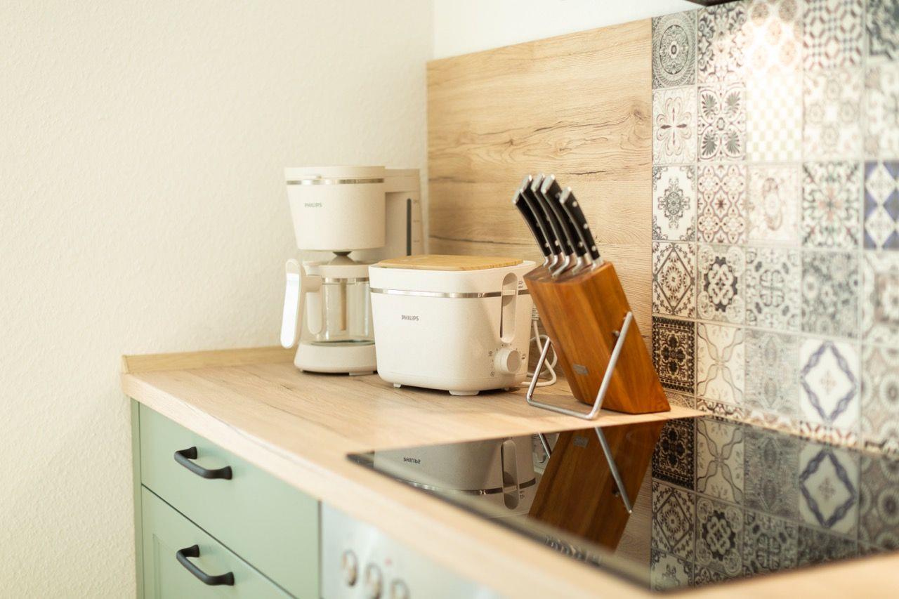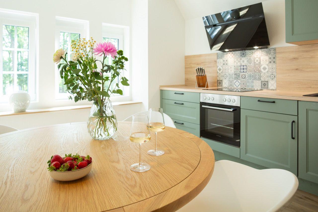 Die Küche ist voll ausgestattet mit Kühlschrank, Spülmaschine, Herd, Waschbecken, Töpfen, Pfannen, Geschirr, Besteck, Kochuntensilien, und alles, was man zum kochen braucht. Der runde Esstisch steht im Bereich der Küche und bietet Platz für 4 Personen.
