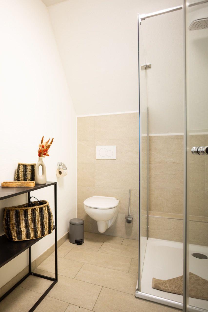 Das Badezimmer bietet eine bodentiefe, extra große Dusche mit Regenduschkopf.