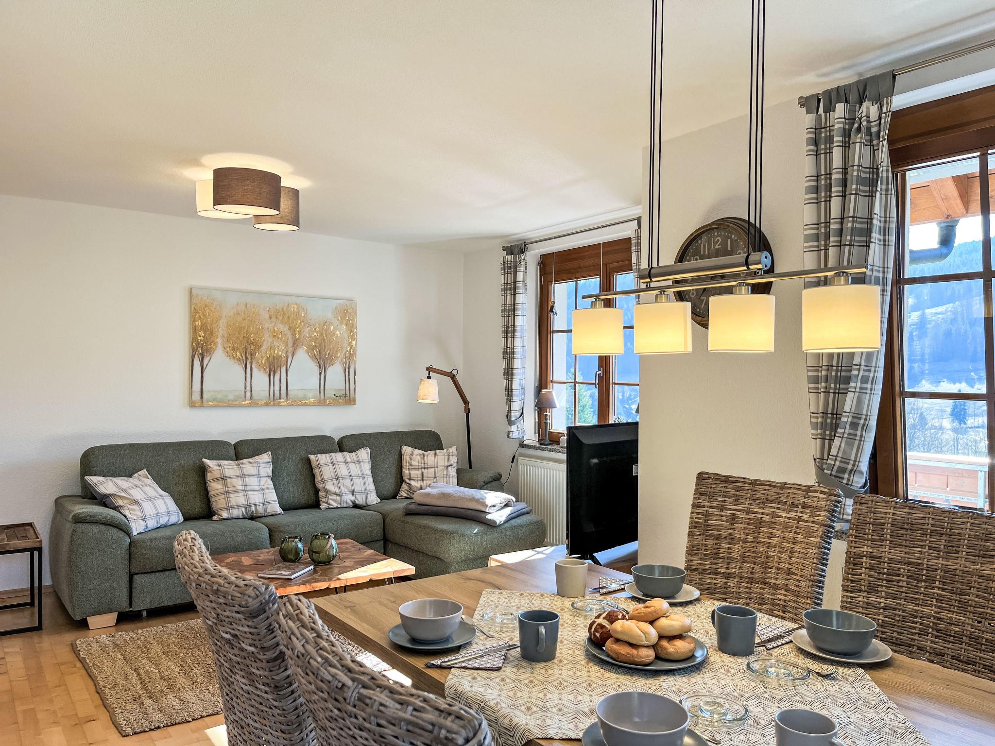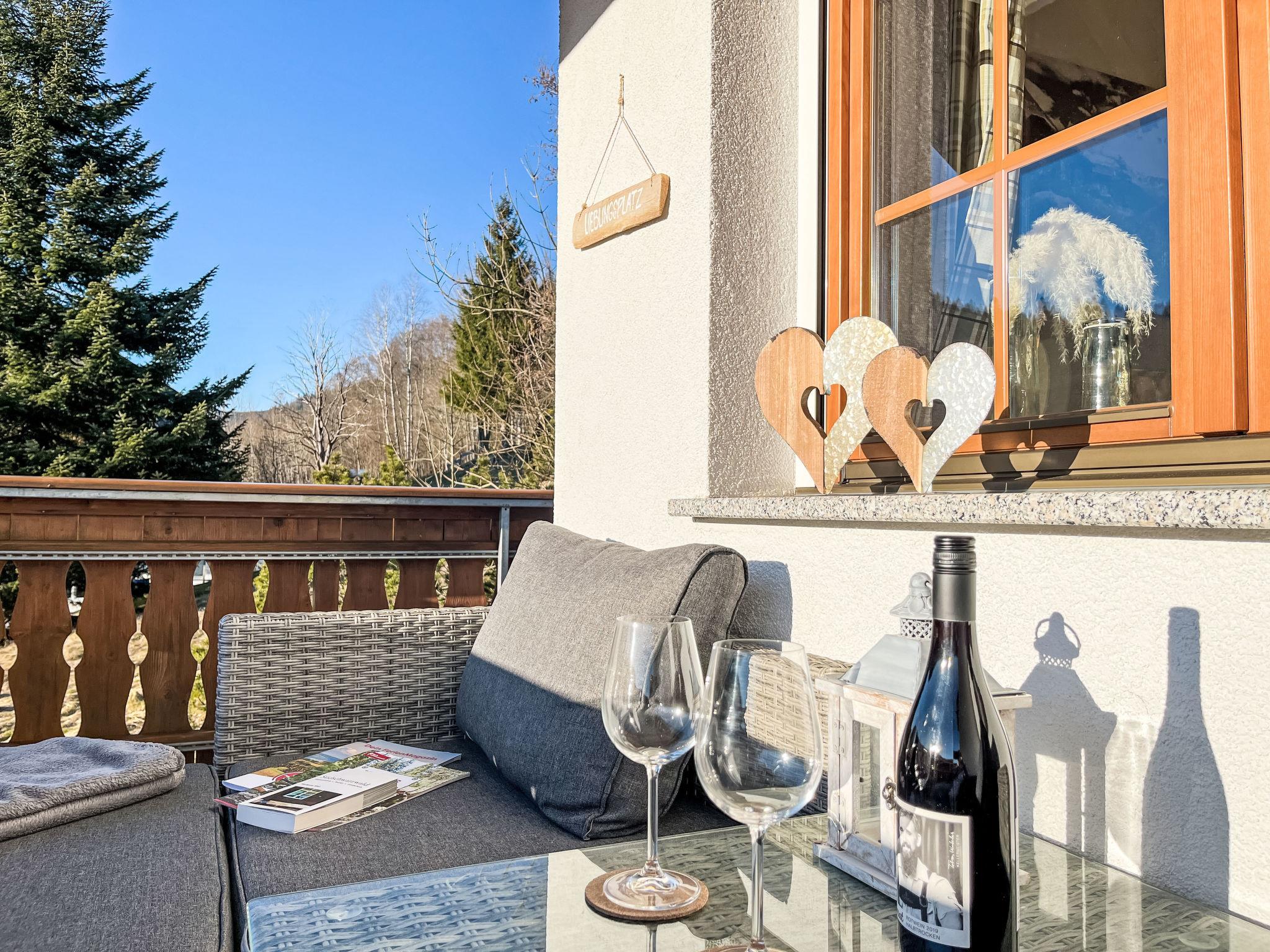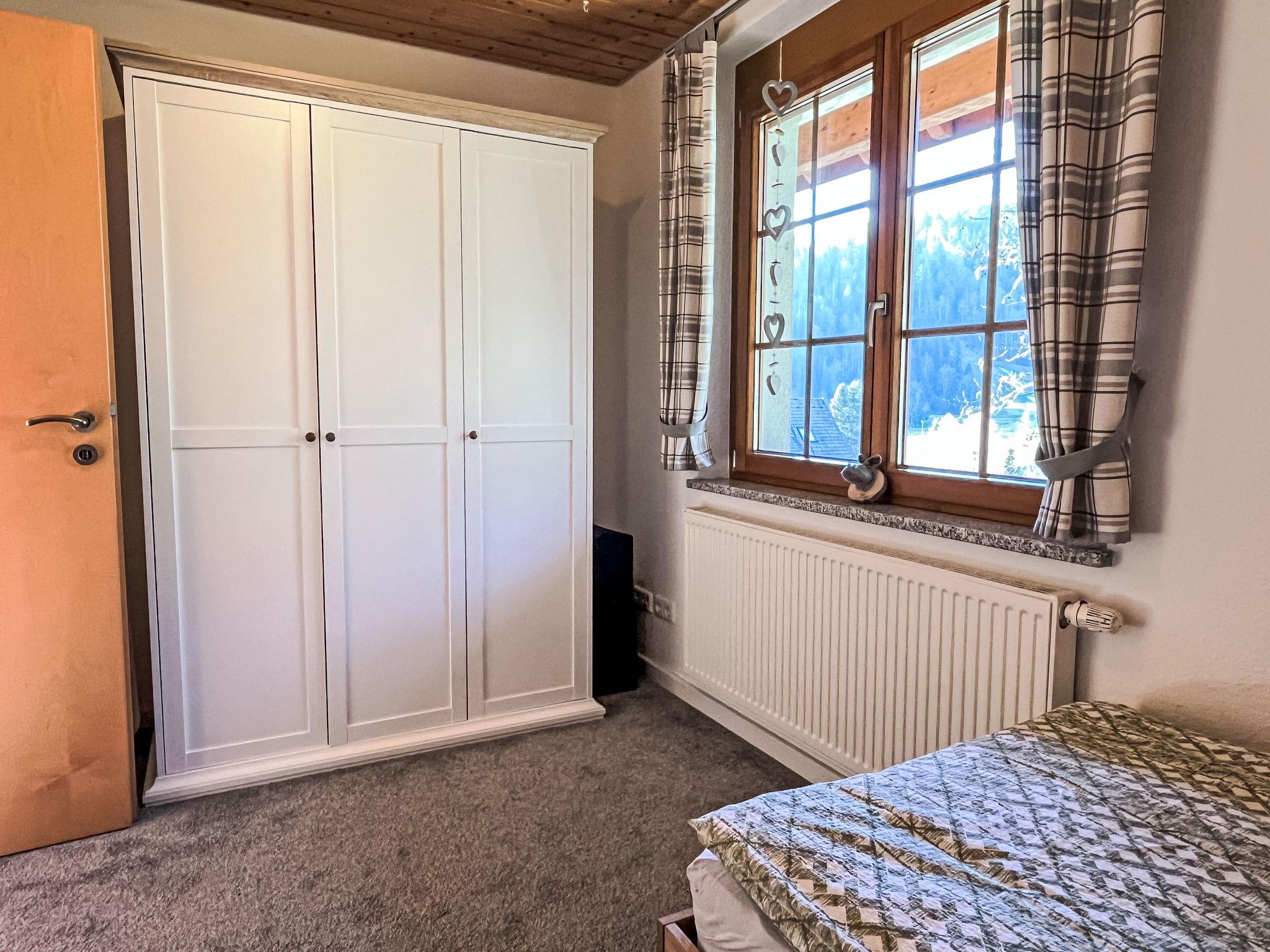 "Kleine Auszeit", 3-room apartment 90 m2, on the upper floor. Spacious and bright, renovated in 2019, modern and cosy furnishings: entrance hall. Living/dining room with dining table and satellite TV (flat screen), DVD. Exit to the balcony. Open kitchen (oven, dishwasher, 4 ceramic glass hob hotplates, toaster, kettle, electric coffee machine). Shower/WC. Heating. Upper floor: 1 large room with 1 double bed (160 cm, length 200 cm). 1 room with 2 beds (80 cm, length 200 cm). Bath/WC with corner bath. Underfloor heating. Large balcony, south-west facing position. Balcony furniture, electric barbecue (portable), box-room. Marvellous view of the mountains, the valley, the ski run and the resort. Facilities: children's high chair, baby cot for up to 2 year olds, hair dryer. Internet (WiFi, free). Parking (1 car), garage (1 car) at the house. Please note: non-smokers only. Private entrance, smoke alarm, fire extinguisher, no lift.