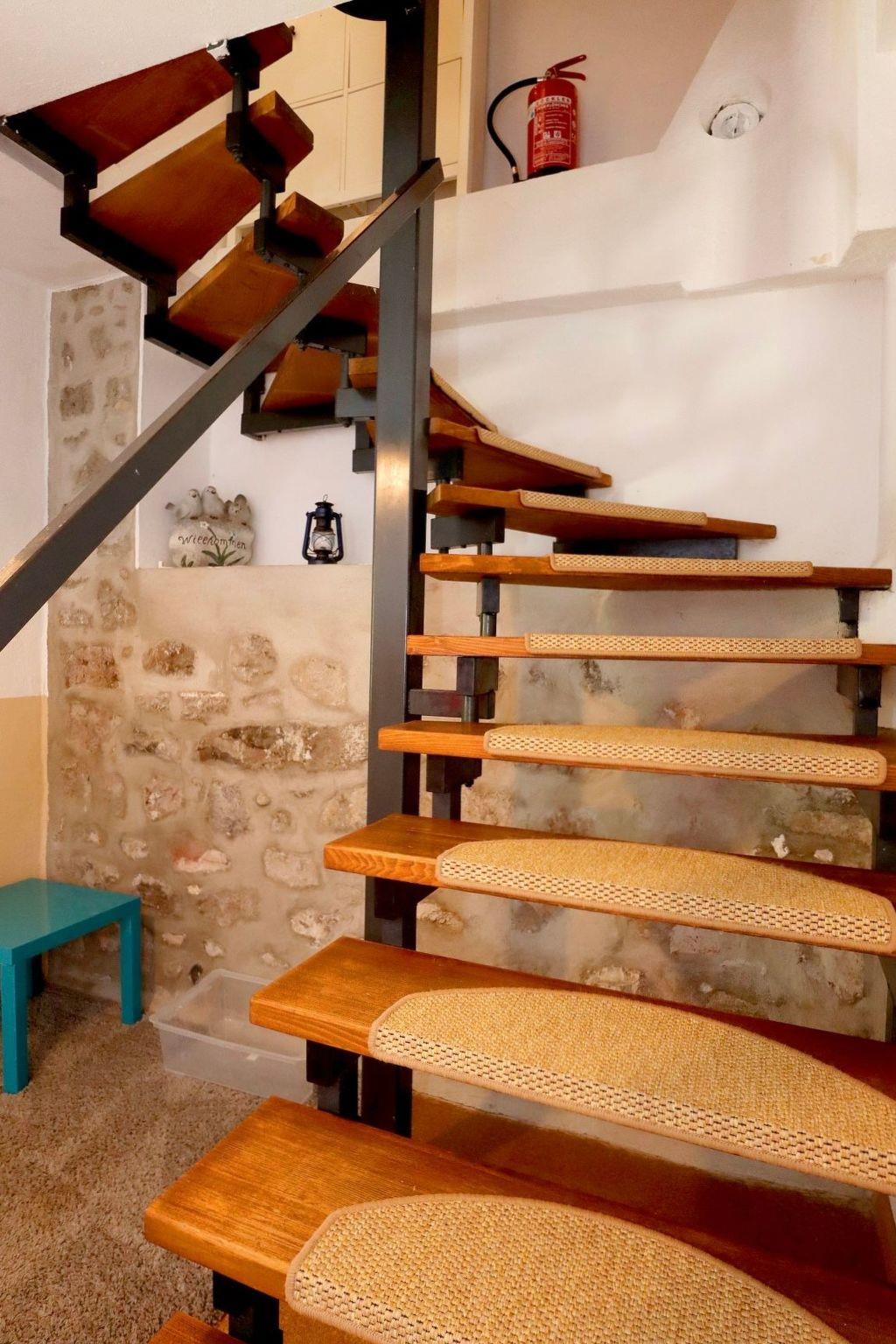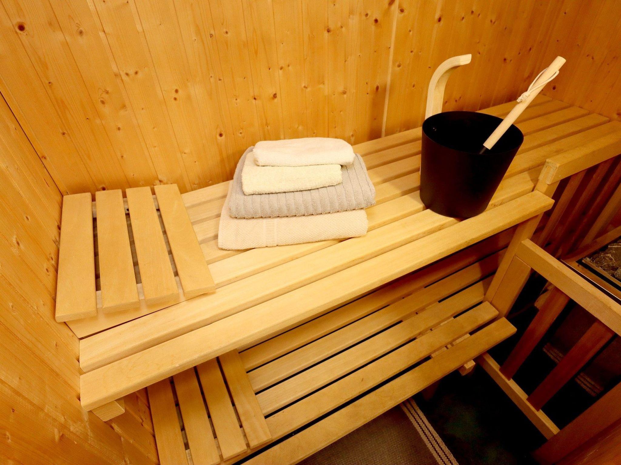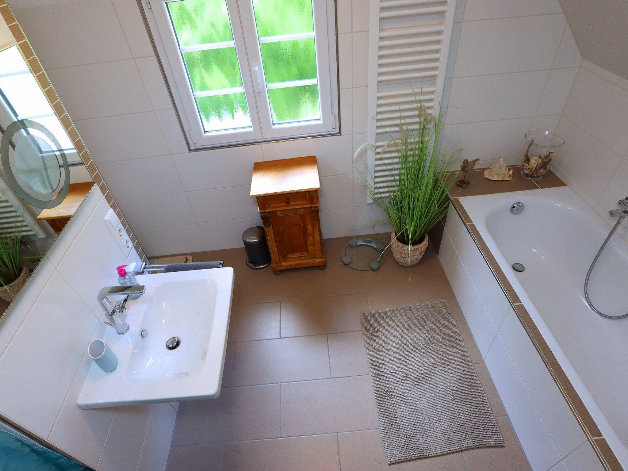 Upstairs there are two bedrooms and a children's room, and a large, modern bathroom with washbasin, toilet, bathtub and walk-in shower.
