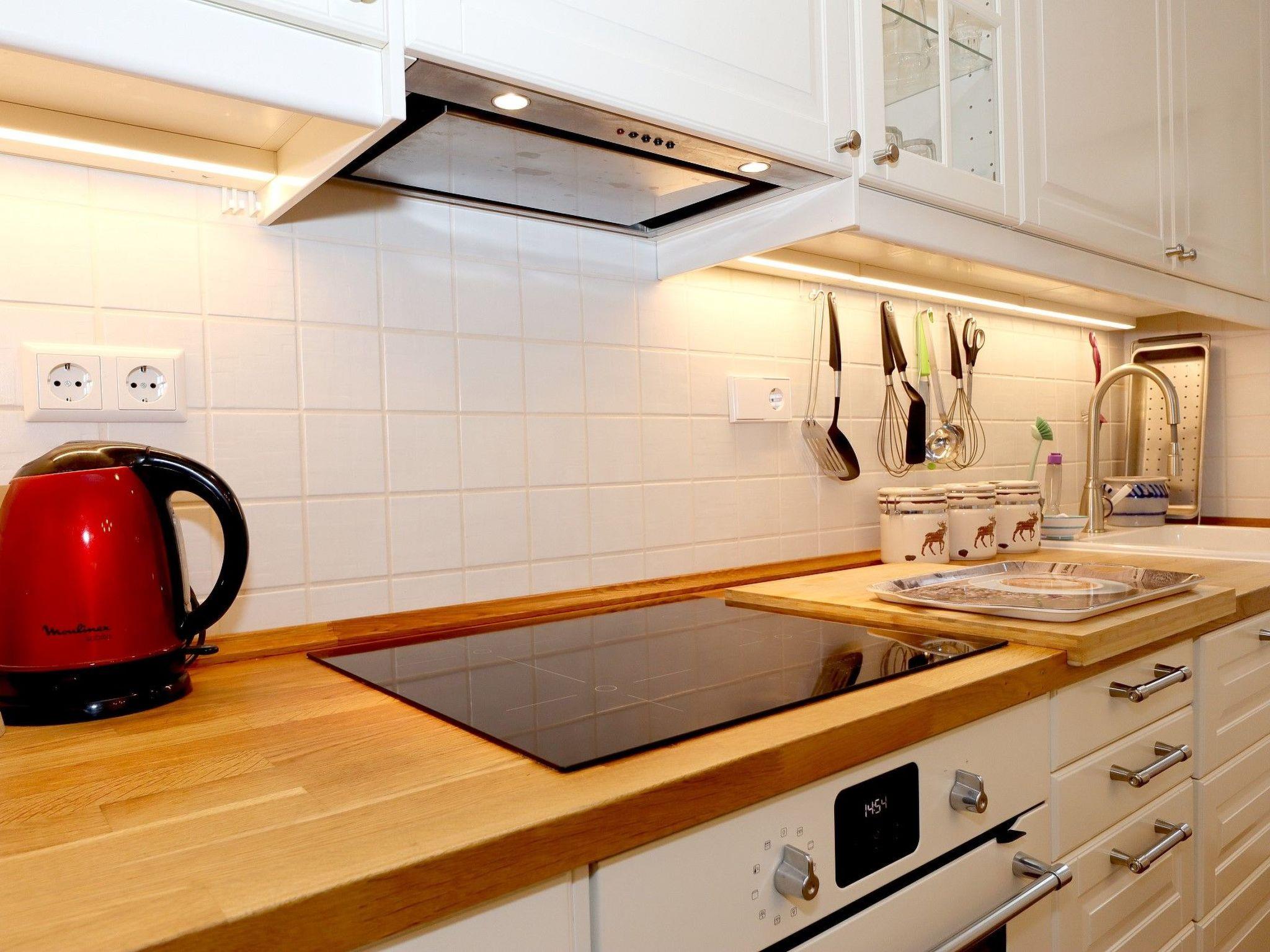 You enter the house via a loggia and arrive in the entrance area - you will recognise immediately - old meets modern! The light grey tiles in the hallway blend in perfectly with the style of the house, as does the eat-in kitchen. The living and dining room has oak parquet flooring, while the extravagant tiled stove (connected to the central heating) brings a cosy atmosphere in the colder months.