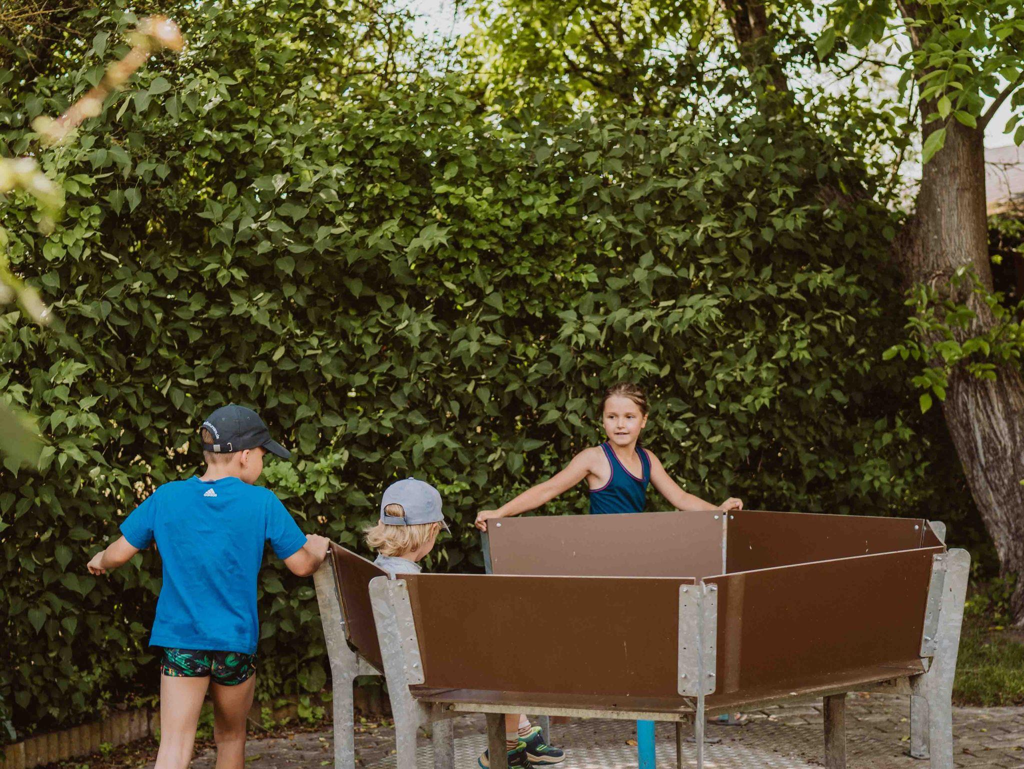 Wippen, Schaukel, Rutsche und Spielhaus sowie Bobby-Car und Tretbulldog stehen bereit.